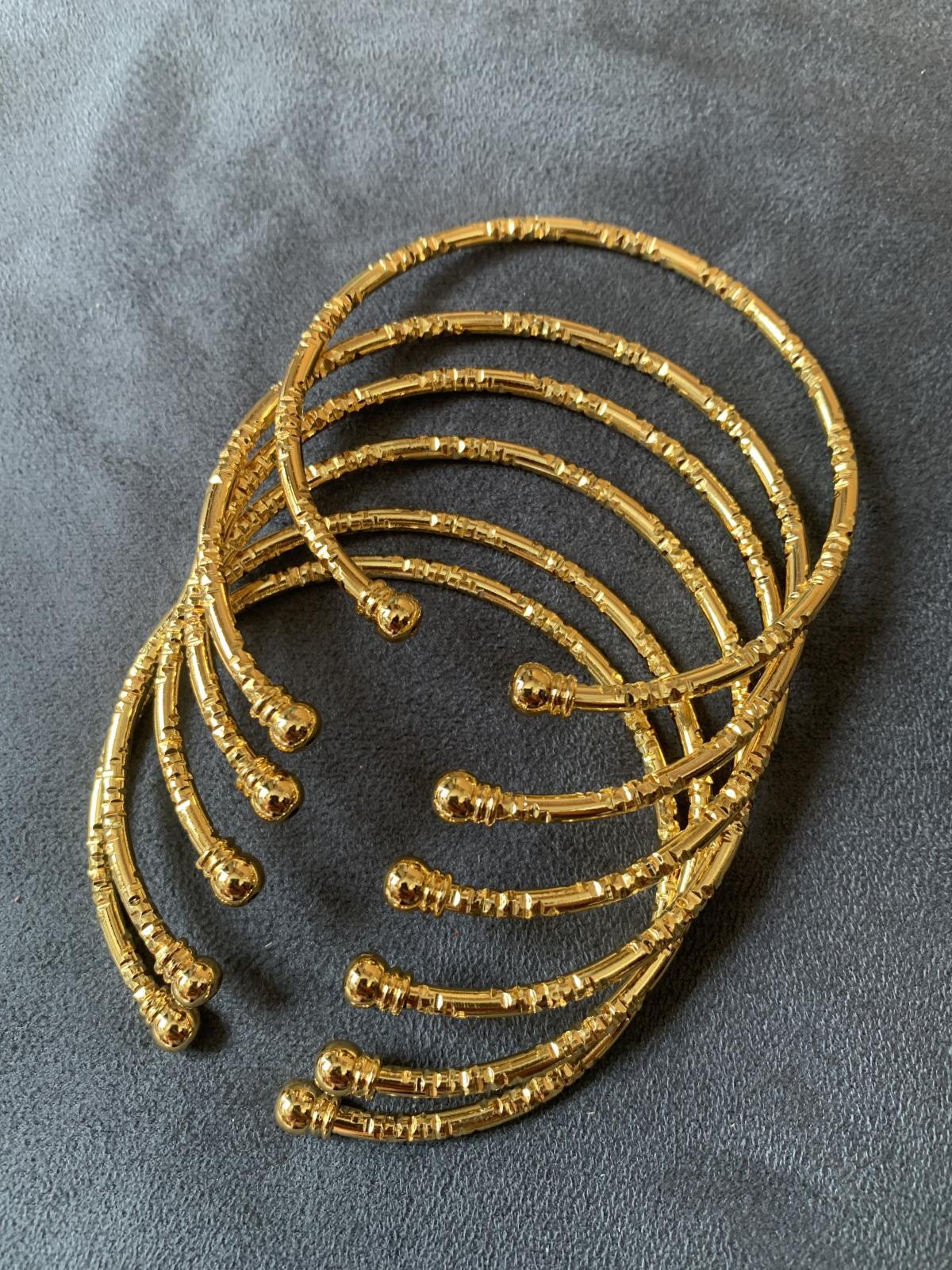 アラブ女性にとって身につける宝飾品はとても大切な財産です!こちらは本物の金・銀ではありませんが、シンプルなアラブスタイルのC型タイプのバングル6セット商品です オリエンタル、バラディ、その他フォークロアにも取り入れやすいシンプルさで幅広くご使用いただけます。また こちらはC型バングルですのでサイズ調整可!着用後、キュッと閉められるので手が小さい方でもご安心してお使いいただけます。 ■C型タイプのバングル6セット■サイズ・フリー■カラー:ゴールドorシルバー■その他・金属アレルギーの方はご注意ください