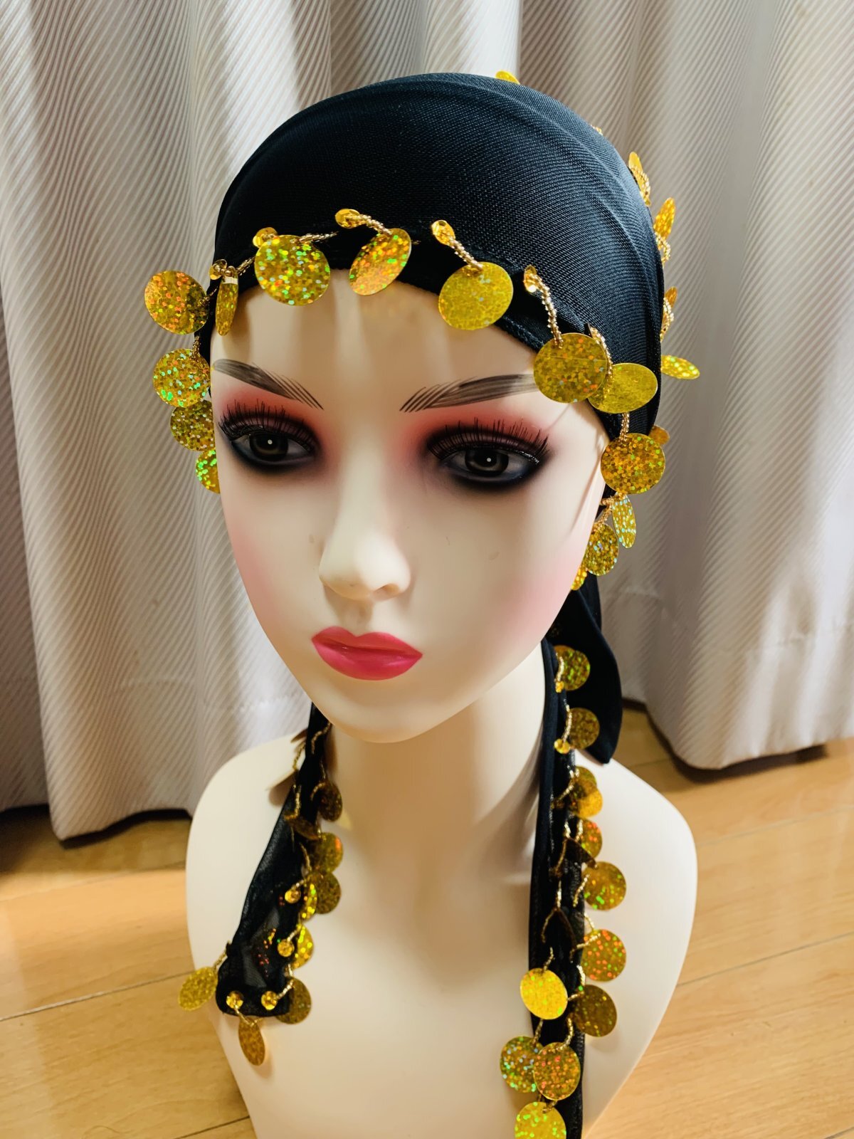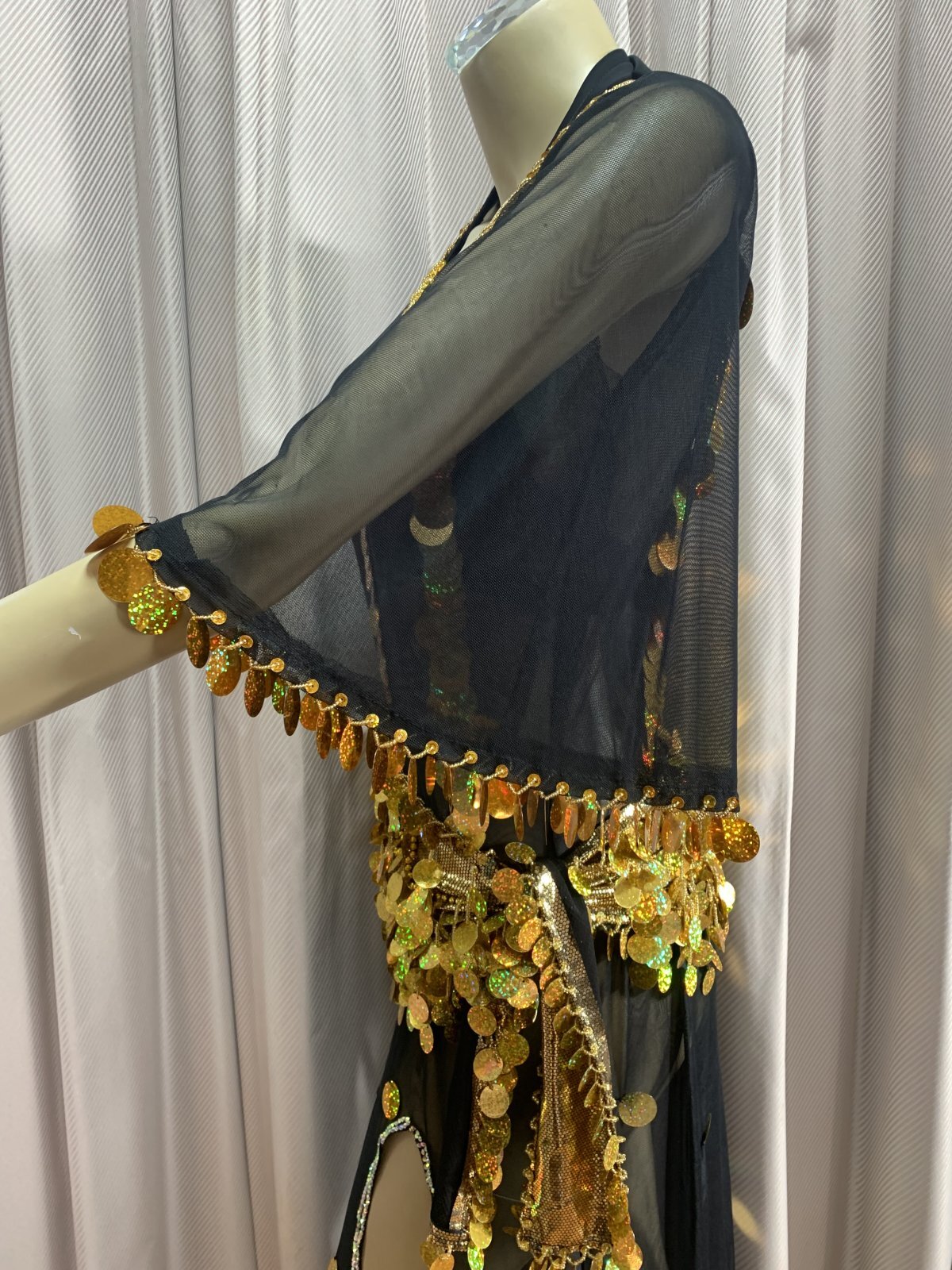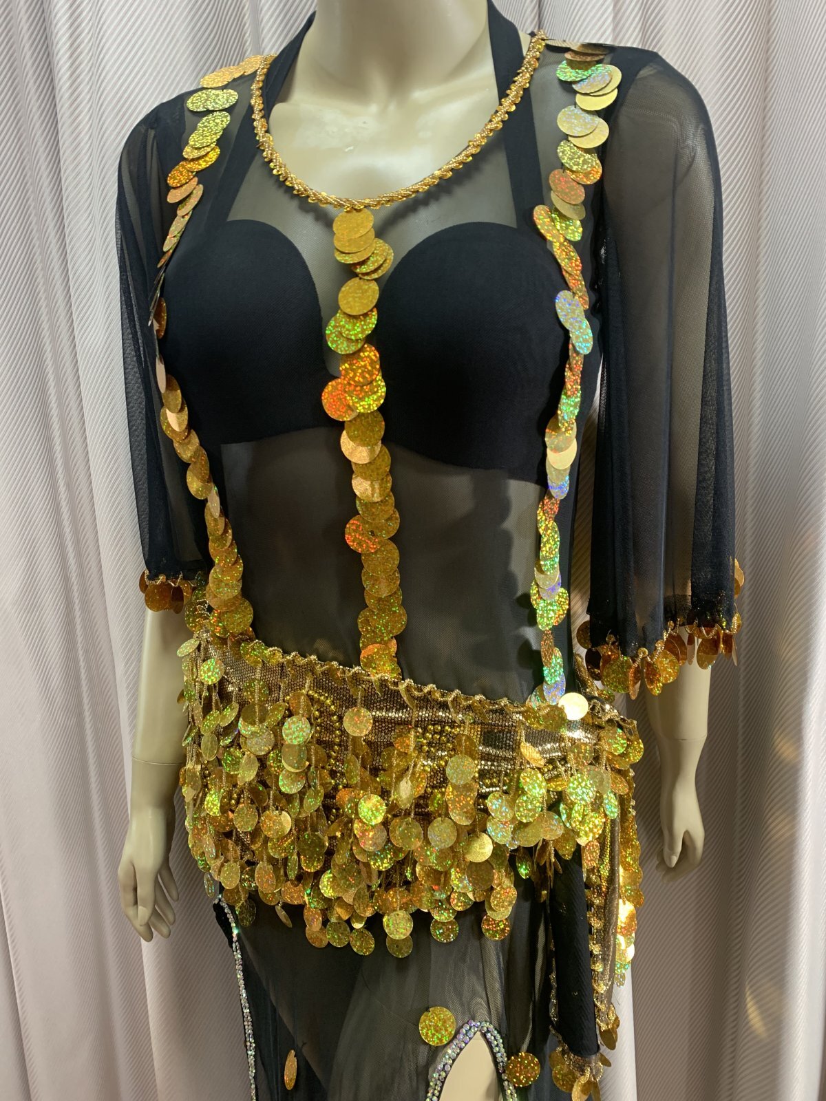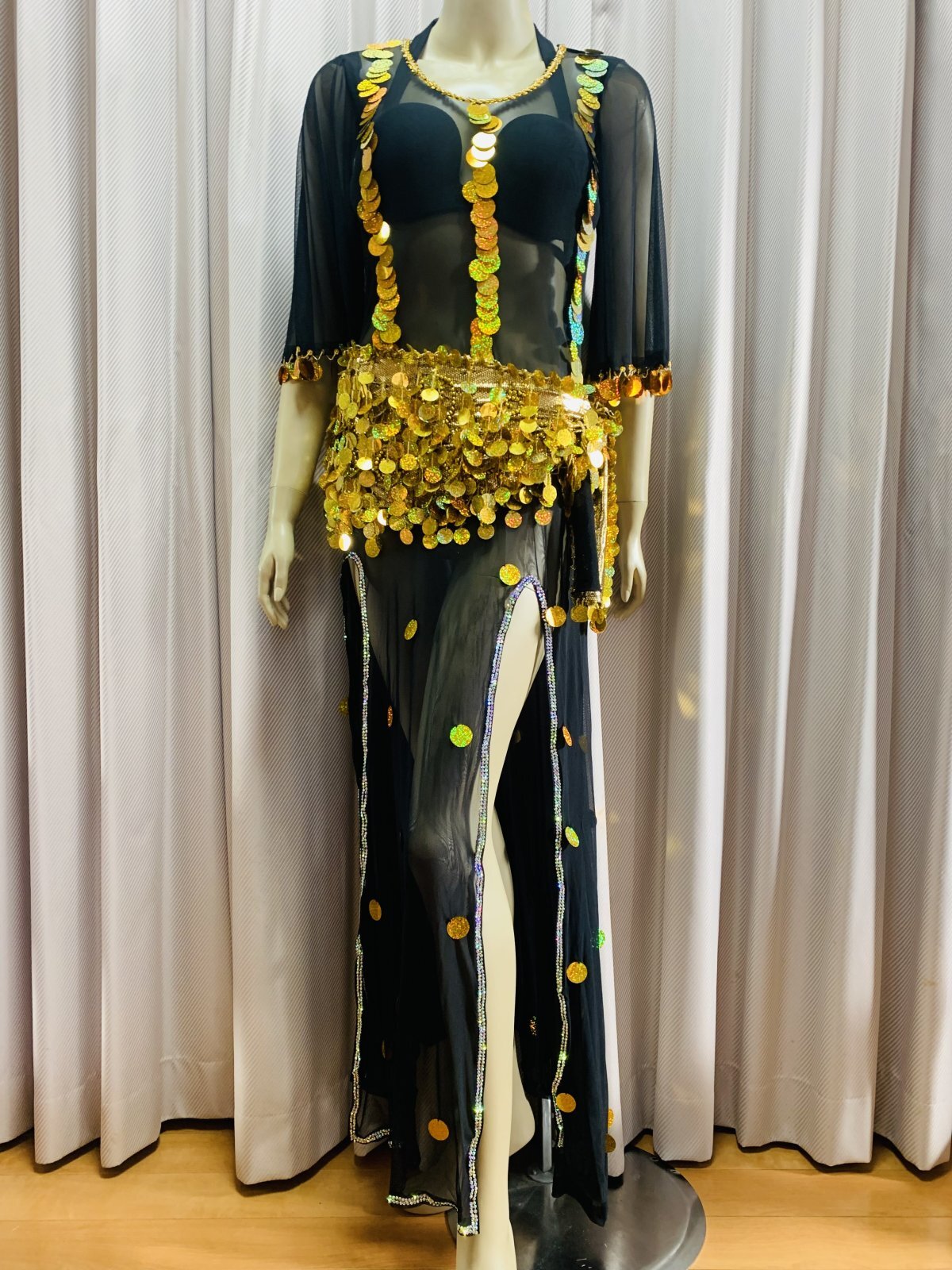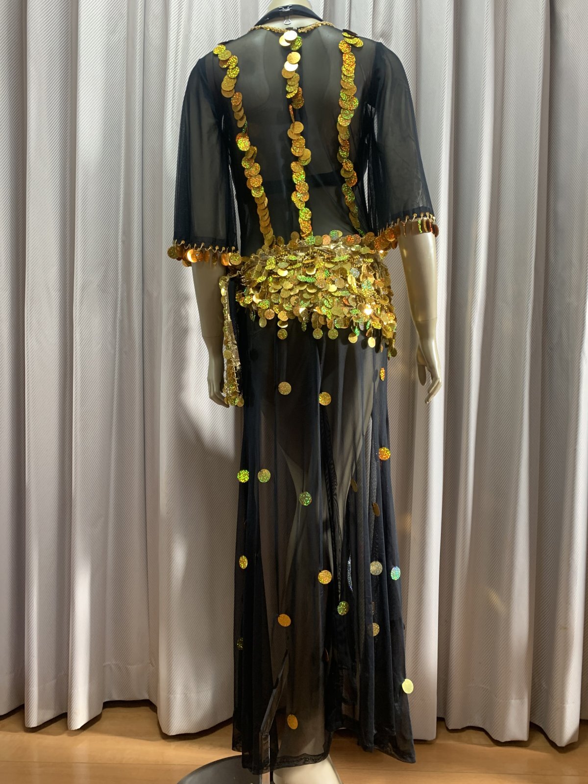 シャマダンやアワーレムの演目におすすめのパワーネットのワンピースドレス。お袖は可愛らしく広がるフレアスリーブに!こちらはレジェンドダンサーのタヒア・カリオカが映画で着用していたドレスをもとにオマージュしたデザインになります。(動画参照)パワーネットを用いているため、とても軽量で伸縮性にも優れたワンピースに仕上がっております。ドレスと同じカラーのブラカップ、アンダーショーツ、ヘッドバンドそして、着回ししやすいゴールドのヒップスカーフが付属されています。 ■商品名:シャマダン・アワーレムパワーネットワンピースドレス ■カラーカラー:ブラックスパンコール、ビーズ:ゴールド■ドレスのサイズ・丈:平置き約135cm・身幅:約40cm※伸縮性があります・ブラカップ:B〜Eカップ ※パット入り ■付属品・ヘッドスカーフ・ブラカップ・アンダーショーツ・ヒップスカーフ ■その他 ・群舞でご使用の場合はオーダーも承ります(基本、5着以上からお願いしておりますが、要相談)