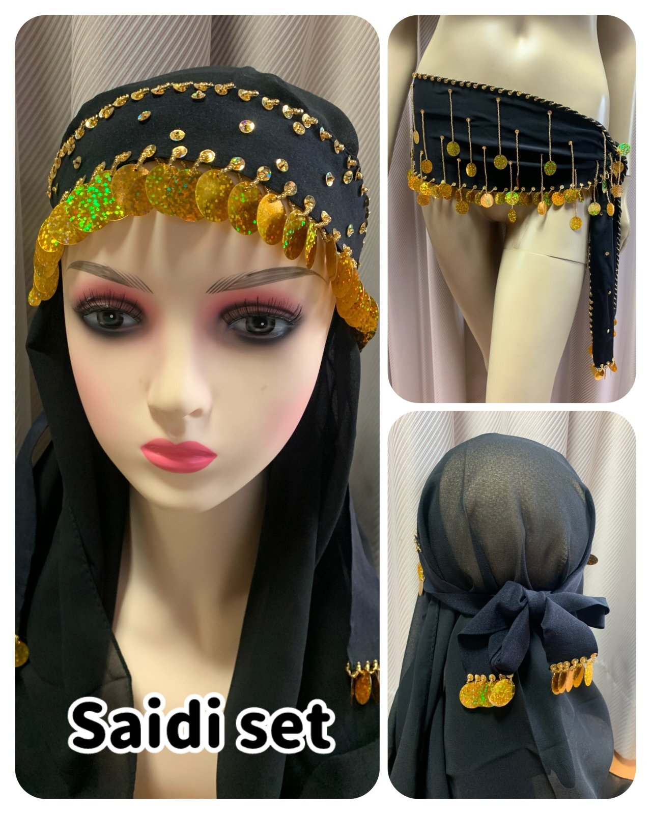 サイーディやガワージーの衣装に合わせてお使いいただける3点セットをご用意しました。ヒップスカーフの他、ヘッドバンドとヘッドベールがセットになっていますのでお手持ちのサイーディやガワージー衣装に合わせてご使用ください。※ヘッドバンドとベールは縫い付けてありますのでそのままお使いいただけます ■商品名:サイーディ、ガワージー用3点セット■カラー・ブラック×ゴールド■付属品・ヘッドバンド・ヒップスカーフ・シフォンベール ■その他・1点1点ハンドメイドでお作りしておりますので若干、サイズに誤差がある場合もございます。・ベースの生地はストレッチ、ベールはシフォン生地になります