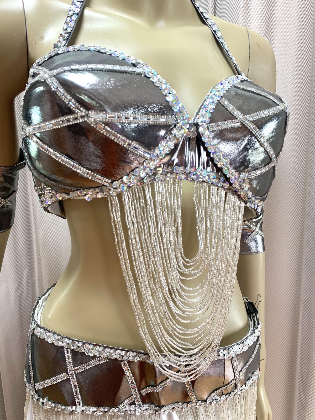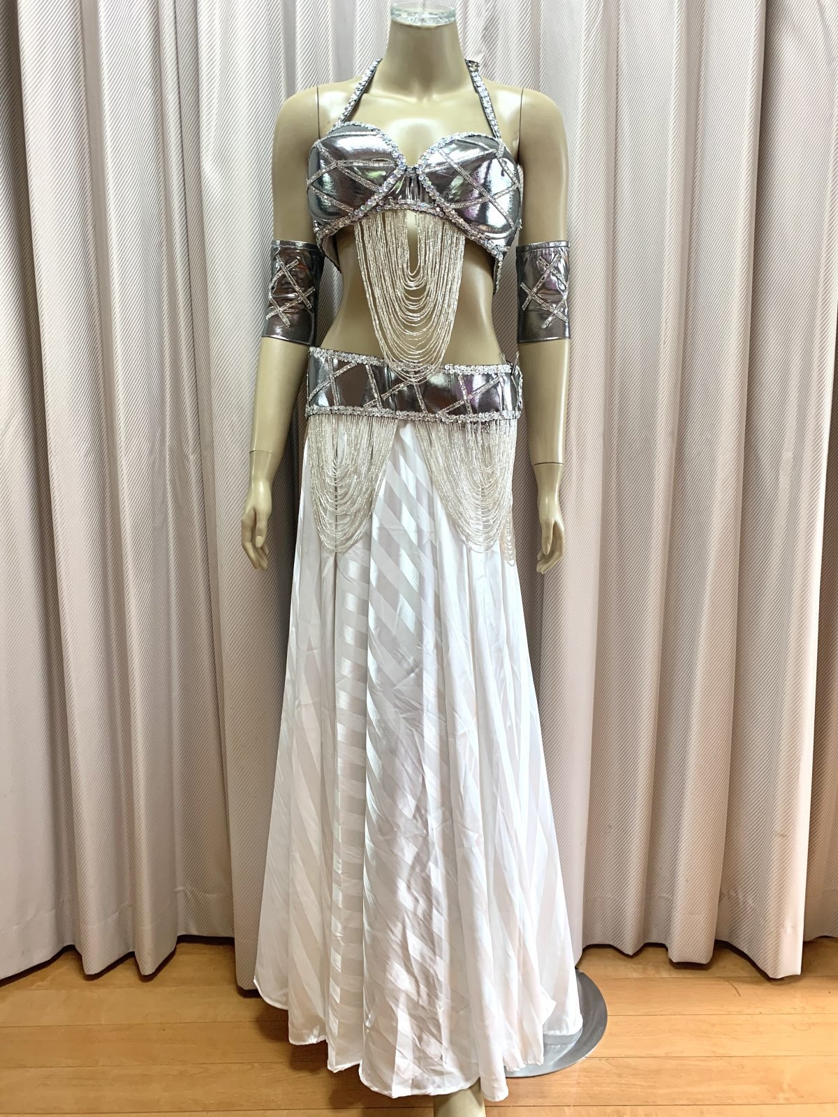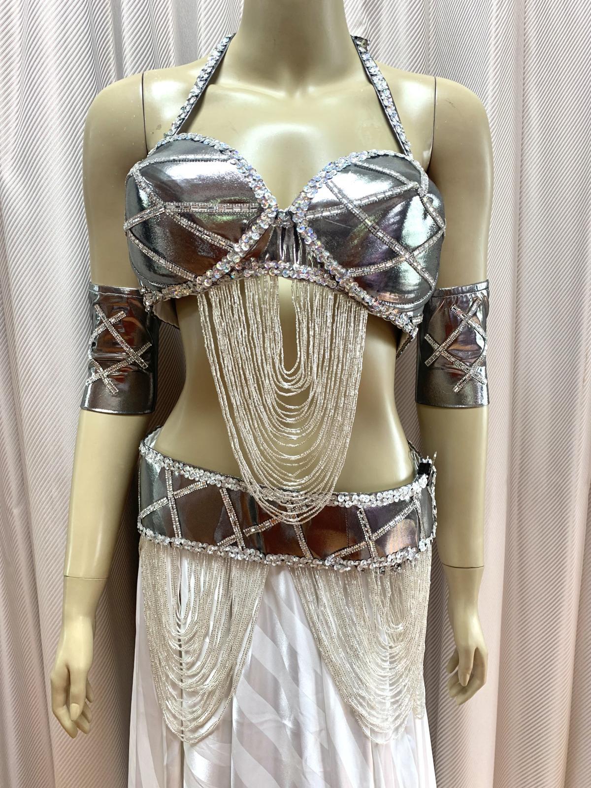 ハニーン特注!ゴールデンエラスタイルコスチューム。ドレープ状に垂れ下がったビーズが特徴的なオールドスタイルに仕上げました。ブラ、ベルトともに軽量!お色はシルバーとゴールドの2カラー展開ですのでほかの衣装との着回しもしやすく、お手持ちのシフォンスカートやダボッとしたハーレムパンツなどとコーディネートするのもおすすめ!スカートと同じ生地の大判ベールもセットになっていますのでスカートにボリュームを出したり、演出に使用したり。。お裁縫が得意な方はお袖を作ったり。。と多様にご使用くださいませ。 ■商品名:ゴールデンエラブラベルトコスチューム(アーム、大判ベール付き)■カラー:シルバー■ブラカップ:M-L(約C〜Fカップ)パット入り※サイズはあくまでも目安になります■アンダーバスト:最長90 ■ショルダーストラップ 最長70cm■バスト正面(右脇から左脇までの長さ):約34cm■ベルト:最長約100cm■スカート丈:フリーサイズゴム、伸縮ありですが、タイトめになります■スカート丈:約100cm※フロント両サイドにスリット入り■付属品:アーム、ベール(200cm×140cm)※スカートと同じ生地■その他・装飾は接着剤で張り付けていますので取り扱いにはご注意ください・スカートのウエスト部分はゴムになります。少し緩めのになりますのでご自分のサイズに調整をお願いいたします。