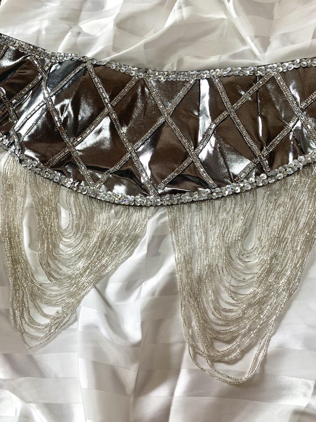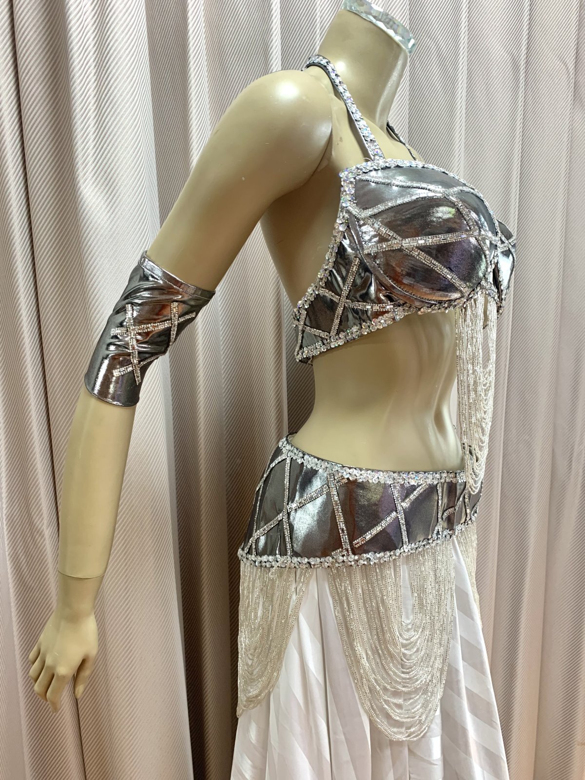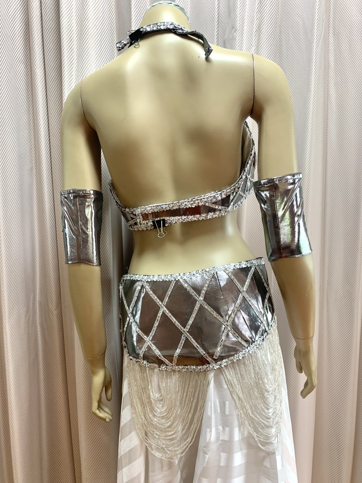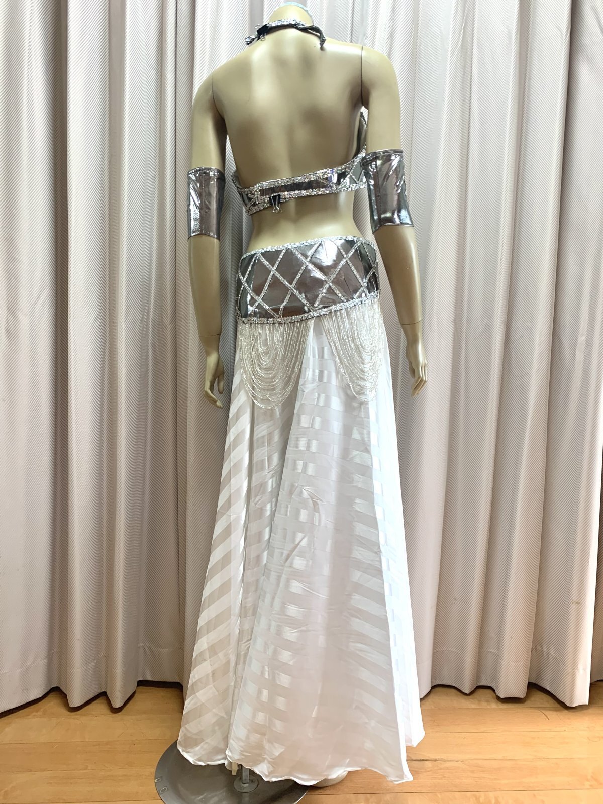 ハニーン特注!ゴールデンエラスタイルコスチューム。ドレープ状に垂れ下がったビーズが特徴的なオールドスタイルに仕上げました。ブラ、ベルトともに軽量!お色はシルバーとゴールドの2カラー展開ですのでほかの衣装との着回しもしやすく、お手持ちのシフォンスカートやダボッとしたハーレムパンツなどとコーディネートするのもおすすめ!スカートと同じ生地の大判ベールもセットになっていますのでスカートにボリュームを出したり、演出に使用したり。。お裁縫が得意な方はお袖を作ったり。。と多様にご使用くださいませ。 ■商品名:ゴールデンエラブラベルトコスチューム(アーム、大判ベール付き)■カラー:シルバー■ブラカップ:M-L(約C〜Fカップ)パット入り※サイズはあくまでも目安になります■アンダーバスト:最長90 ■ショルダーストラップ 最長70cm■バスト正面(右脇から左脇までの長さ):約34cm■ベルト:最長約100cm■スカート丈:フリーサイズゴム、伸縮ありですが、タイトめになります■スカート丈:約100cm※フロント両サイドにスリット入り■付属品:アーム、ベール(200cm×140cm)※スカートと同じ生地■その他・装飾は接着剤で張り付けていますので取り扱いにはご注意ください・スカートのウエスト部分はゴムになります。少し緩めのになりますのでご自分のサイズに調整をお願いいたします。