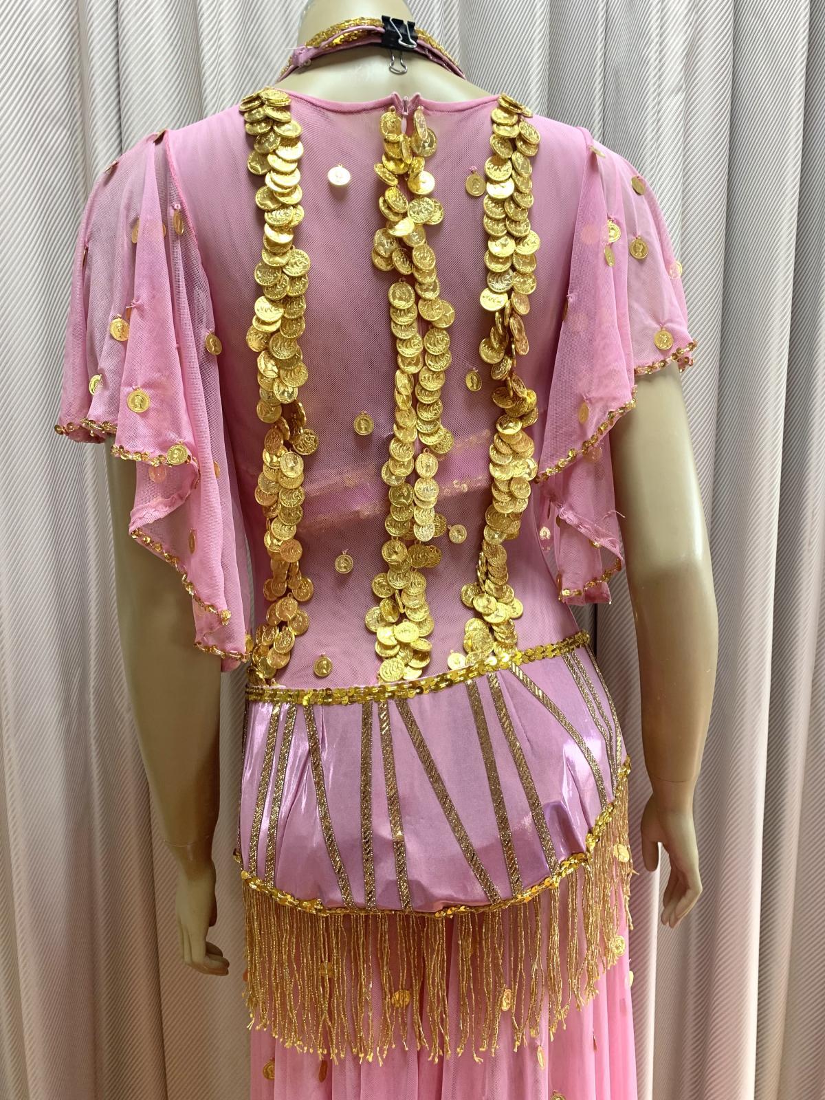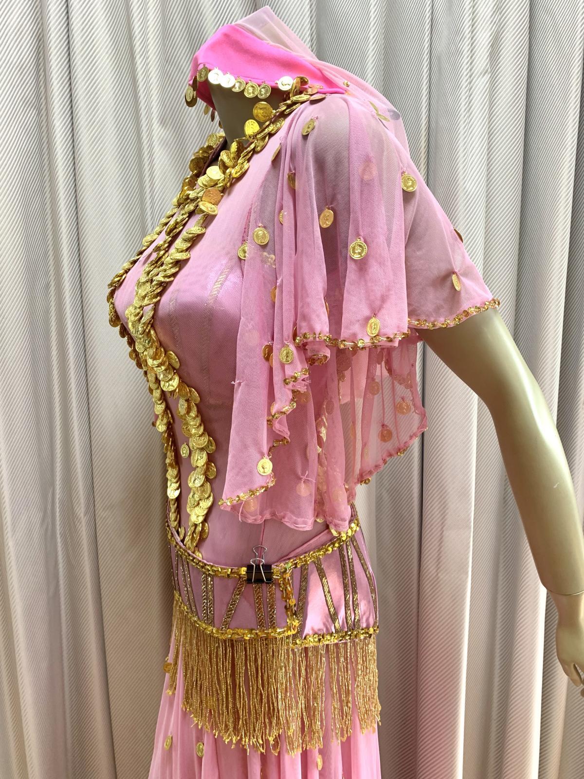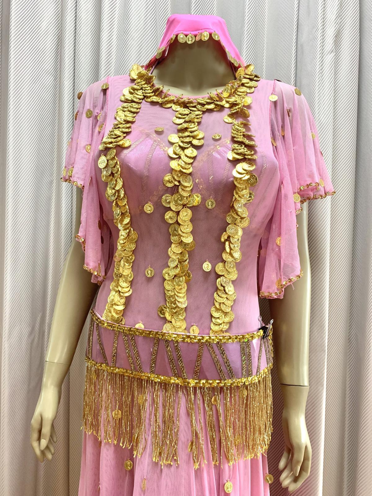 ハニーン特注!ゴールデンエラ時代に活躍したダンサー、タヒア・カリオカやキティなどの衣装をイメージさせるワンピースタイプのコスチュームをお作りしました。オリエンタル(オールドスタイル)、アワーレム、シャマダンなどの演目にご利用いただけ、付属のブラカップとベルトは、お手持ちのスカートなどと合わせて着回しもできる便利な1セットになっています。ショートのヘッドベールも作ってみました!!ぜひゴールデンエラ時代のダンサーのように着こなしてみてくださいね。 装飾に使用したコインは軽量プラスチック製ですのでたっぷりお付けしています。ワンピースは体のラインが美しく見えるウエスト切り替え、スカートは透けない2枚構造で、ターンをした時に広がるシルエットに!! サイズ等、お質問がありましたらお問い合わせフォームからご連絡ください! ■商品名:ゴールデンエラブラベルト付きワンピースコスチューム■カラー:ピンク■ワンピース丈:140cm(股下約80cm)※ワンピと一体型のインナーパンツ付き■ブラカップ:M-L(約C〜Fカップ)パット入り※サイズはあくまでも目安になります■アンダーバスト:最長90 ■ショルダーストラップ 最長70cm■バスト正面(右脇から左脇までの長さ):約34cm■ベルト:最長約100cm■スカート丈:約100cm※フロント両サイドにスリット入り■付属品:ショートヘッドベール■その他・インナーパンツはワンピースと一体型になります。・トップとスカート部分が切り替えになったフレアワンピースになります。・ワンピースの背中に大きく開くファスナー付き。・ワンピースはバスト90cm、ウエスト70cm、ヒップ98cmの目安で仕立てています(伸縮あり)・スカート部分は2枚仕立てですので透け感を抑えています。