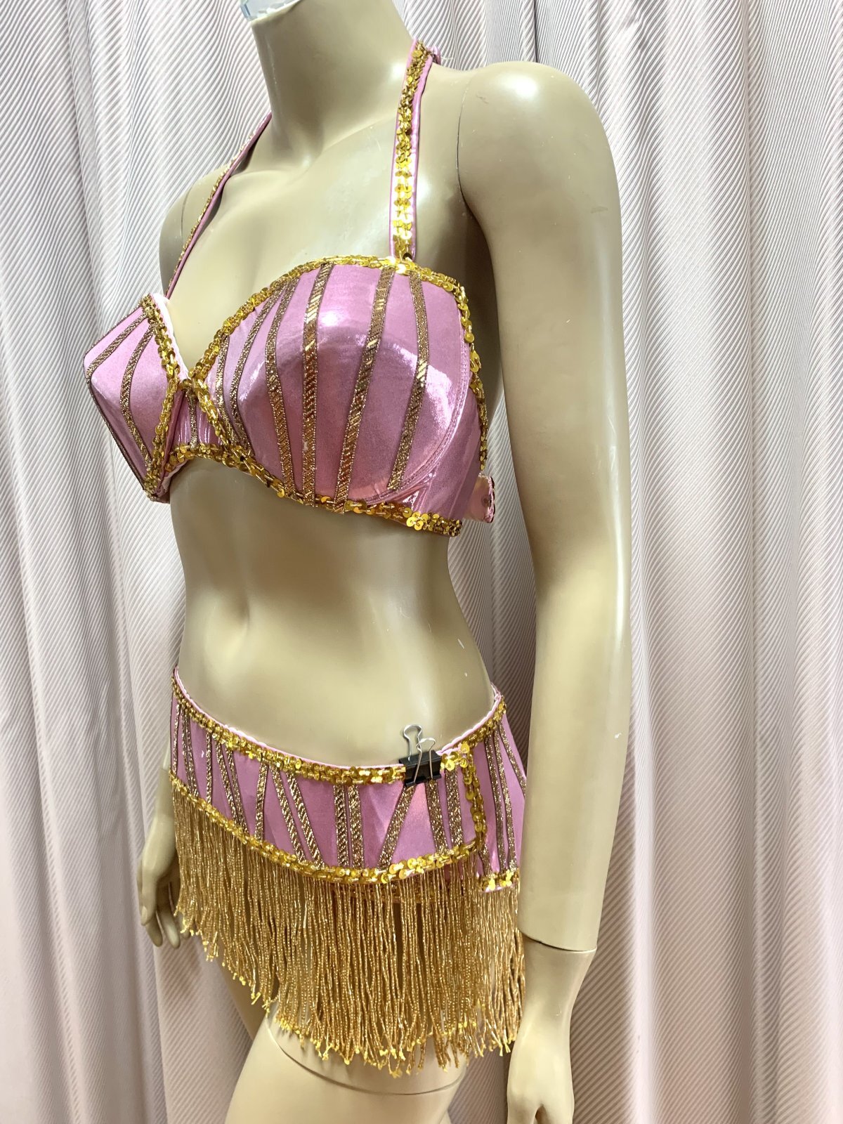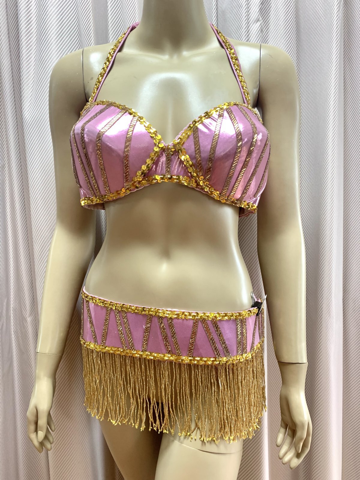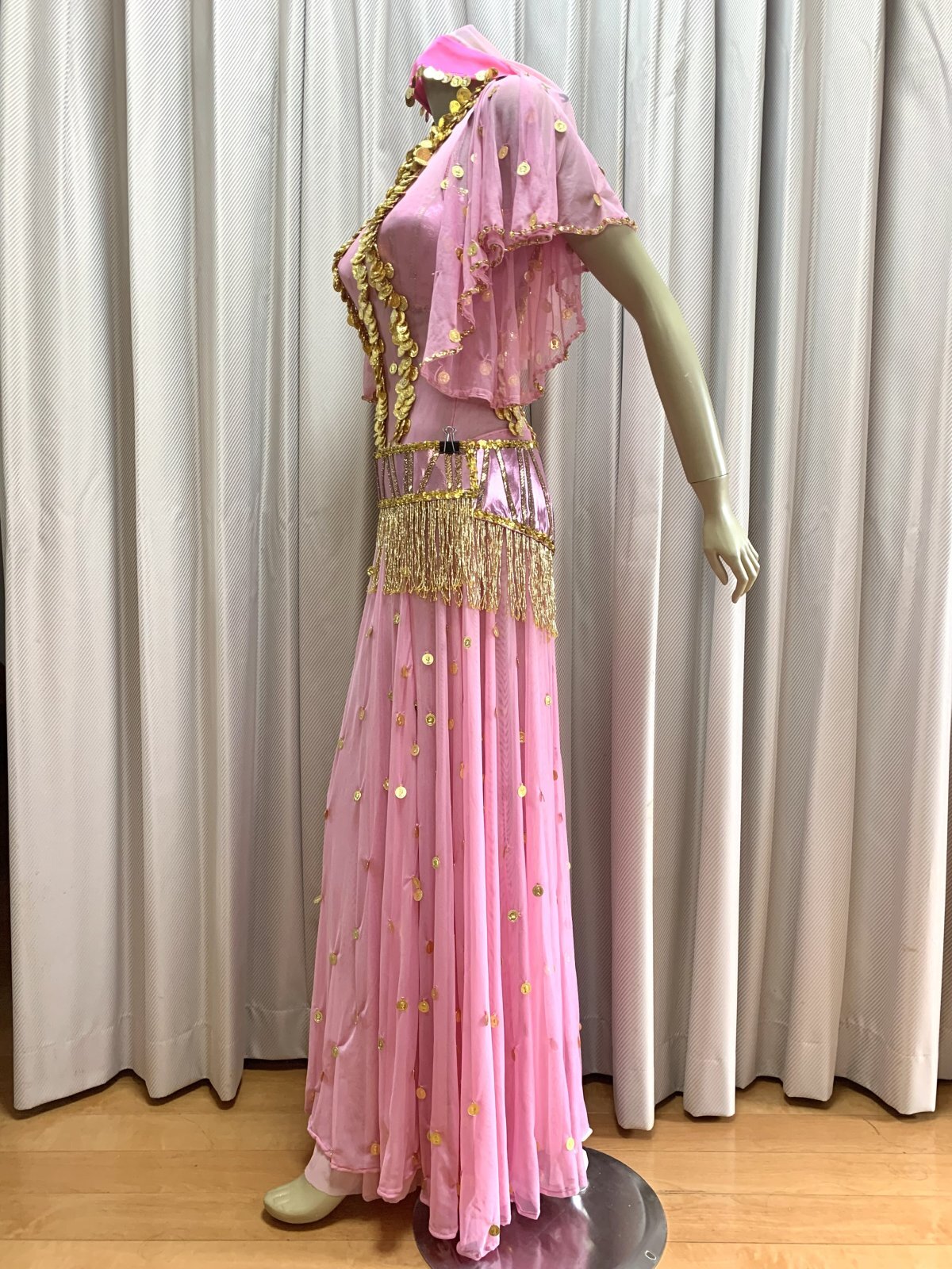 ハニーン特注!ゴールデンエラ時代に活躍したダンサー、タヒア・カリオカやキティなどの衣装をイメージさせるワンピースタイプのコスチュームをお作りしました。オリエンタル(オールドスタイル)、アワーレム、シャマダンなどの演目にご利用いただけ、付属のブラカップとベルトは、お手持ちのスカートなどと合わせて着回しもできる便利な1セットになっています。ショートのヘッドベールも作ってみました!!ぜひゴールデンエラ時代のダンサーのように着こなしてみてくださいね。 装飾に使用したコインは軽量プラスチック製ですのでたっぷりお付けしています。ワンピースは体のラインが美しく見えるウエスト切り替え、スカートは透けない2枚構造で、ターンをした時に広がるシルエットに!! サイズ等、お質問がありましたらお問い合わせフォームからご連絡ください! ■商品名:ゴールデンエラブラベルト付きワンピースコスチューム■カラー:ピンク■ワンピース丈:140cm(股下約80cm)※ワンピと一体型のインナーパンツ付き■ブラカップ:M-L(約C〜Fカップ)パット入り※サイズはあくまでも目安になります■アンダーバスト:最長90 ■ショルダーストラップ 最長70cm■バスト正面(右脇から左脇までの長さ):約34cm■ベルト:最長約100cm■スカート丈:約100cm※フロント両サイドにスリット入り■付属品:ショートヘッドベール■その他・インナーパンツはワンピースと一体型になります。・トップとスカート部分が切り替えになったフレアワンピースになります。・ワンピースの背中に大きく開くファスナー付き。・ワンピースはバスト90cm、ウエスト70cm、ヒップ98cmの目安で仕立てています(伸縮あり)・スカート部分は2枚仕立てですので透け感を抑えています。