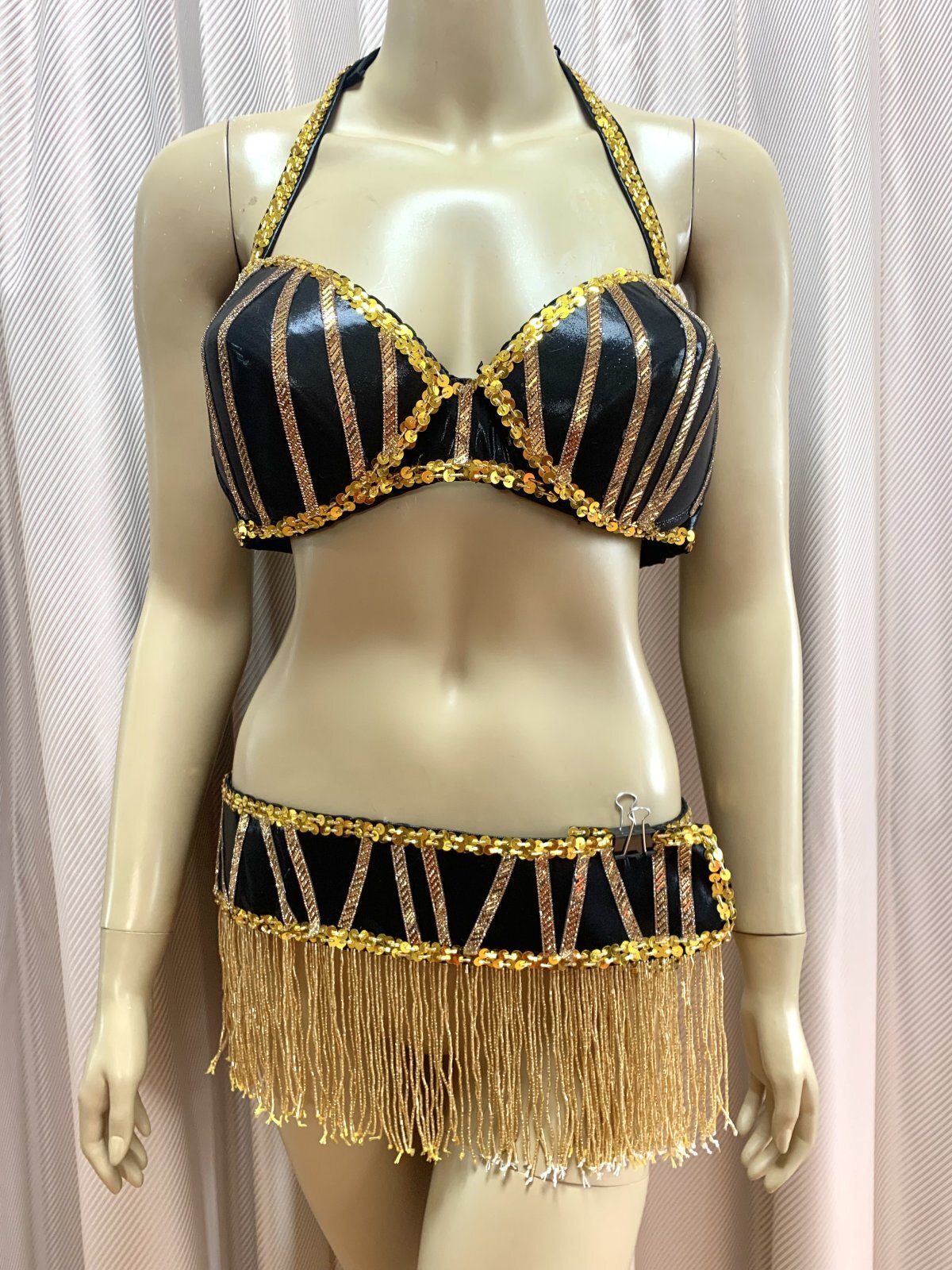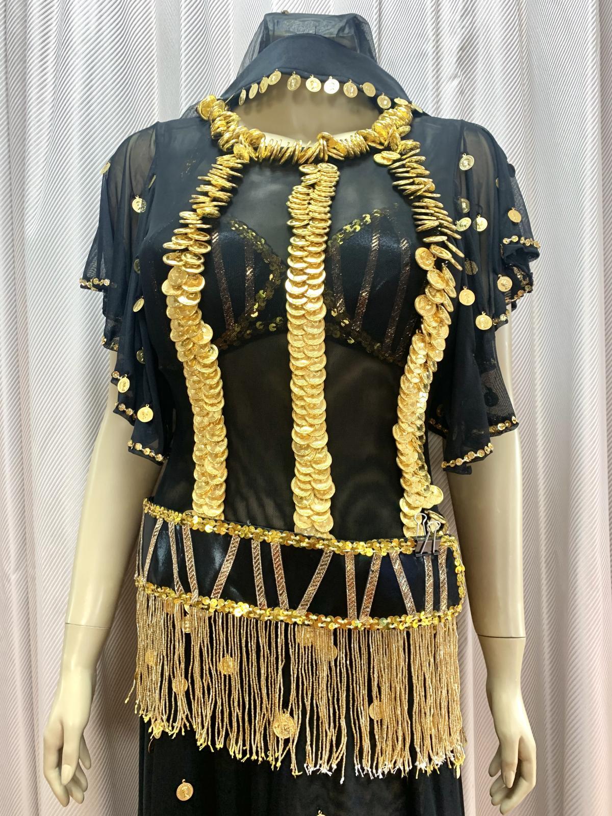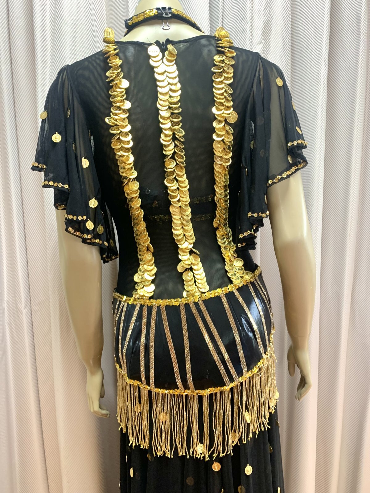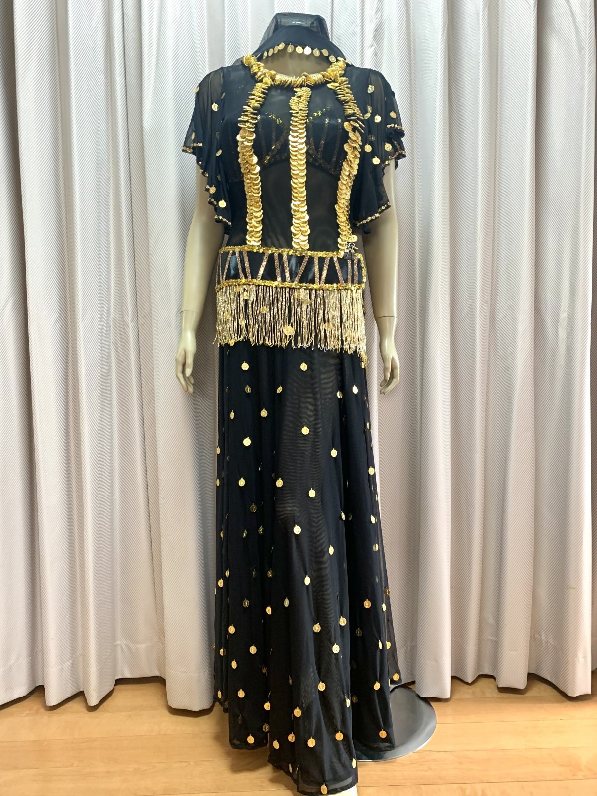 ハニーン特注!ゴールデンエラ時代に活躍したダンサー、タヒア・カリオカやキティなどの衣装をイメージさせるワンピースタイプのコスチュームをお作りしました。オリエンタル(オールドスタイル)、アワーレム、シャマダンなどの演目にご利用いただけ、付属のブラカップとベルトは、お手持ちのスカートなどと合わせて着回しもできる便利な1セットになっています。ショートのヘッドベールも作ってみました!!ぜひゴールデンエラ時代のダンサーのように着こなしてみてくださいね。 装飾に使用したコインは軽量プラスチック製ですのでたっぷりお付けしています。ワンピースは体のラインが美しく見えるウエスト切り替え、スカートは透けない2枚構造で、ターンをした時に広がるシルエットに!! サイズ等、お質問がありましたらお問い合わせフォームからご連絡ください! ■商品名:ゴールデンエラブラベルト付きワンピースコスチューム■カラー:ブラック■ワンピース丈:140cm(股下約80cm)※ワンピと一体型のインナーパンツ付き■ブラカップ:M-L(約C〜Fカップ)パット入り※サイズはあくまでも目安になります■アンダーバスト:最長90 ■ショルダーストラップ 最長70cm■バスト正面(右脇から左脇までの長さ):約34cm■ベルト:最長約100cm■スカート丈:約100cm※フロント両サイドにスリット入り■付属品:ショートヘッドベール■その他・インナーパンツはワンピースと一体型になります。・トップとスカート部分が切り替えになったフレアワンピースになります。・ワンピースの背中に大きく開くファスナー付き。・ワンピースはバスト90cm、ウエスト70cm、ヒップ98cmの目安で仕立てています(伸縮あり)・スカート部分は2枚仕立てですので透け感を抑えています。