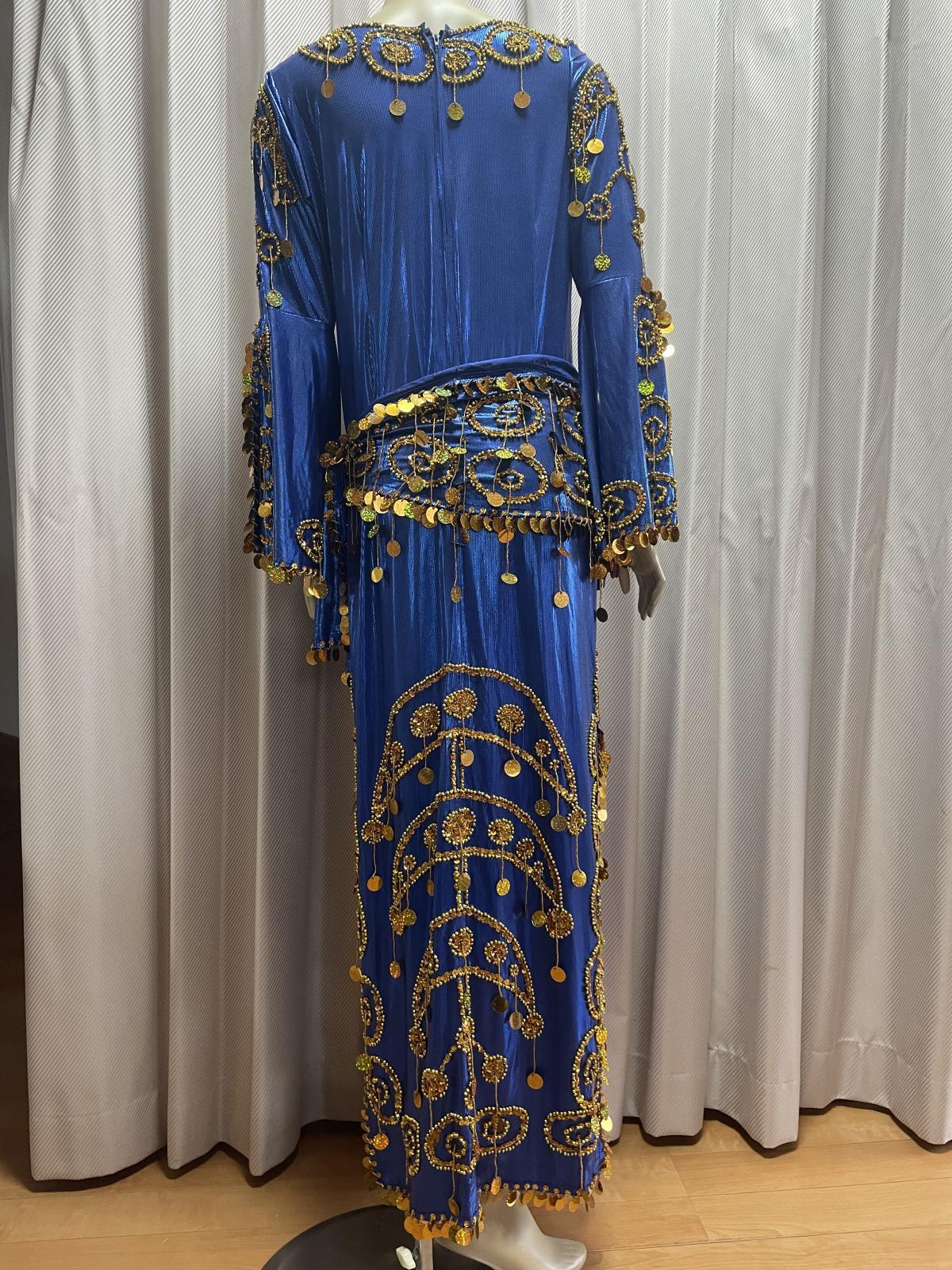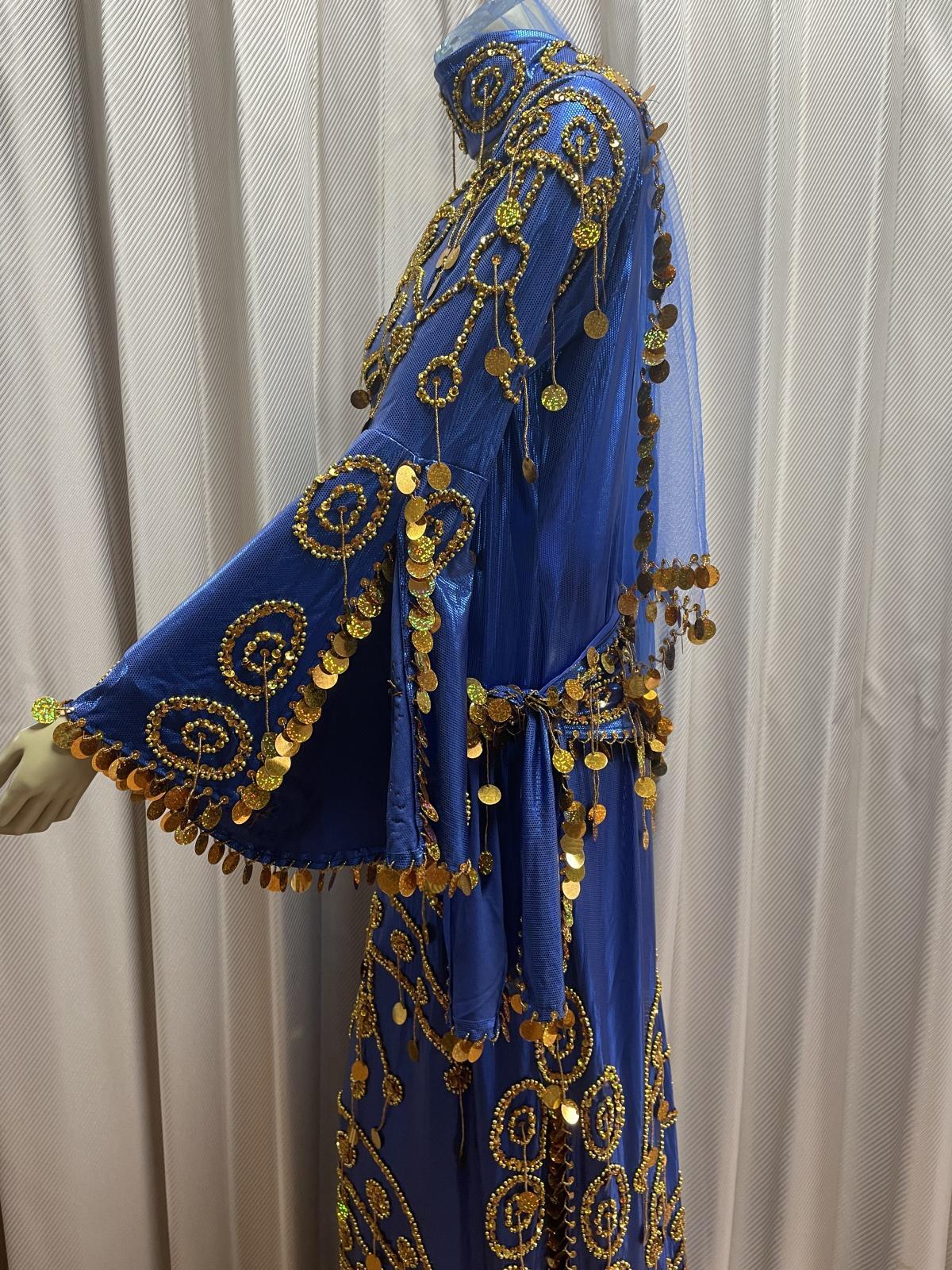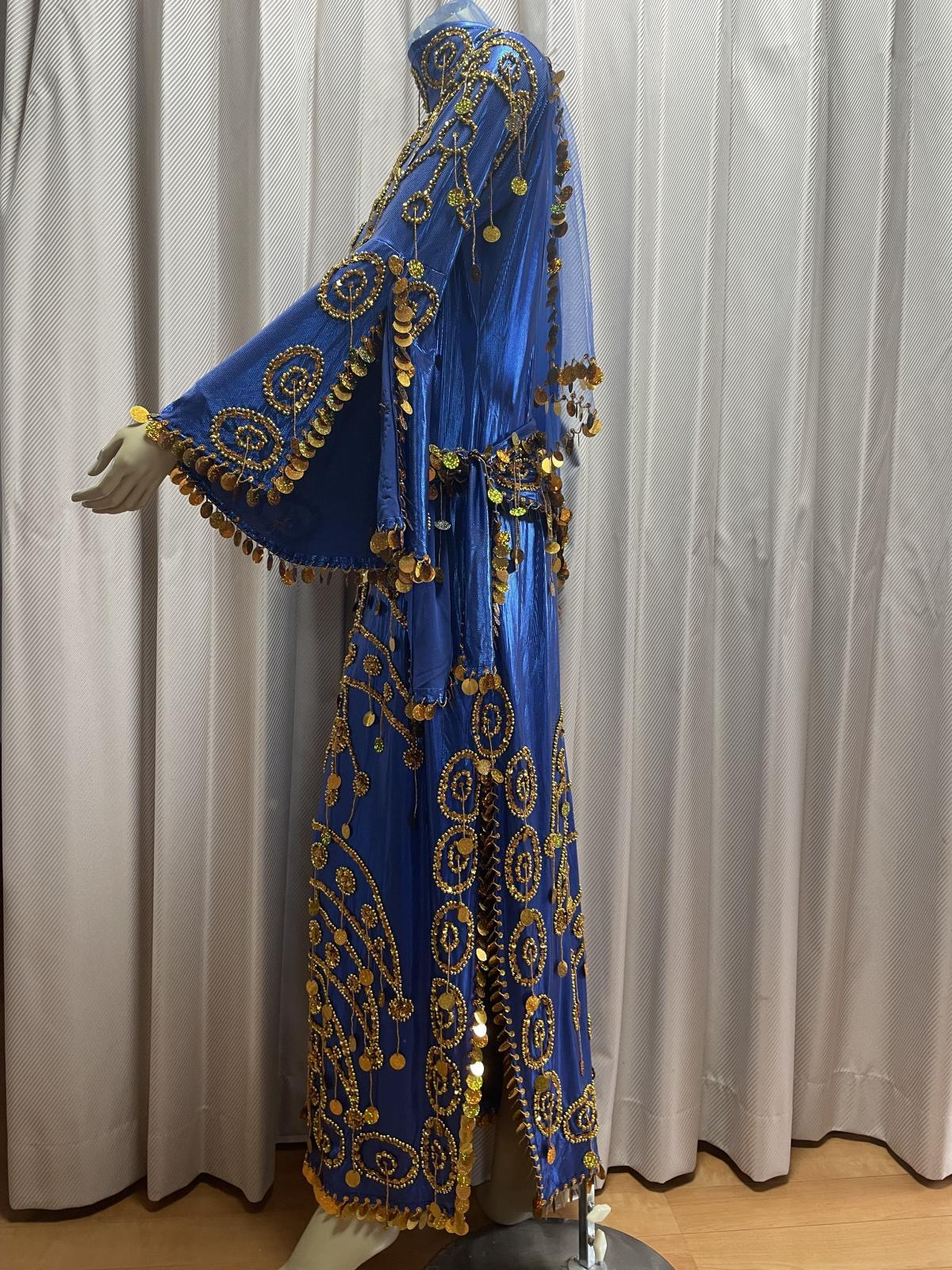 トラディッショナルな正統派サイーディドレスの3点セット。ベースは光沢感のあるストレッチ生地を使用していますスパンコールやビーズはひとつひとつ丁寧に装飾されていてクオリティが良いため、長く愛用されたい方にお勧めです サイーディの他、ガワージーの衣装としてお使いいただけますこの衣装と合わせ、フォークロアアクセサリーもいかがですか? 群舞オーダーも随時承っております(基本5着〜) ■商品名:サイーディドレス(ヘッドースカーフ、ヒップスカーフ付き) ■カラーカラー:ブルー刺しゅう、コイン、ビーズ:ゴールド■ドレスのサイズ・丈:約139cm・身幅:約45cm・袖丈:約59cm ■付属品・ヘッドスカーフ※中央にバンドがついているので紐で簡単に結べます・ヒップスカーフ ■オーダーをご希望の方はお読みください・群舞等で複数枚、必要となる方はオーダーも可能ですのでお気軽にお問い合わせください※オーダーは基本5着以上からとなりますがお急ぎでない場合は1着からでも対応できる場合がございますのでご相談くださいませ ■取り扱いについて・ベースに使用されている生地は箔プリントが施されているため湿度や汗等で生地と生地が重なりあうと剥がれることがございます。衣装着用後はハンガーにかけて日陰干しするなど風通しを良くさせることをおすすめいたします