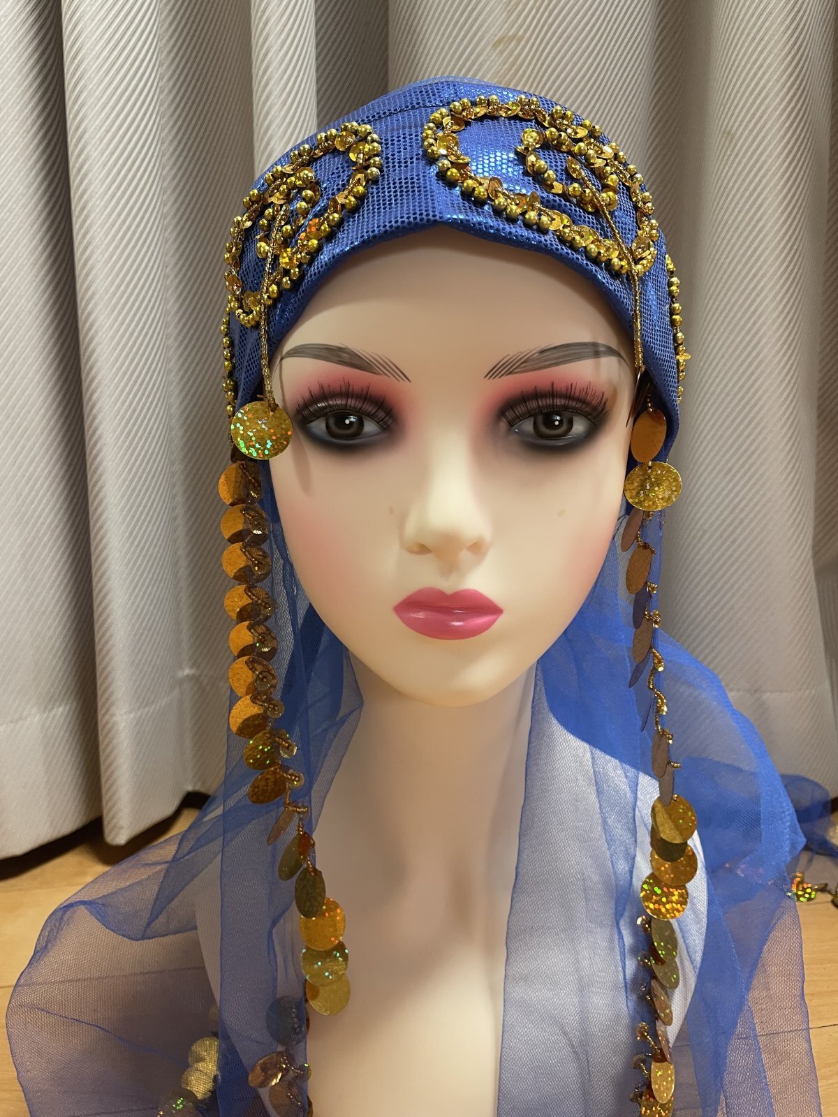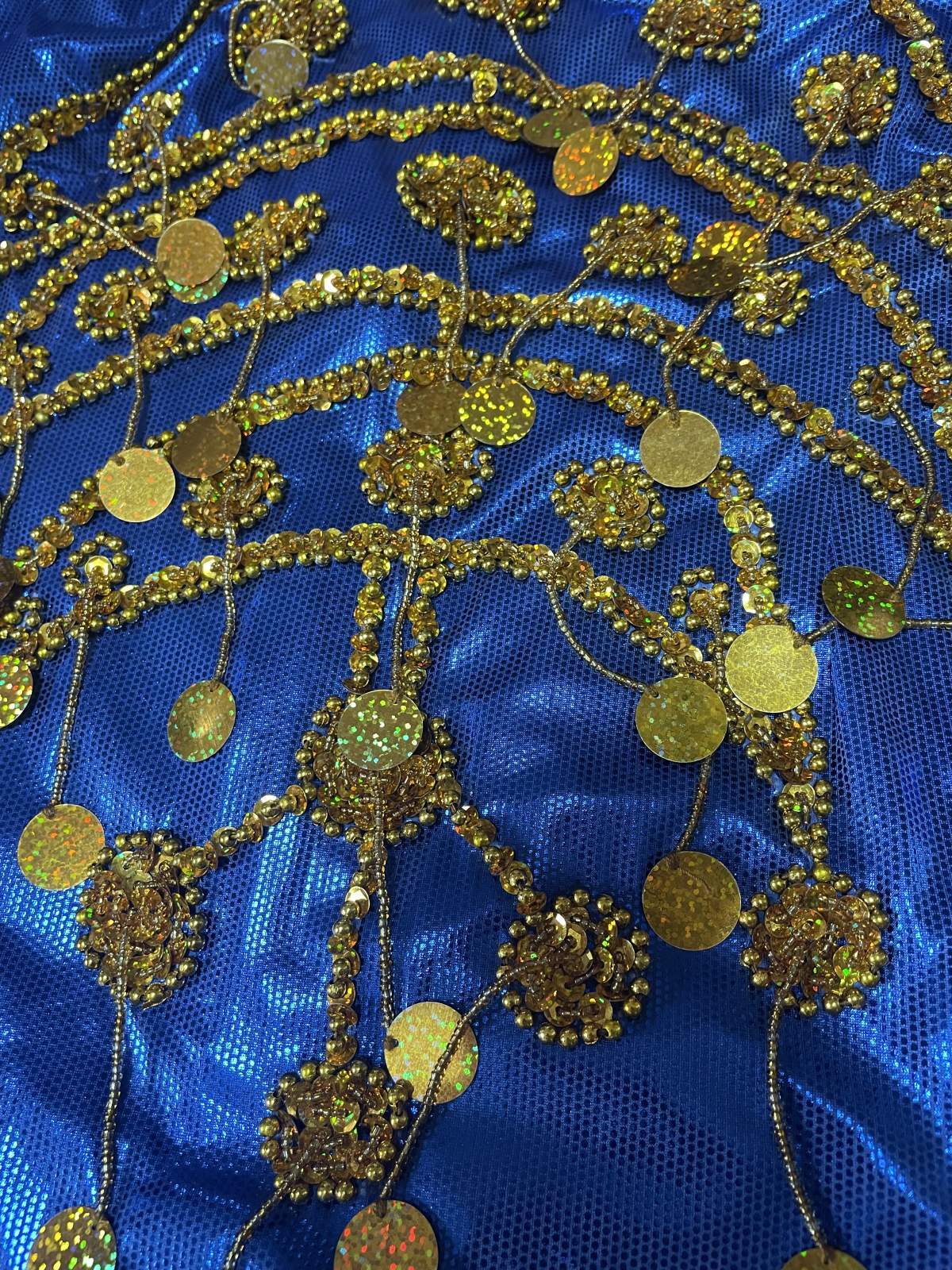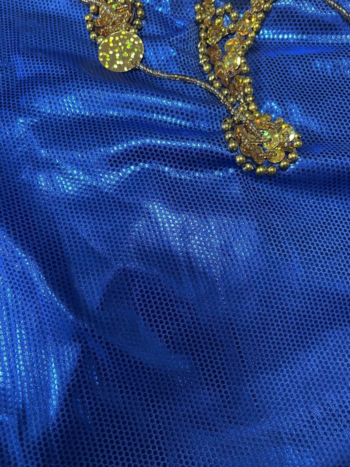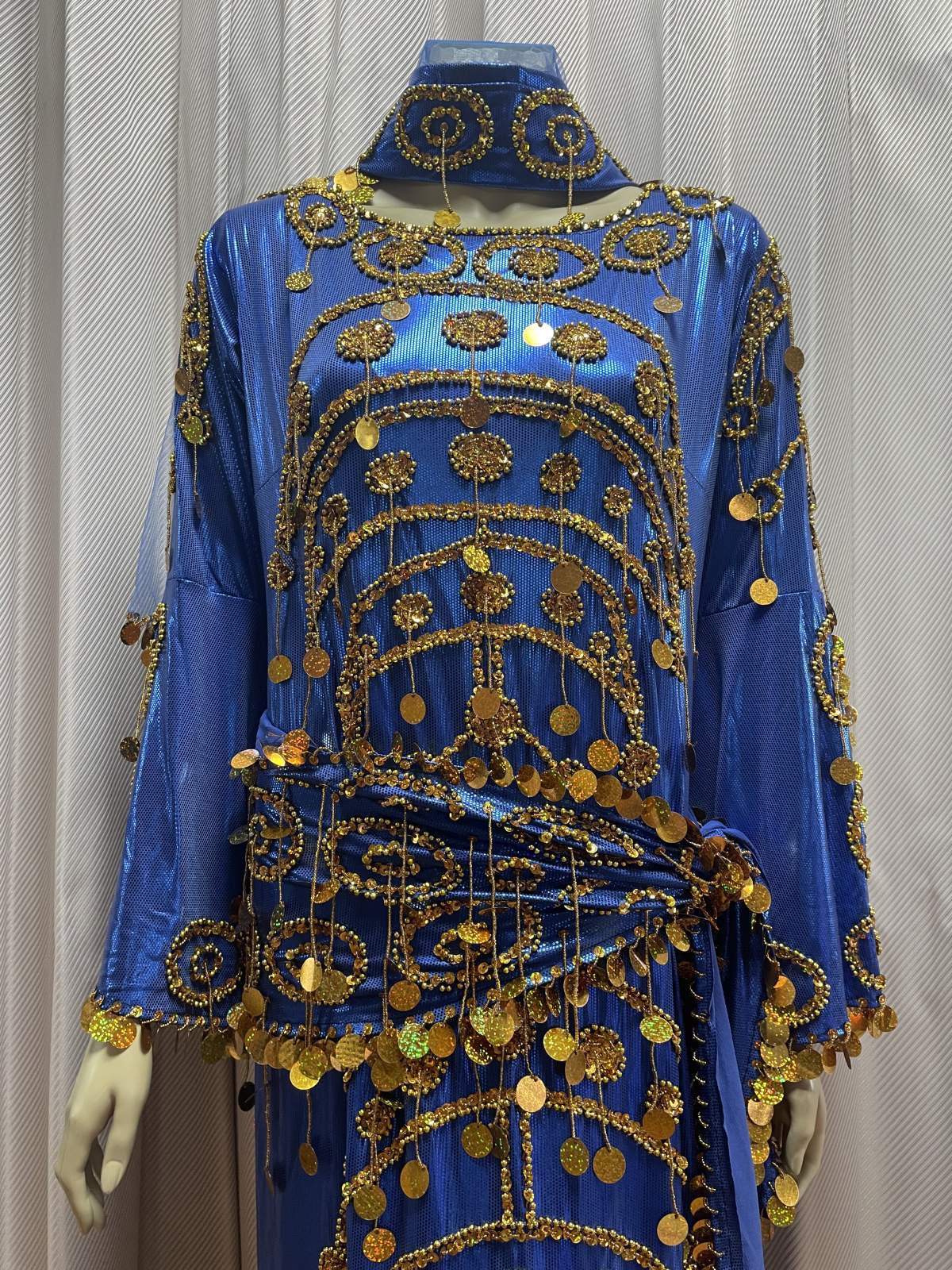 トラディッショナルな正統派サイーディドレスの3点セット。ベースは光沢感のあるストレッチ生地を使用していますスパンコールやビーズはひとつひとつ丁寧に装飾されていてクオリティが良いため、長く愛用されたい方にお勧めです サイーディの他、ガワージーの衣装としてお使いいただけますこの衣装と合わせ、フォークロアアクセサリーもいかがですか? 群舞オーダーも随時承っております(基本5着〜) ■商品名:サイーディドレス(ヘッドースカーフ、ヒップスカーフ付き) ■カラーカラー:ブルー刺しゅう、コイン、ビーズ:ゴールド■ドレスのサイズ・丈:約139cm・身幅:約45cm・袖丈:約59cm ■付属品・ヘッドスカーフ※中央にバンドがついているので紐で簡単に結べます・ヒップスカーフ ■オーダーをご希望の方はお読みください・群舞等で複数枚、必要となる方はオーダーも可能ですのでお気軽にお問い合わせください※オーダーは基本5着以上からとなりますがお急ぎでない場合は1着からでも対応できる場合がございますのでご相談くださいませ ■取り扱いについて・ベースに使用されている生地は箔プリントが施されているため湿度や汗等で生地と生地が重なりあうと剥がれることがございます。衣装着用後はハンガーにかけて日陰干しするなど風通しを良くさせることをおすすめいたします