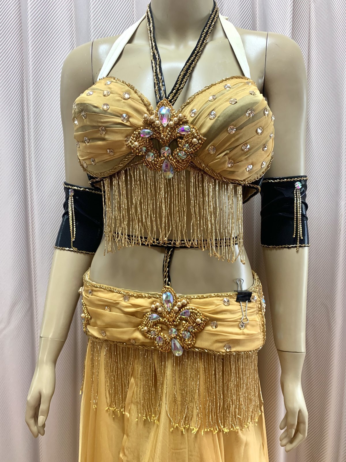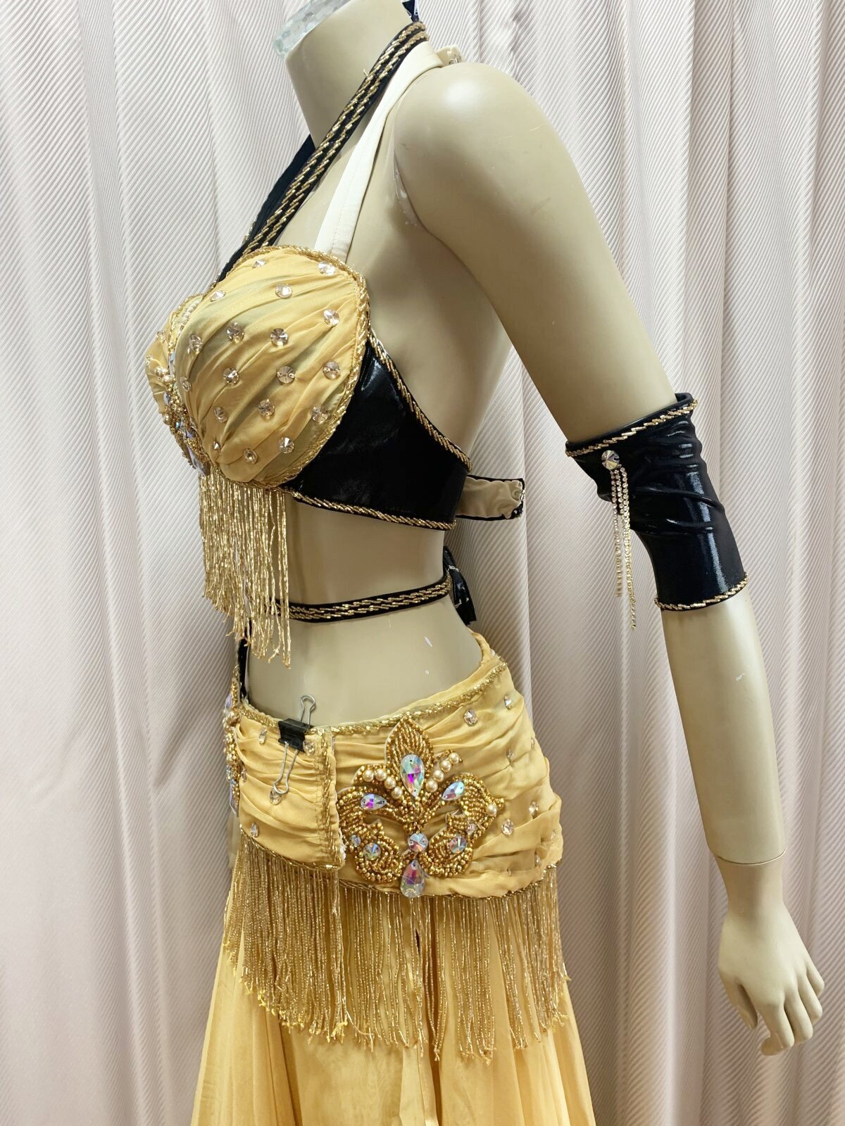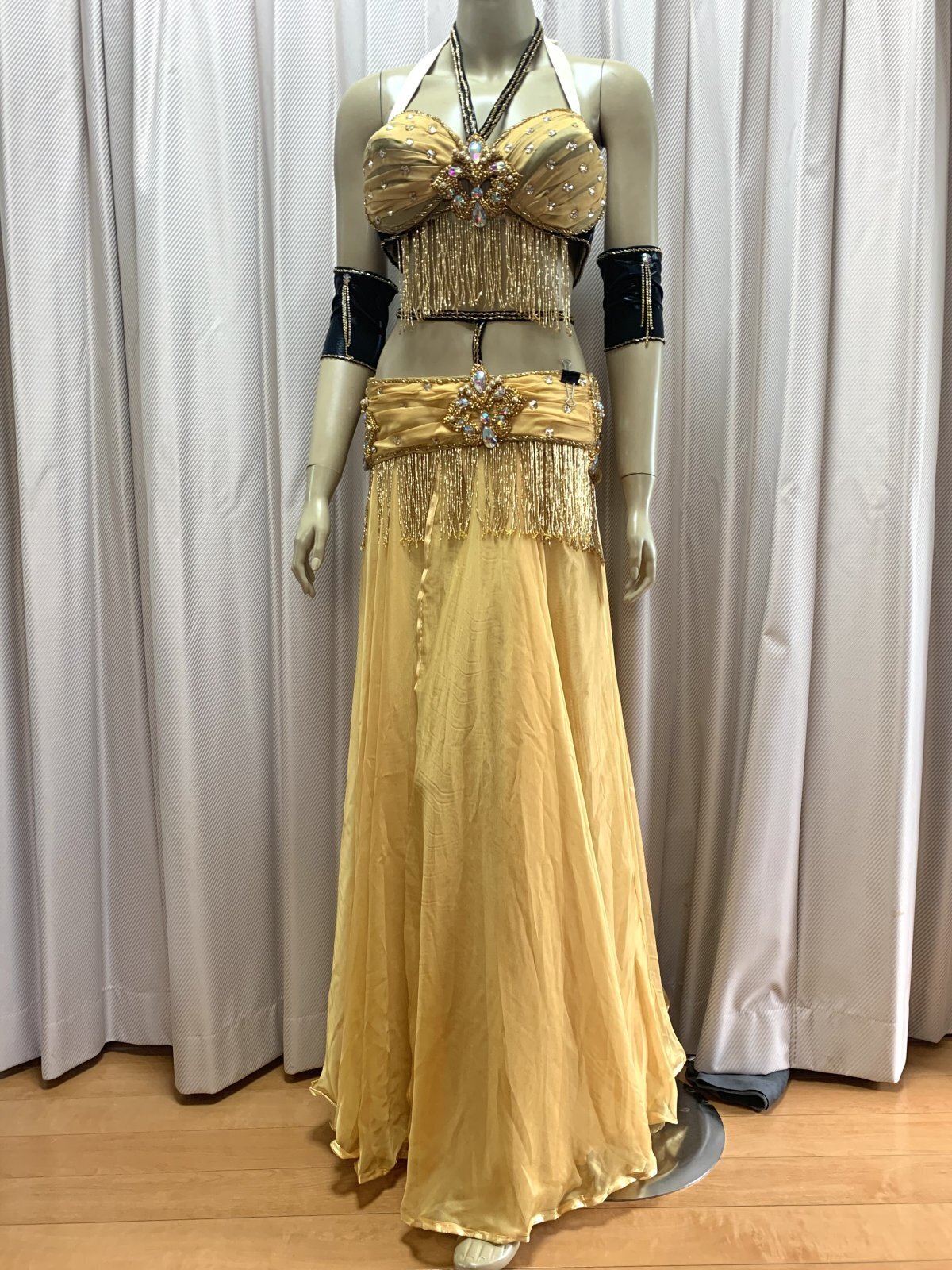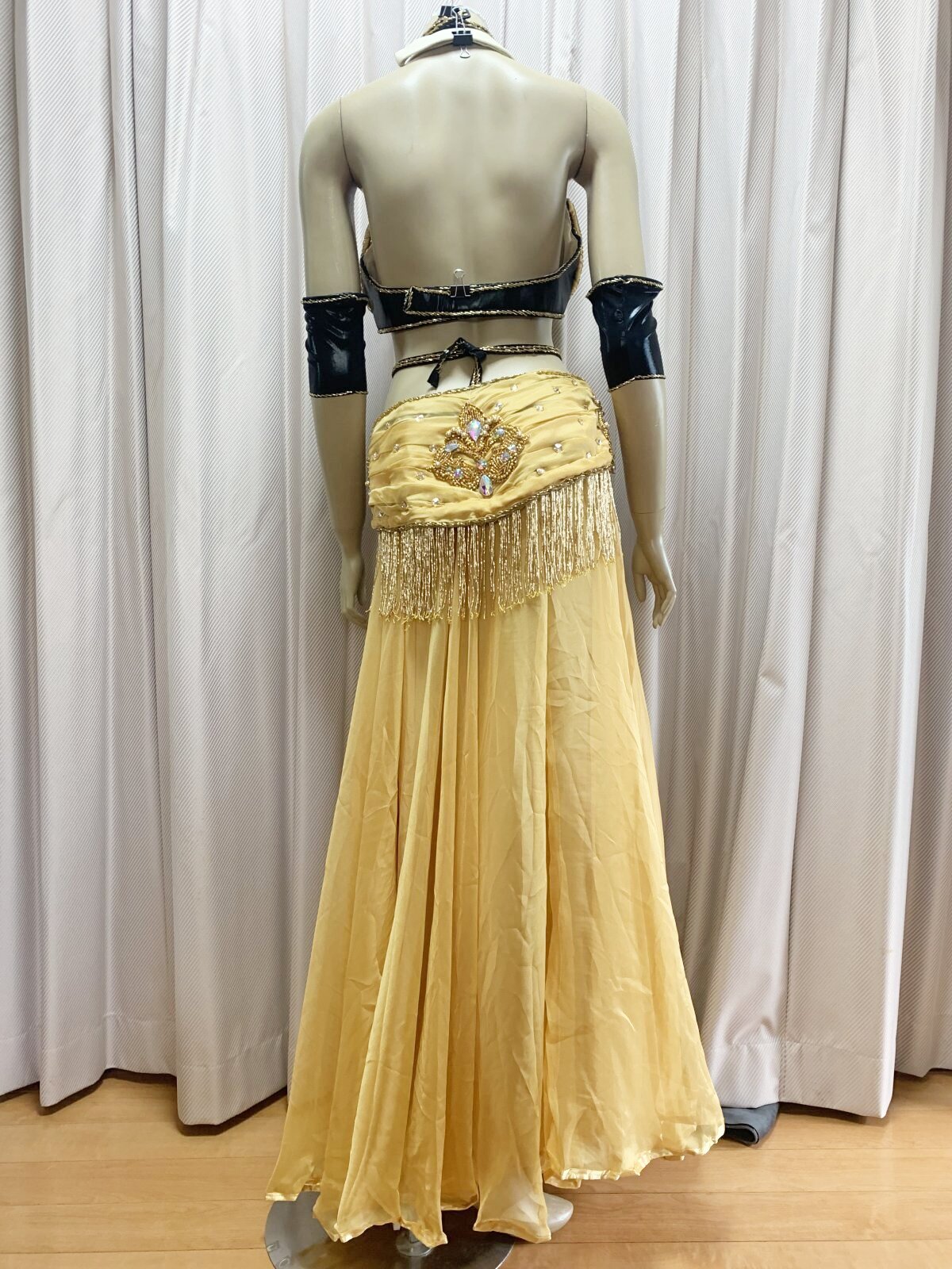 ハニーン特注!ゴールデンエラ時代に活躍したダンサーをイメージしたブラベルトタイプのコスチュームをお作りしました。柔らかなシフォンをベースにギャザーを加えてふんわりフェミニンに!シフォンスカートは脚が透けすぎないよう2枚仕立てでお作りしております。ぜひゴールデンエラ時代のダンサーのように着こなしてみてくださいね。ハニーンこだわりのビーズフリンジはもちろん、照明に輝くストーンもプラスし、衣装のポイントとなる紋章風のモチーフもパールや大き目ラインストーンで1点1点ハンドメイドで作成しております。 サイズ等、お質問がありましたらお問い合わせフォームからご連絡ください! ■商品名:オールドスタイル・バイカラーブラベルトコスチューム■カラー:ゴールドベージュ×ブラック■ブラカップ:M-L(約C〜Fカップ)パット入り※サイズはあくまでも目安になります■アンダーバスト:フリー■ショルダーストラップ フリー■バスト正面(右脇から左脇までの長さ):約34cm■ベルト:最長約98cm■スカート丈:約105cm※フロント両サイドにスリット入り■付属品:シフォンベール■その他・スカートはシフォン2枚構造でお作りしております・ブラはフォルターネックのみですとご不安な方向けにベージュのストラップもお付けしておりますが、不必要な方は取り外してしまってもOKです