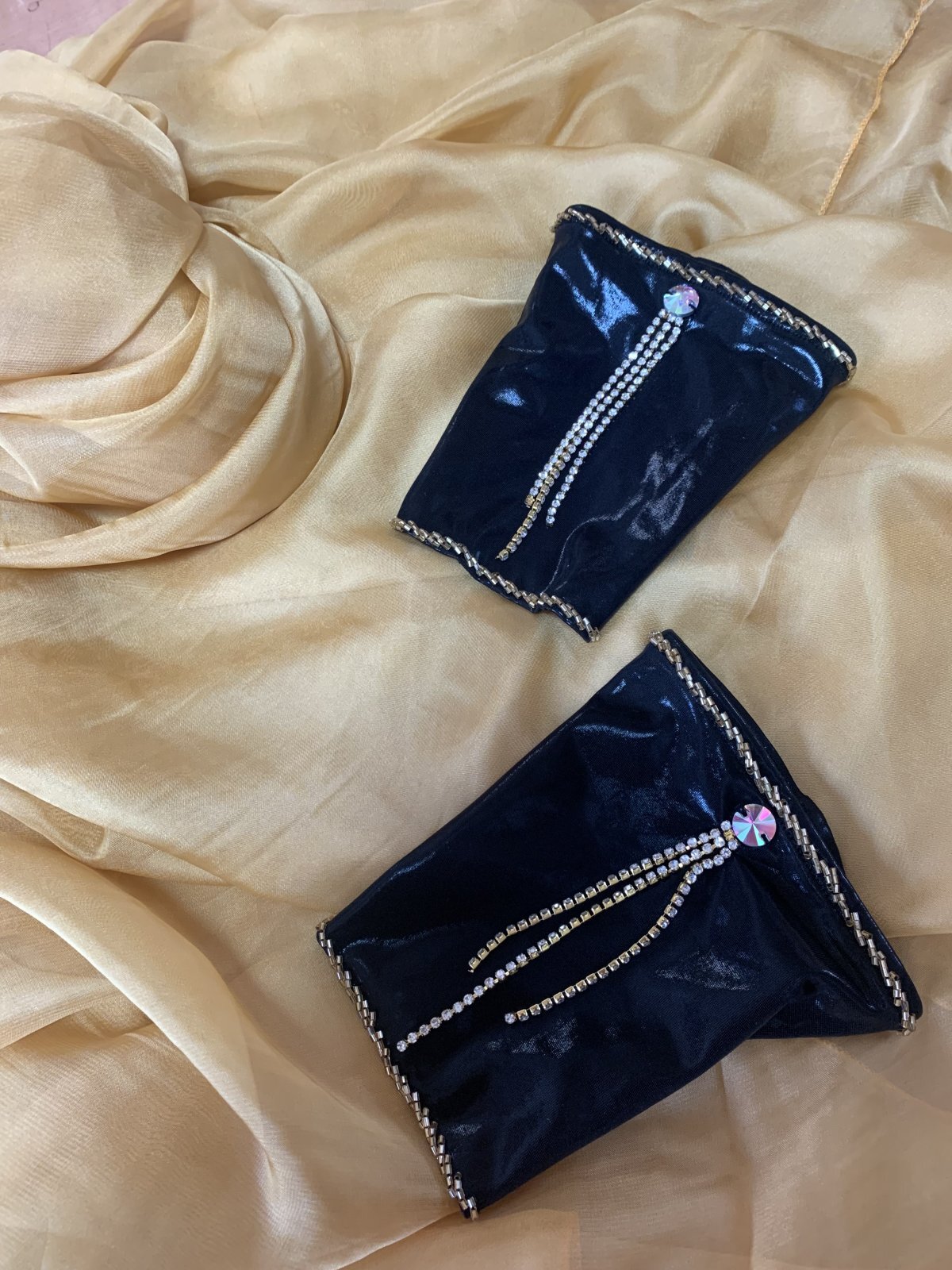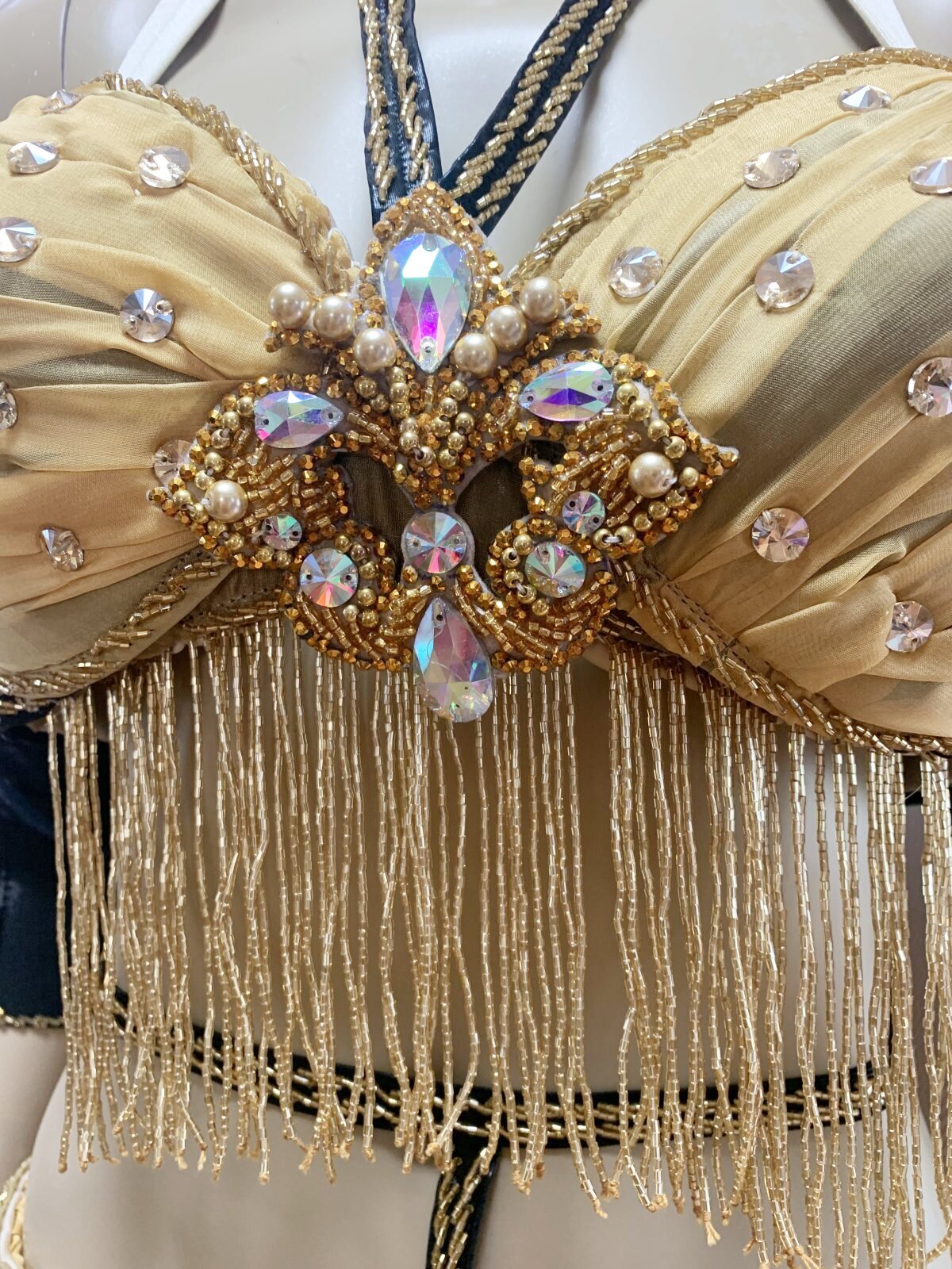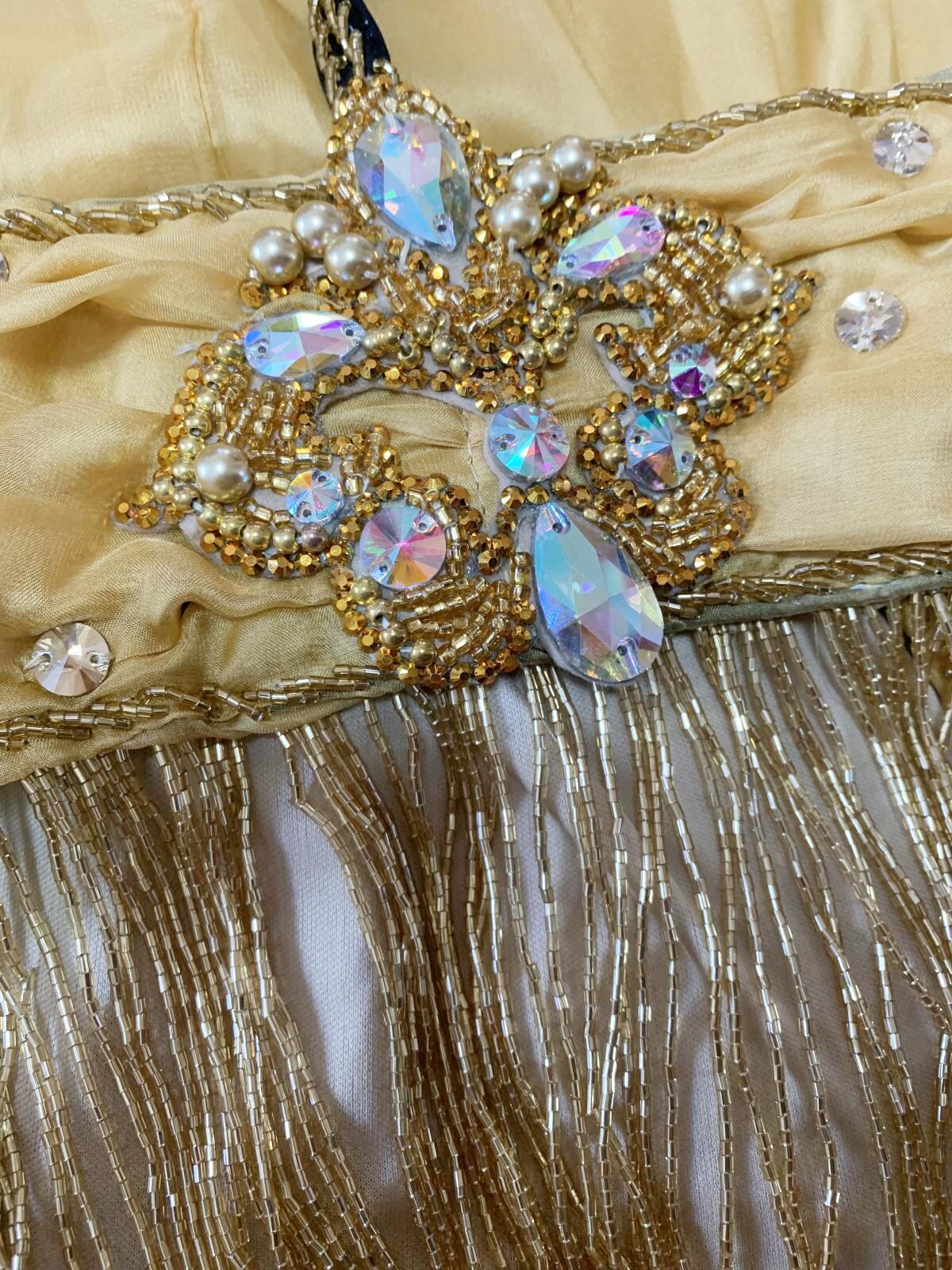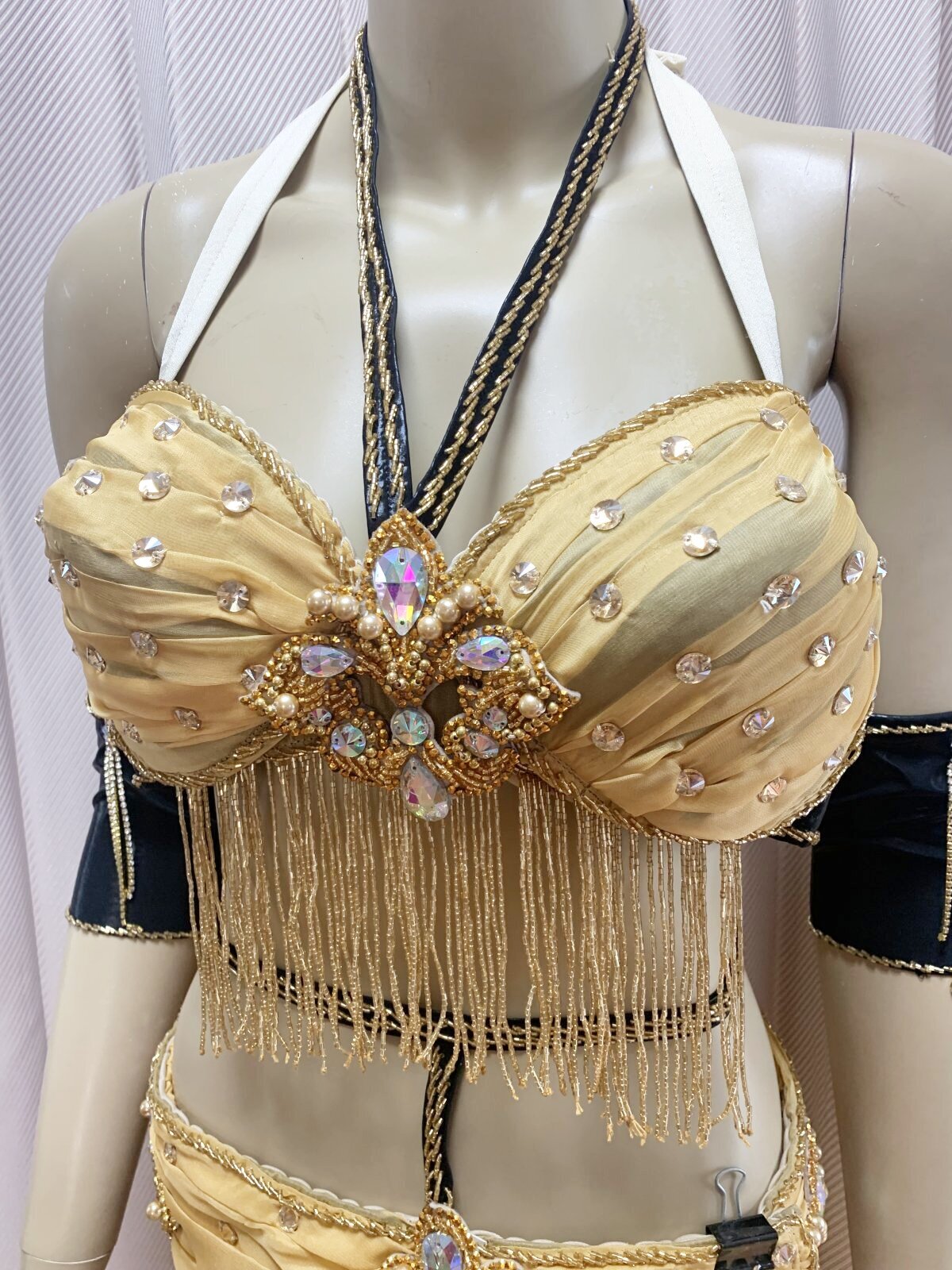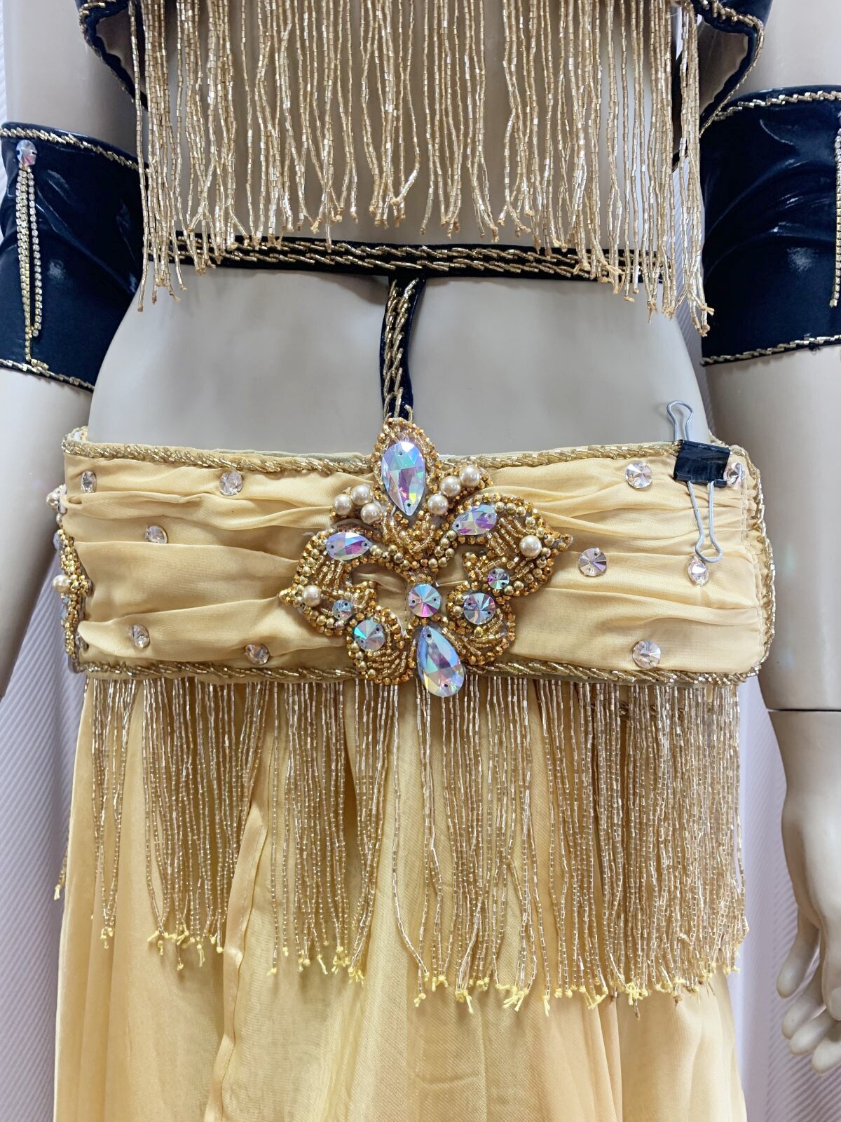 ハニーン特注!ゴールデンエラ時代に活躍したダンサーをイメージしたブラベルトタイプのコスチュームをお作りしました。柔らかなシフォンをベースにギャザーを加えてふんわりフェミニンに!シフォンスカートは脚が透けすぎないよう2枚仕立てでお作りしております。ぜひゴールデンエラ時代のダンサーのように着こなしてみてくださいね。ハニーンこだわりのビーズフリンジはもちろん、照明に輝くストーンもプラスし、衣装のポイントとなる紋章風のモチーフもパールや大き目ラインストーンで1点1点ハンドメイドで作成しております。 サイズ等、お質問がありましたらお問い合わせフォームからご連絡ください! ■商品名:オールドスタイル・バイカラーブラベルトコスチューム■カラー:ゴールドベージュ×ブラック■ブラカップ:M-L(約C〜Fカップ)パット入り※サイズはあくまでも目安になります■アンダーバスト:フリー■ショルダーストラップ フリー■バスト正面(右脇から左脇までの長さ):約34cm■ベルト:最長約98cm■スカート丈:約105cm※フロント両サイドにスリット入り■付属品:シフォンベール■その他・スカートはシフォン2枚構造でお作りしております・ブラはフォルターネックのみですとご不安な方向けにベージュのストラップもお付けしておりますが、不必要な方は取り外してしまってもOKです