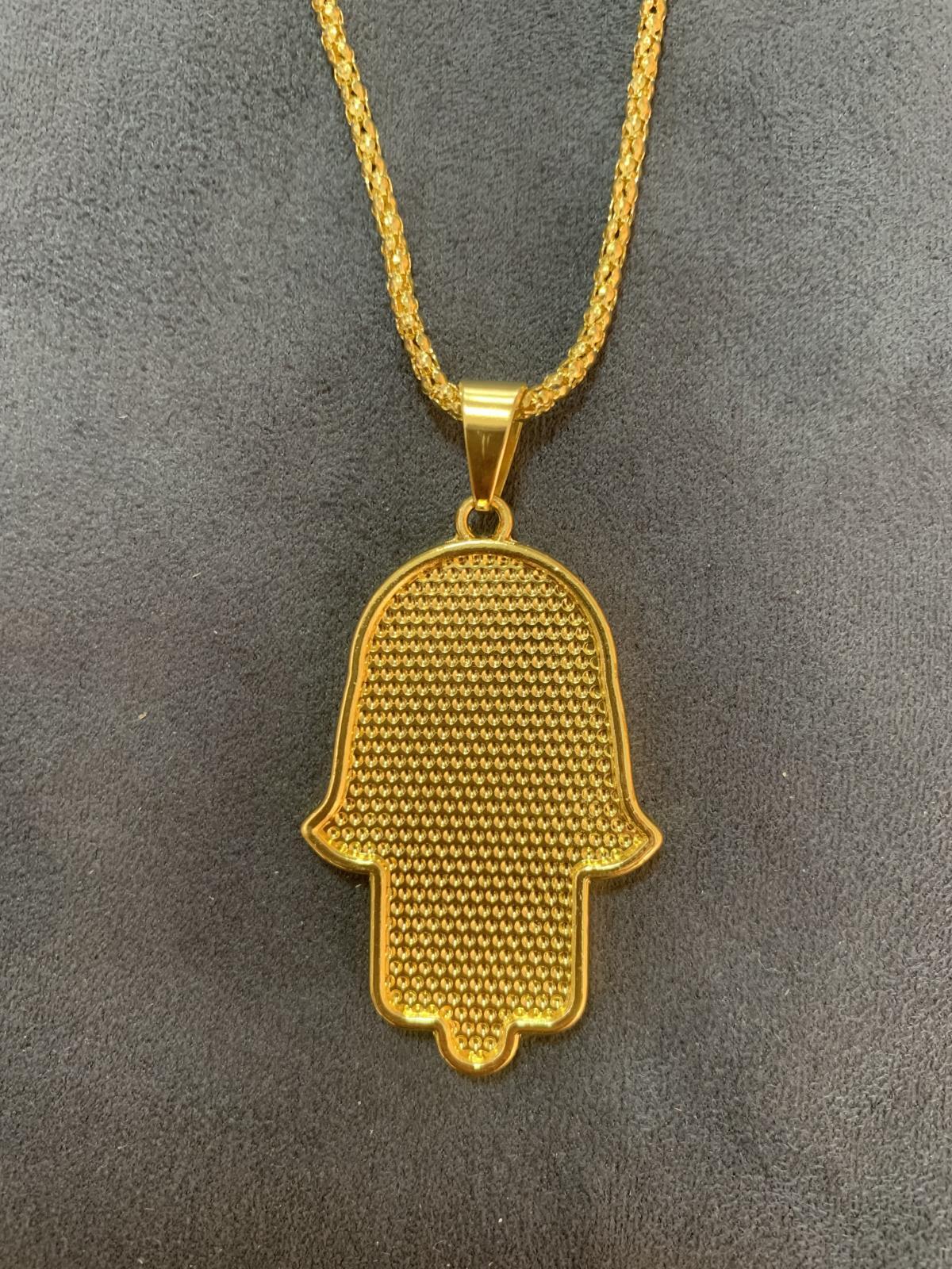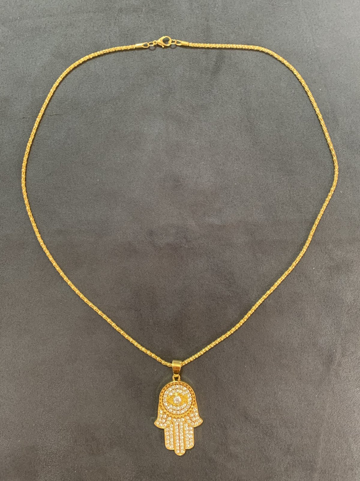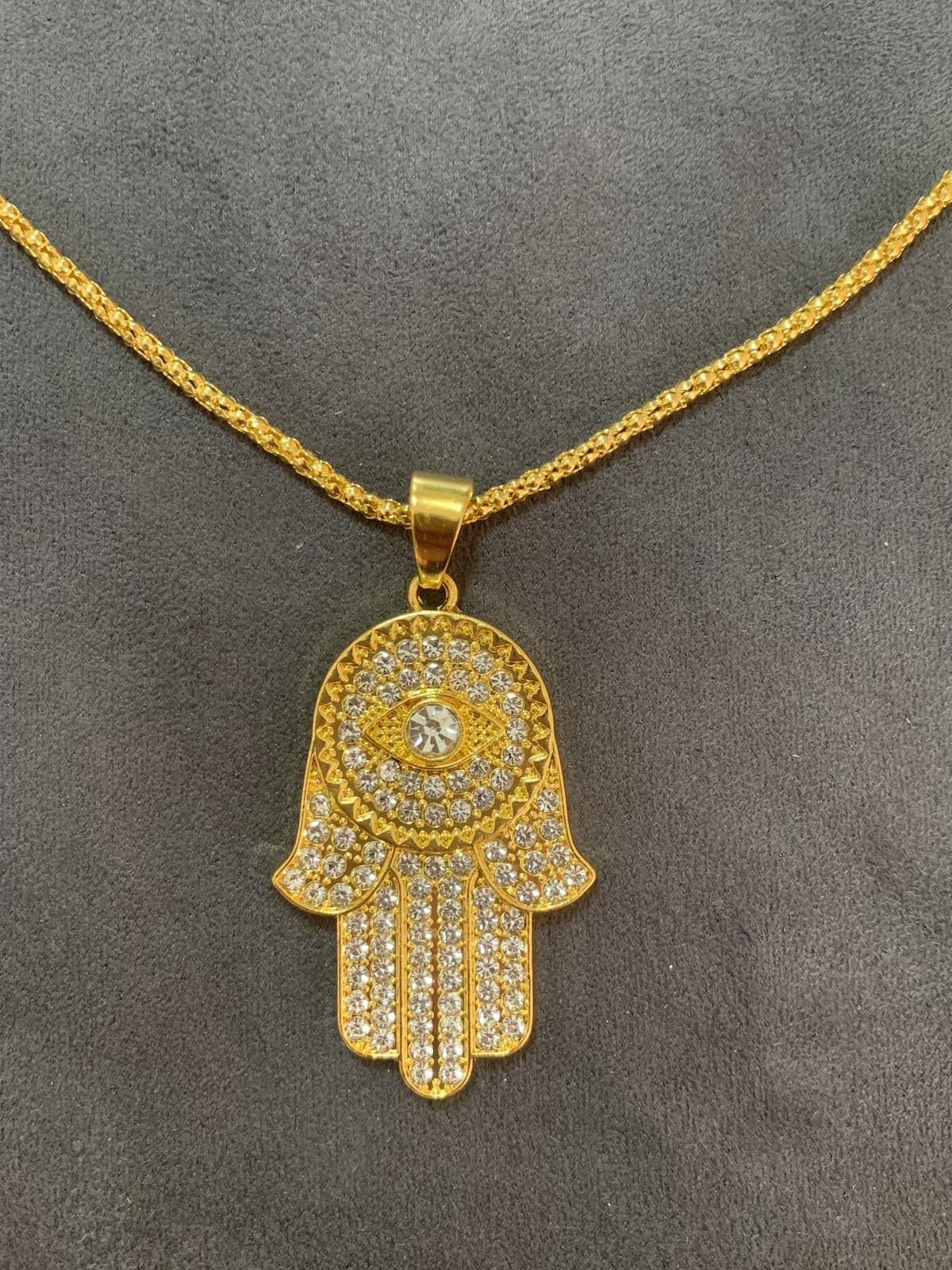 バラディやオリエンタル衣装に合わせてご使用いただけるハムサモチーフのペンダント。キラキララインストーン付きなので照明にも映えますよ!もちろん、普段付けしてもOK!! ■ラインストーンハムサペンダント■サイズ・チェーンの長さ60cm・飾り部分の縦幅:約6cm・飾り部分の横幅:約3cm■カラー:ゴールド■その他・金属アレルギーの方はご注意ください・短めのチェーンをご希望の場合は別売りの45cmチェーンをお求めください