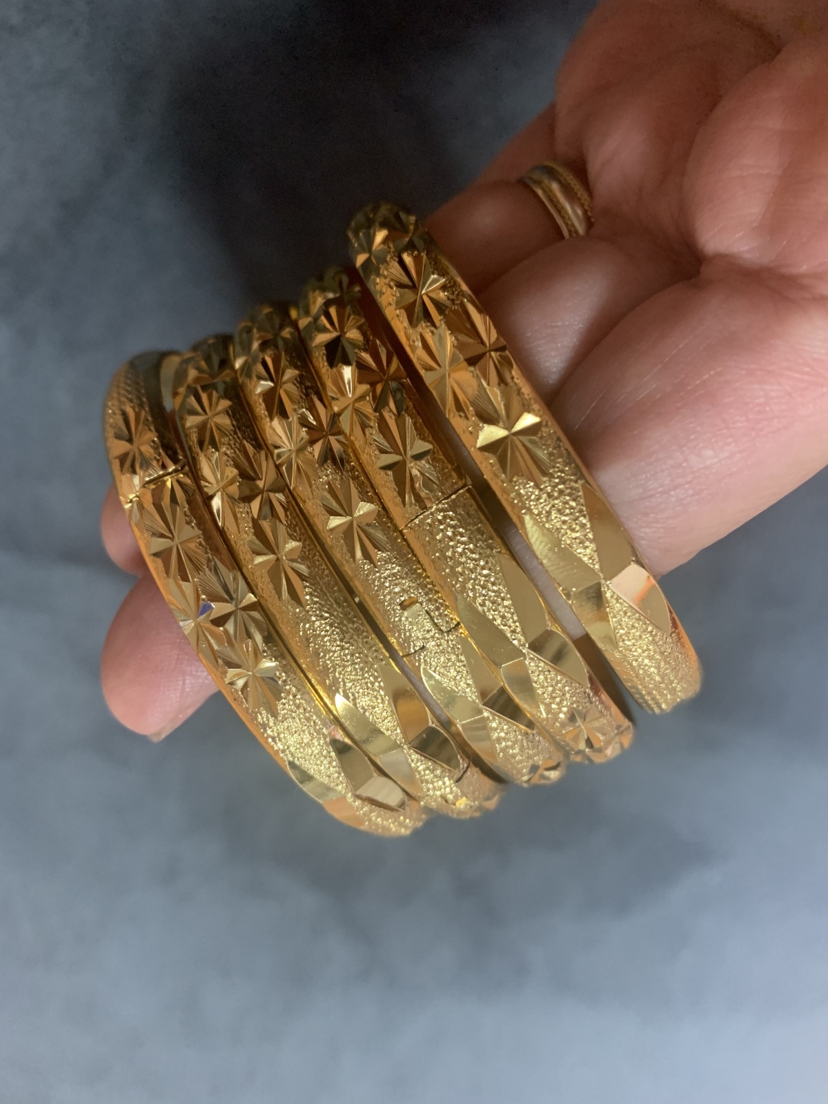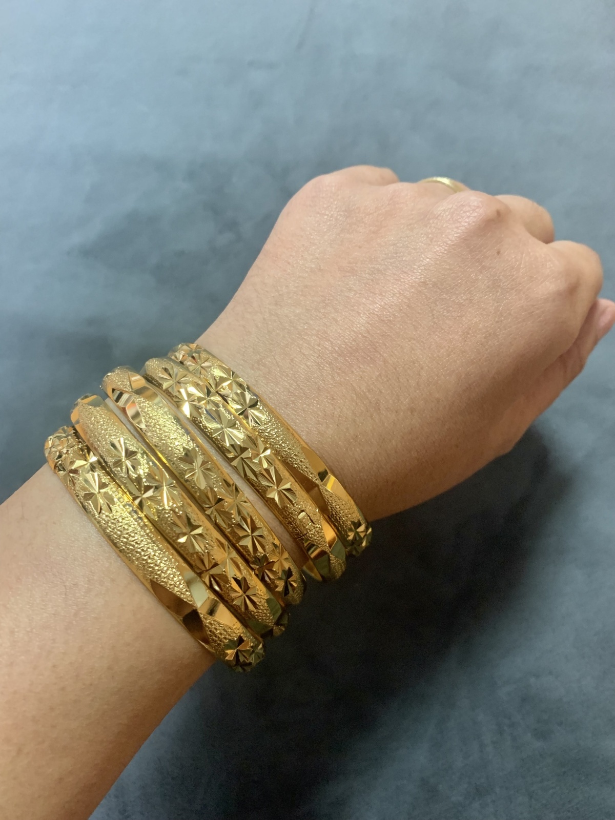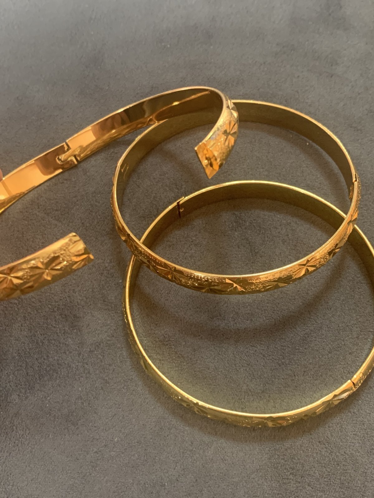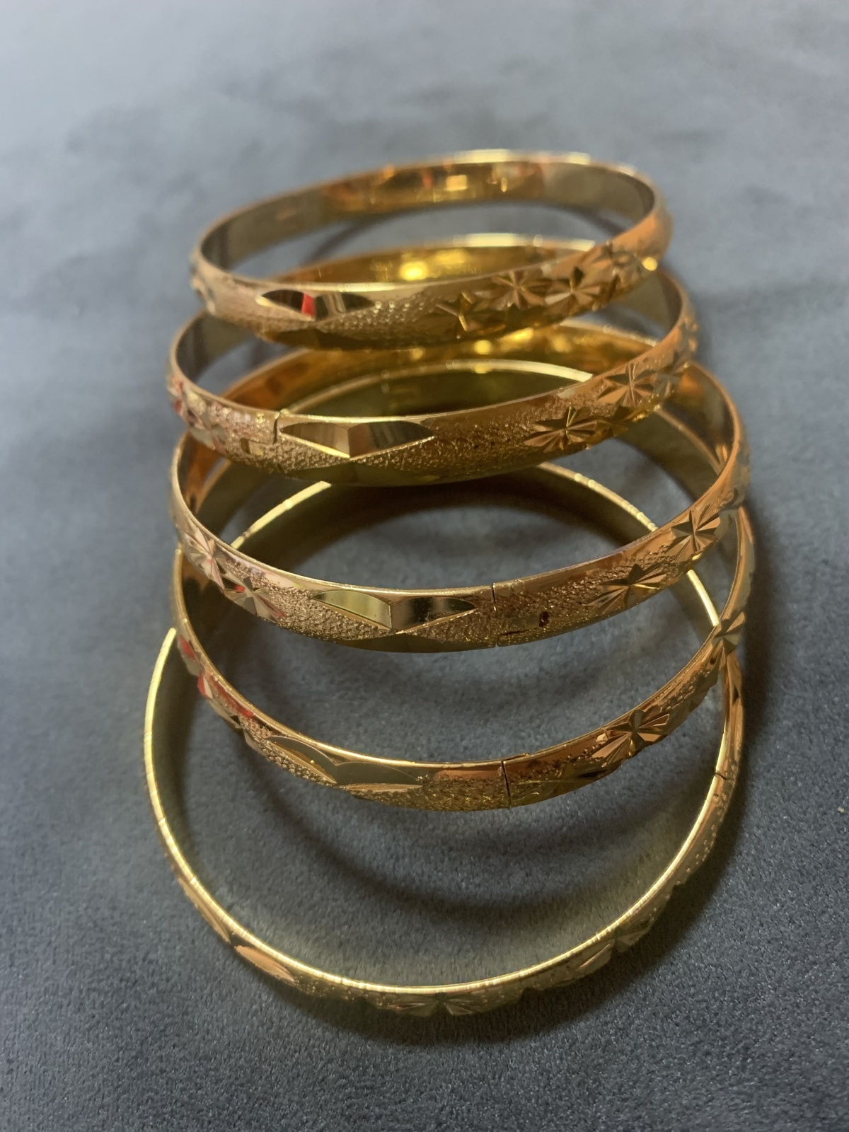 アラブ女性にとって身につける宝飾品は(ゴールド)はとても大切な財産です!こちらは本物の金ではありませんが、アラブスタイルのブレスレット。クリアなゴールドカラーで本物のゴールドの様な輝き方ですので本格的な腕元を飾りたい方にとってもおすすめです。 本物のゴールドのような程よい重量感と、彫刻のような光に反射する模様デザインが特徴的なブレスレット。バラディやガワージーなどの手首のおしゃれにぴったりのデザインです ■アラビアンブレスレット(5点セット)■サイズ・直径:6.5cm※開閉できるタイプになります。■カラー:ゴールド■その他・5つのセット売りになります・金属アレルギーの方はご注意ください・稀に夏場など熱で金属が多少変形することがあります。その際に開閉部分が重なりにくくなることがありますのでご自身で金属を微調整し、開閉部分が絡み合うよう調整してみてください。