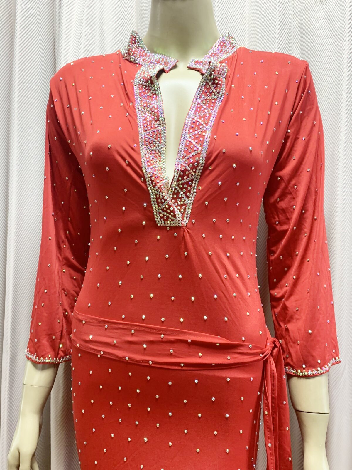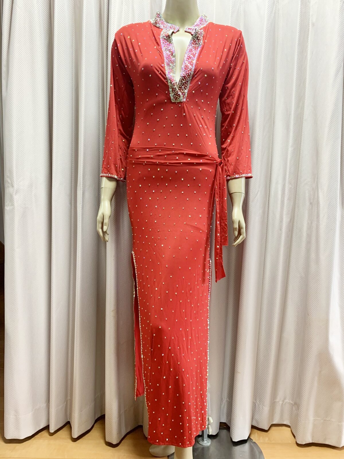 オーソドックスなスタンドカラー(立ち襟)タイプのガラベーヤドレス。クリスタルラインストーンをたっぷり施したデザインですのでモダンなイメージの演目にも合わせやすい便利なシンプルドレスです。長袖でお作りしておりますが、腕まくりしてお袖を短く着こなすのも◎バラディだけでなくシャービーにもおすすめ!! ※こちらの衣装に合わせるアクセサリーでお悩みでしたらぜひご相談くださいませ ■商品名:スタンドカラー・クリスタル付きバラディドレス(長袖) ■カラーカラー:レッド■サイズ・丈:128cm・身幅:40cm・ヒップあたりの横幅:約40cm※ストレッチあり・スリット入り■付属品・細いスカーフが1点■その他・群舞用(5着〜)でしたら受注オーダー可能。オーダーの際に付属品追加(別途費用かかります)も承ります。