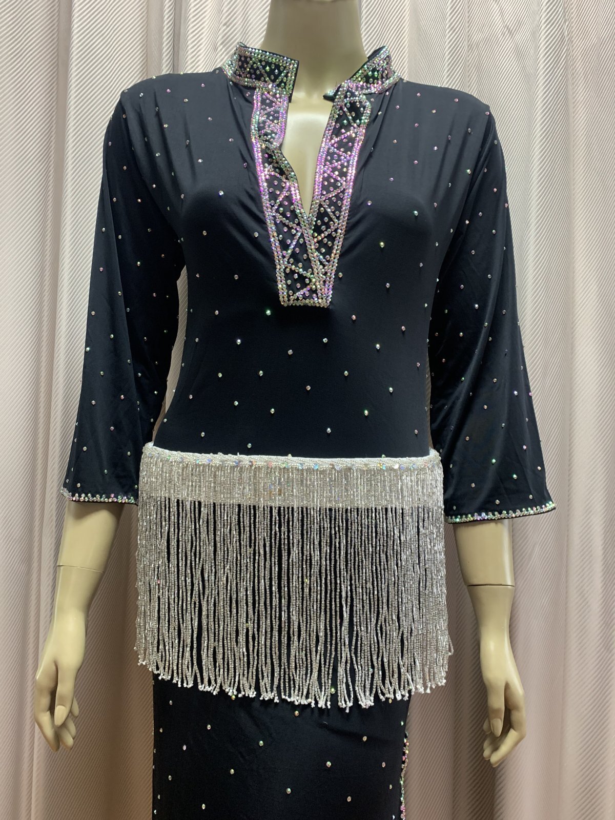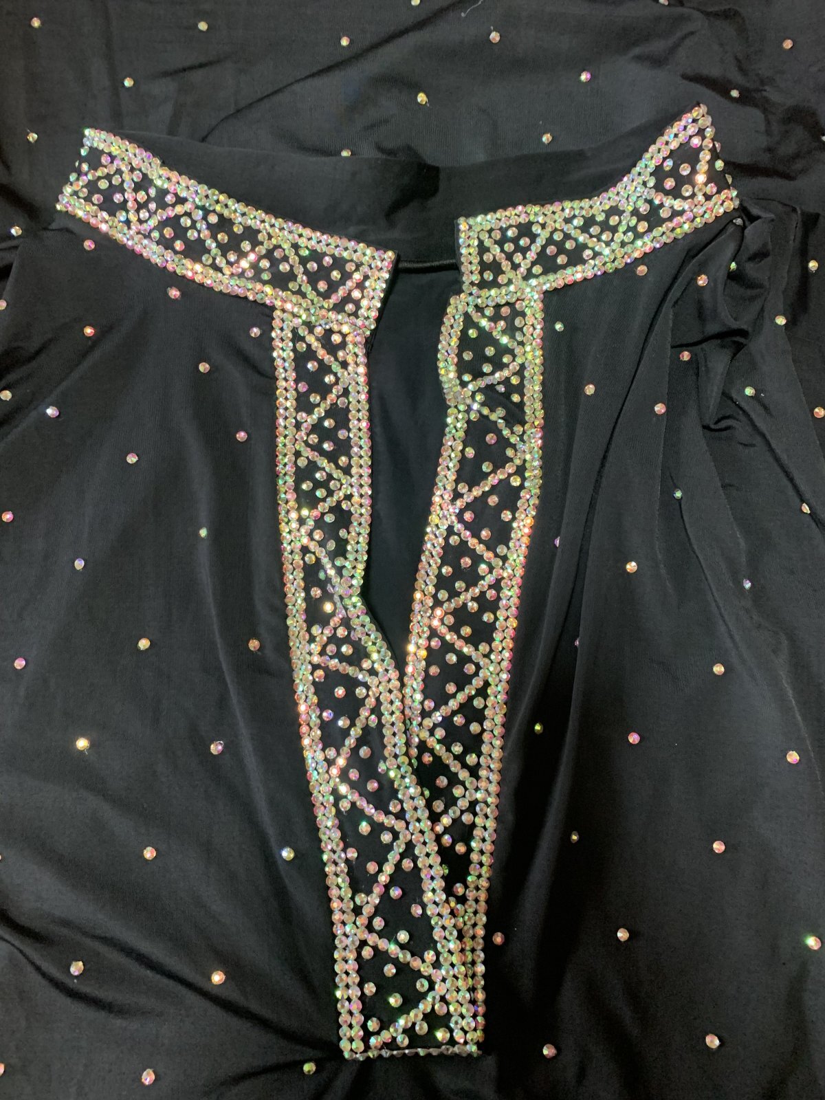 オーソドックスなスタンドカラー(立ち襟)タイプのガラベーヤドレス。クリスタルラインストーンをたっぷり施したデザインですのでモダンなイメージの演目にも合わせやすい便利なシンプルドレスです。長袖でお作りしておりますが、腕まくりしてお袖を短く着こなすのも◎バラディだけでなくシャービーにもおすすめ!! ※こちらの衣装に合わせるアクセサリーでお悩みでしたらぜひご相談くださいませ ■商品名:スタンドカラー・クリスタル付きバラディドレス(長袖) ■カラーカラー:ブラック■サイズ・丈:130cm・身幅:40cm・ヒップあたりの横幅:約42cm※ストレッチあり・スリット入り■付属品・細いスカーフが1点■その他・群舞用(5着〜)でしたら受注オーダー可能。オーダーの際に付属品追加(別途費用かかります)も承ります。