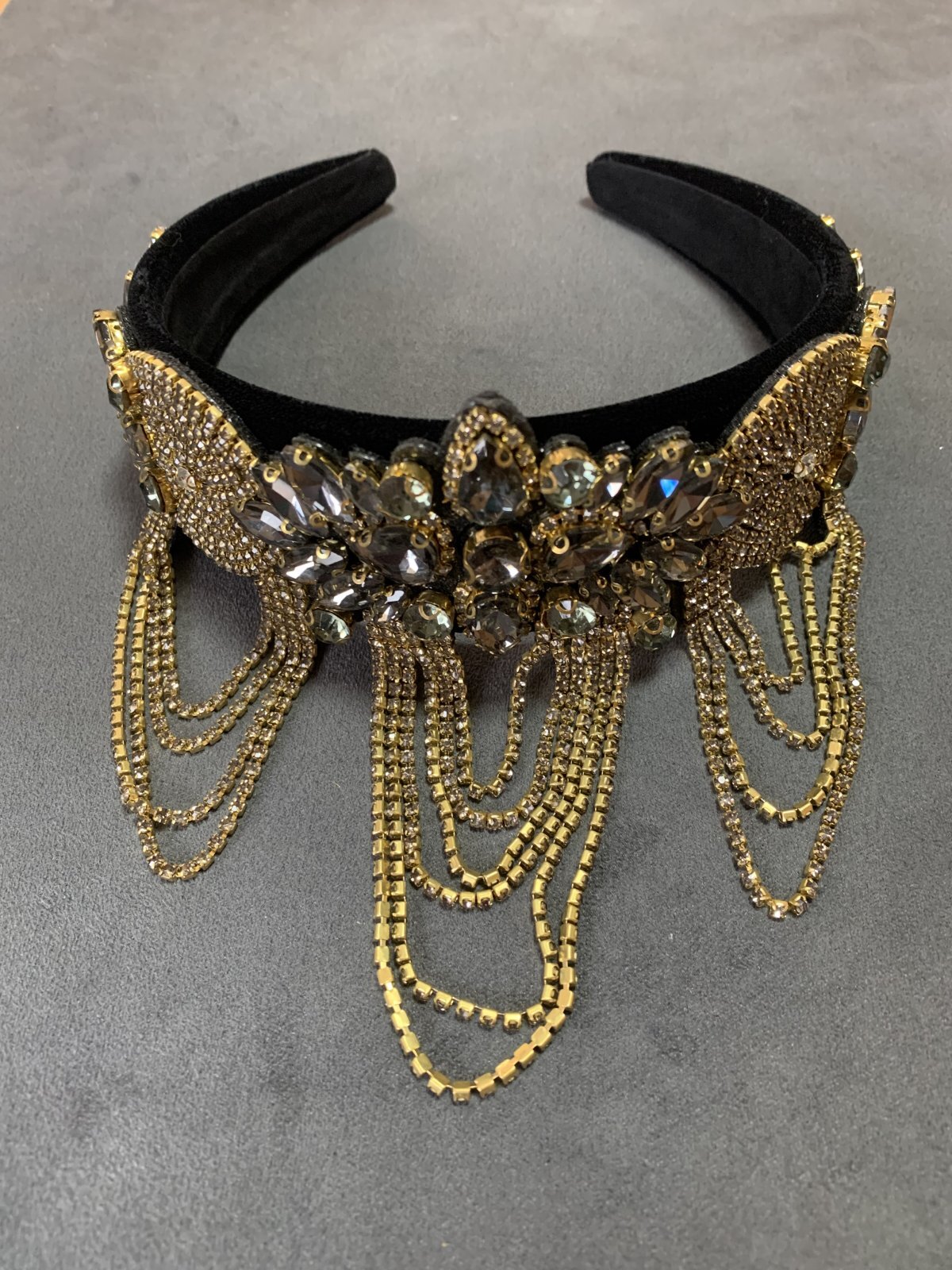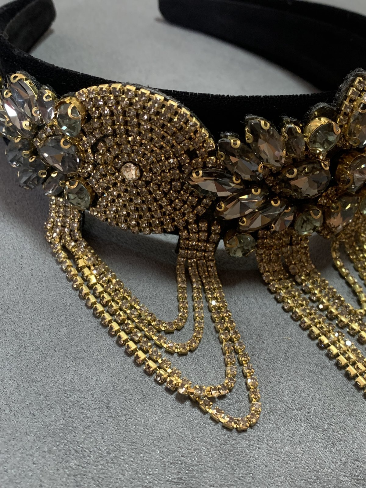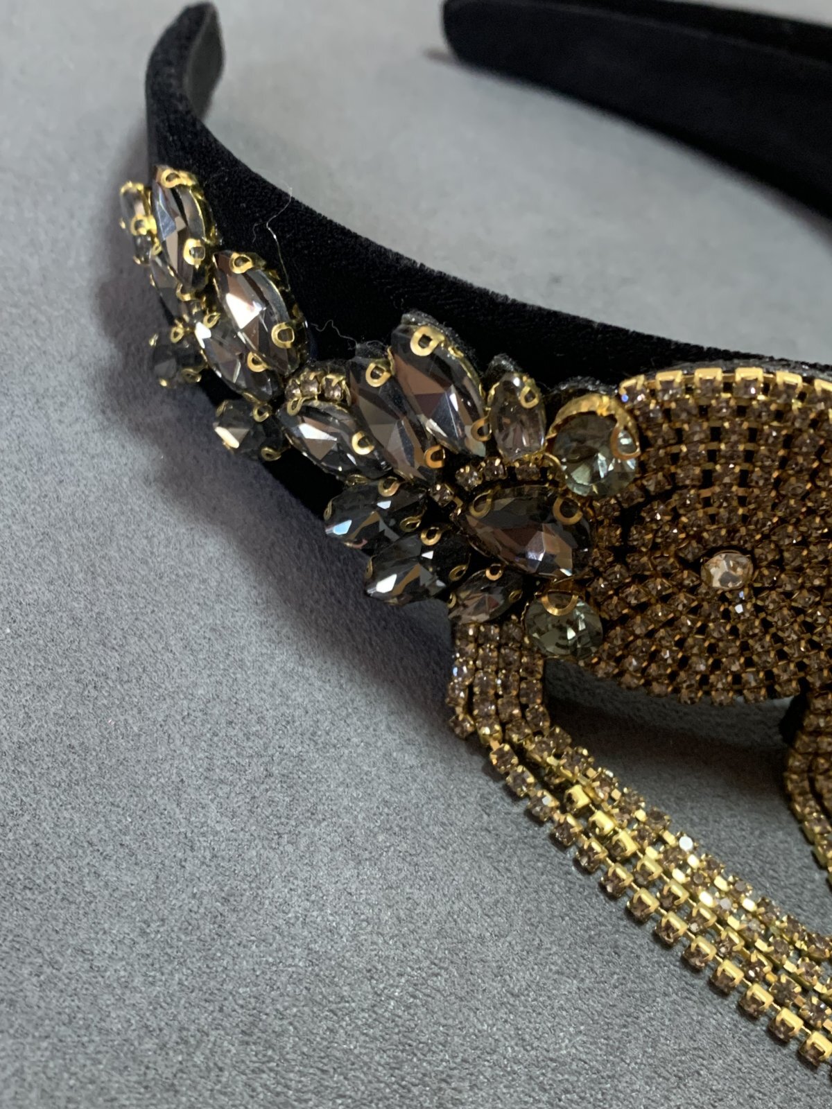 アワーレムやオリエンタル衣装に使用できるカチューシャタイプのヘッドドレスです。キラキラしたラインストーンやデザインですのでオリエンタル衣装にプラスしても良し!! ■キラキラカチューシャ■サイズフリーサイズ■カラー:ブラック※金属部分はゴールドになります■その他・ラインストーンやビーズは接着になりますので取り扱いにはご注意くださいませ