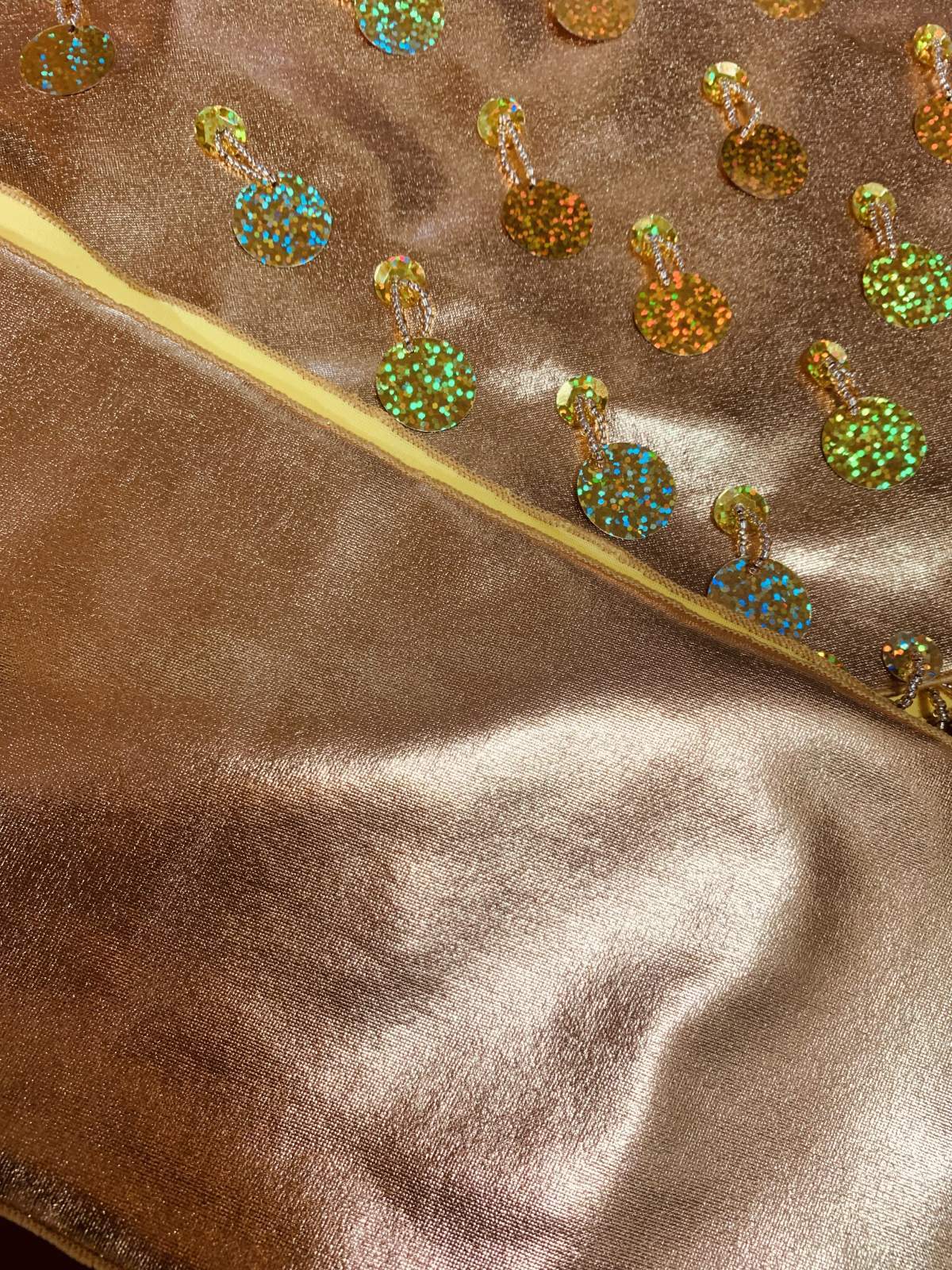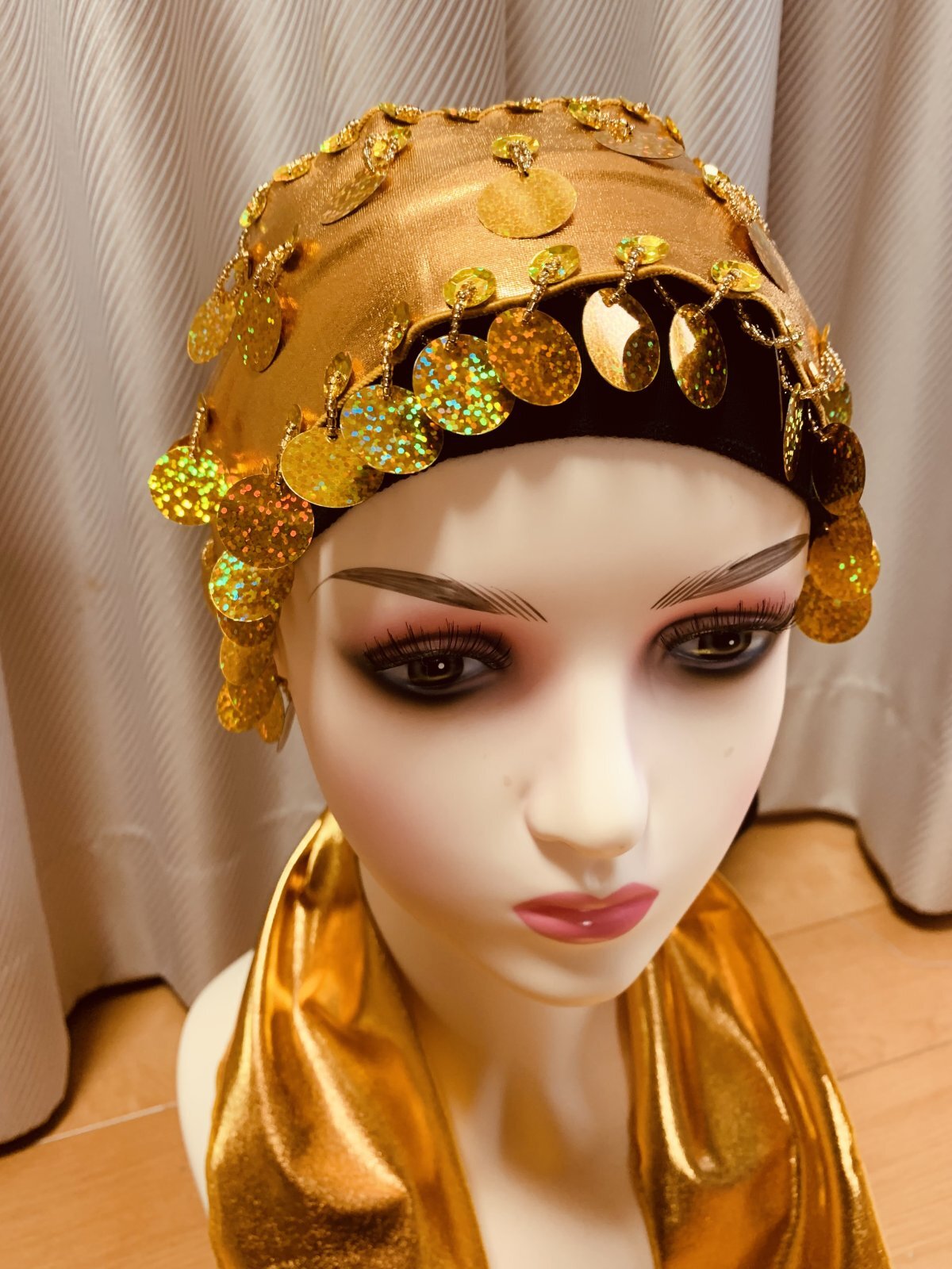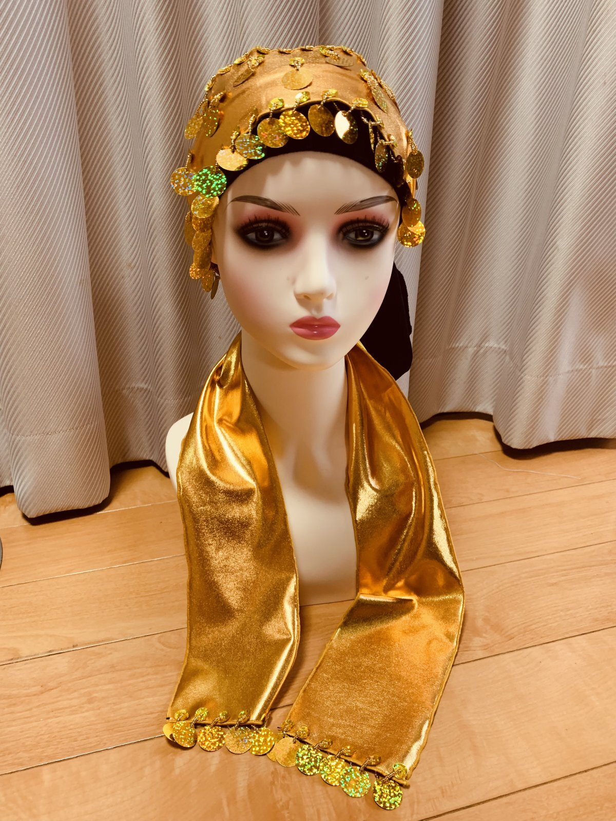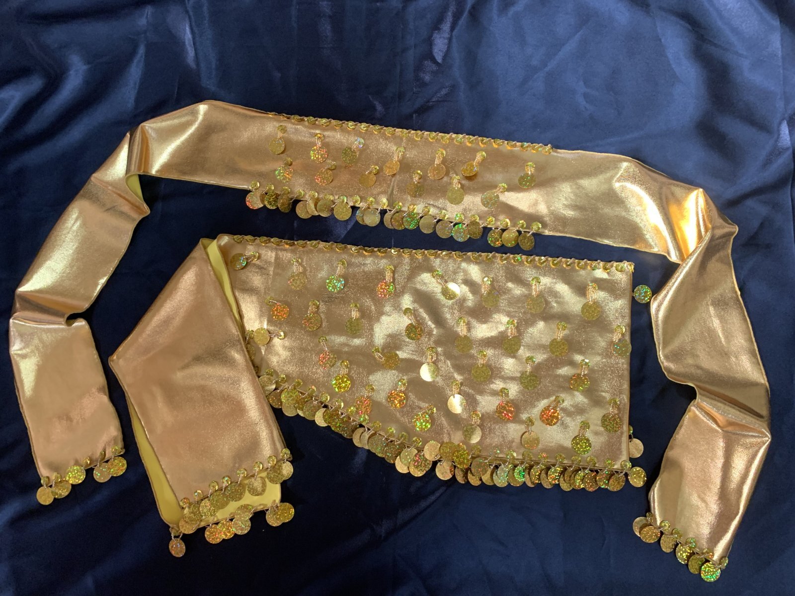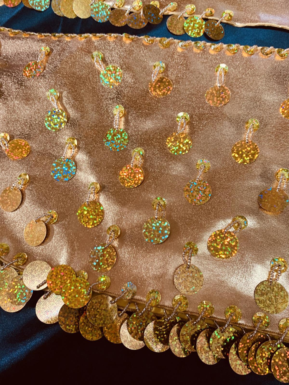 こちらはバラディ衣装などにプラスできるヘッド&ヒップスカーフのセット商品になります。ハニーンが1点1点お作りしております!!何か物足りないバラディやサイーディドレスにプラスするだけで、揺れるフリンジが華やかさをプラスしてくれます。超軽量ですので、初心者さんにも大人気!! ■商品名:コインスパンコール付きヘッド&ヒップスカーフセット■カラー・ゴールド■ヒップスカーフ・約150cm(装飾部分は約90cm) ■その他・1点1点ハンドメイドでお作りしておりますので若干、サイズに誤差がある場合もございます。・ベースの生地はストレッチになります
