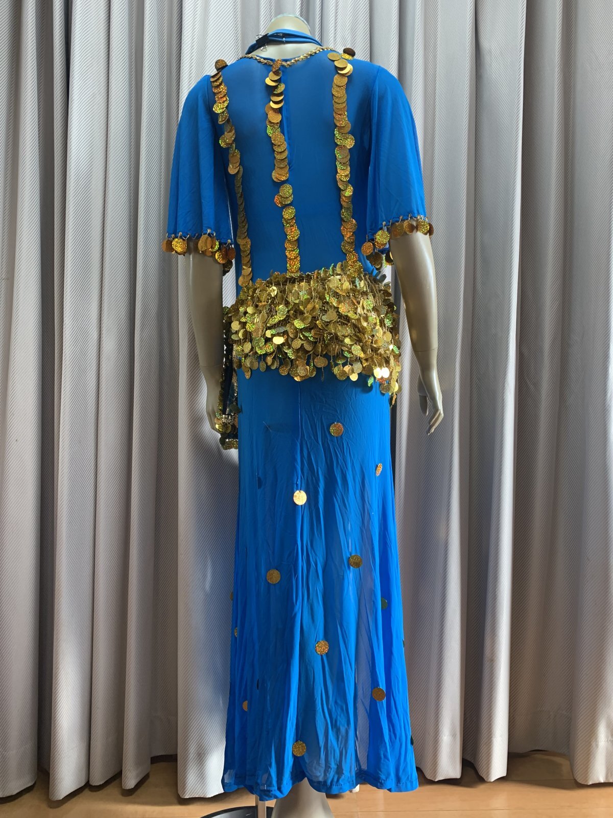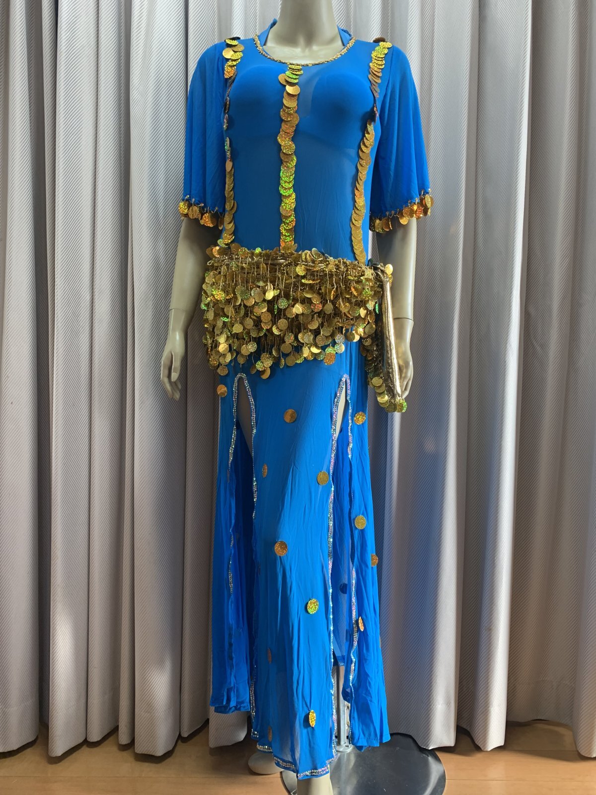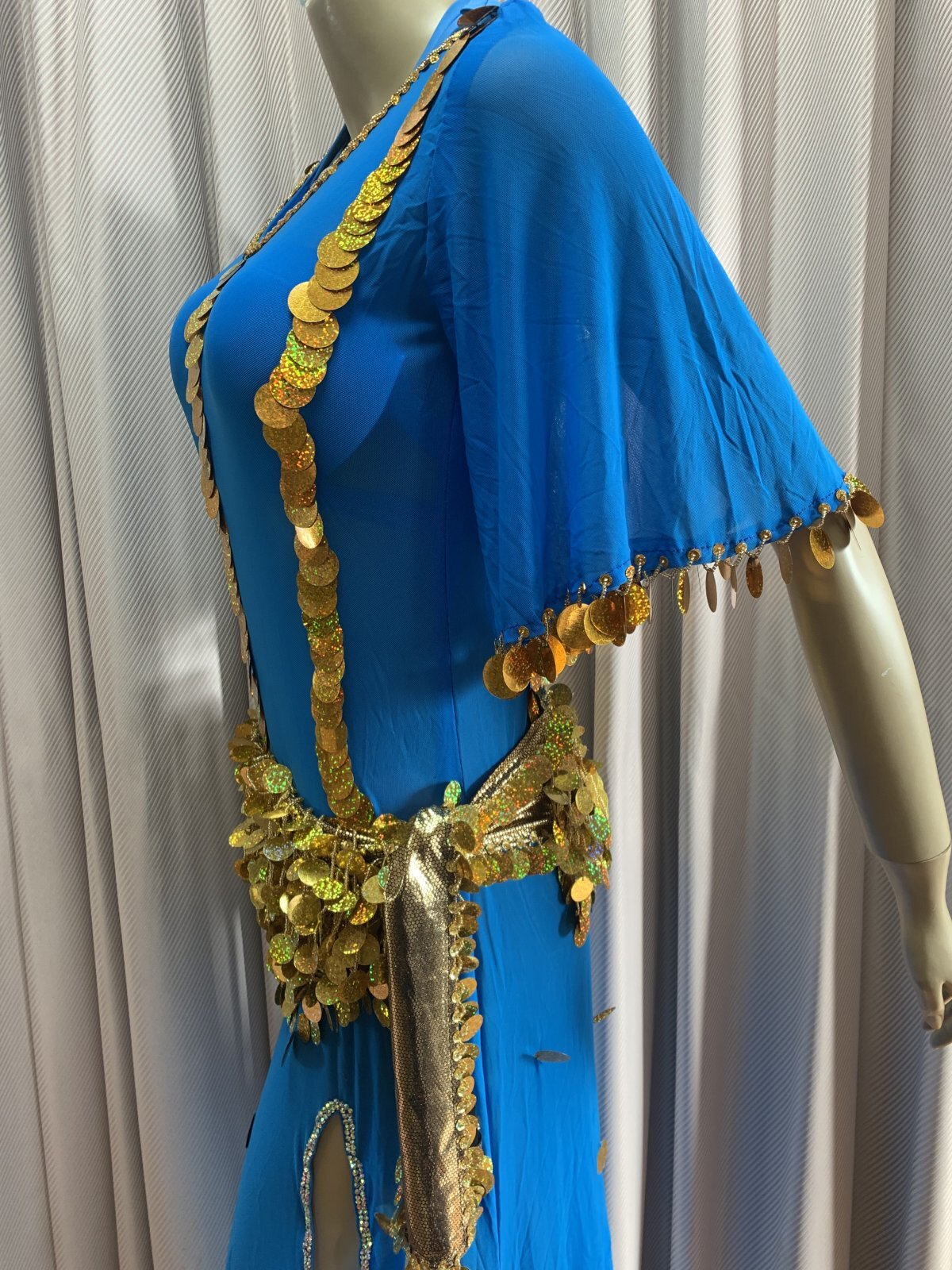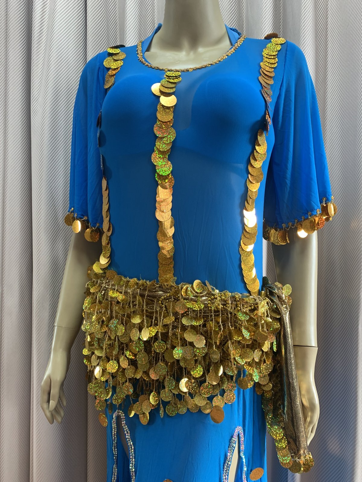 シャマダンやアワーレムの演目におすすめのパワーネットのワンピースドレス。お袖は可愛らしく広がるフレアスリーブに!こちらはレジェンドダンサーのタヒア・カリオカが映画で着用していたドレスをもとにオマージュしたデザインになります。(動画参照)パワーネットを用いているため、とても軽量で伸縮性にも優れたワンピースに仕上がっております。ドレスと同じカラーのブラカップ、アンダーショーツ、ヘッドバンドそして、着回ししやすいゴールドのヒップスカーフが付属されています。 ■商品名:シャマダン・アワーレムパワーネットワンピースドレス ■カラーカラー:ターコイズスパンコール、ビーズ:ゴールド■ドレスのサイズ・丈:平置き約135cm・身幅:約40cm※伸縮性があります・ブラカップ:B〜Eカップ ※パット入り ■付属品・ヘッドスカーフ・ブラカップ・アンダーショーツ・ヒップスカーフ ■その他 ・群舞でご使用の場合はオーダーも承ります(基本、5着以上からお願いしておりますが、要相談)