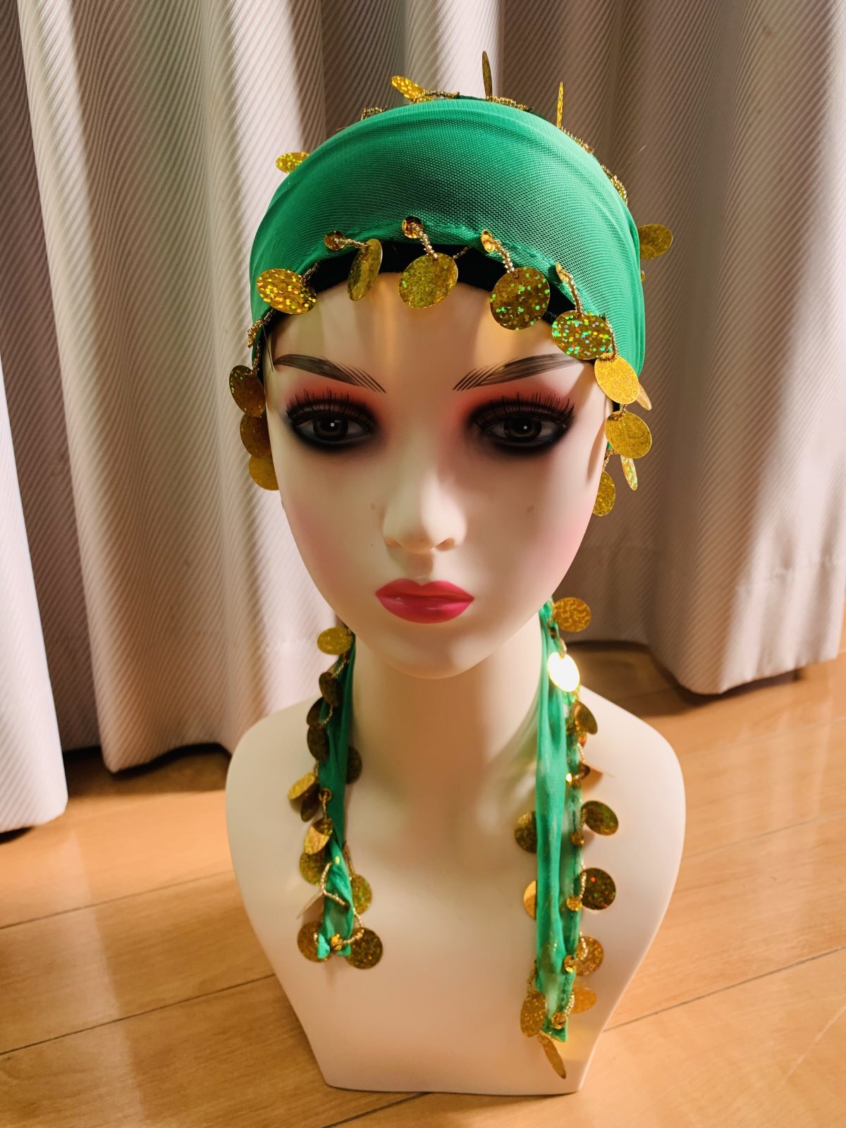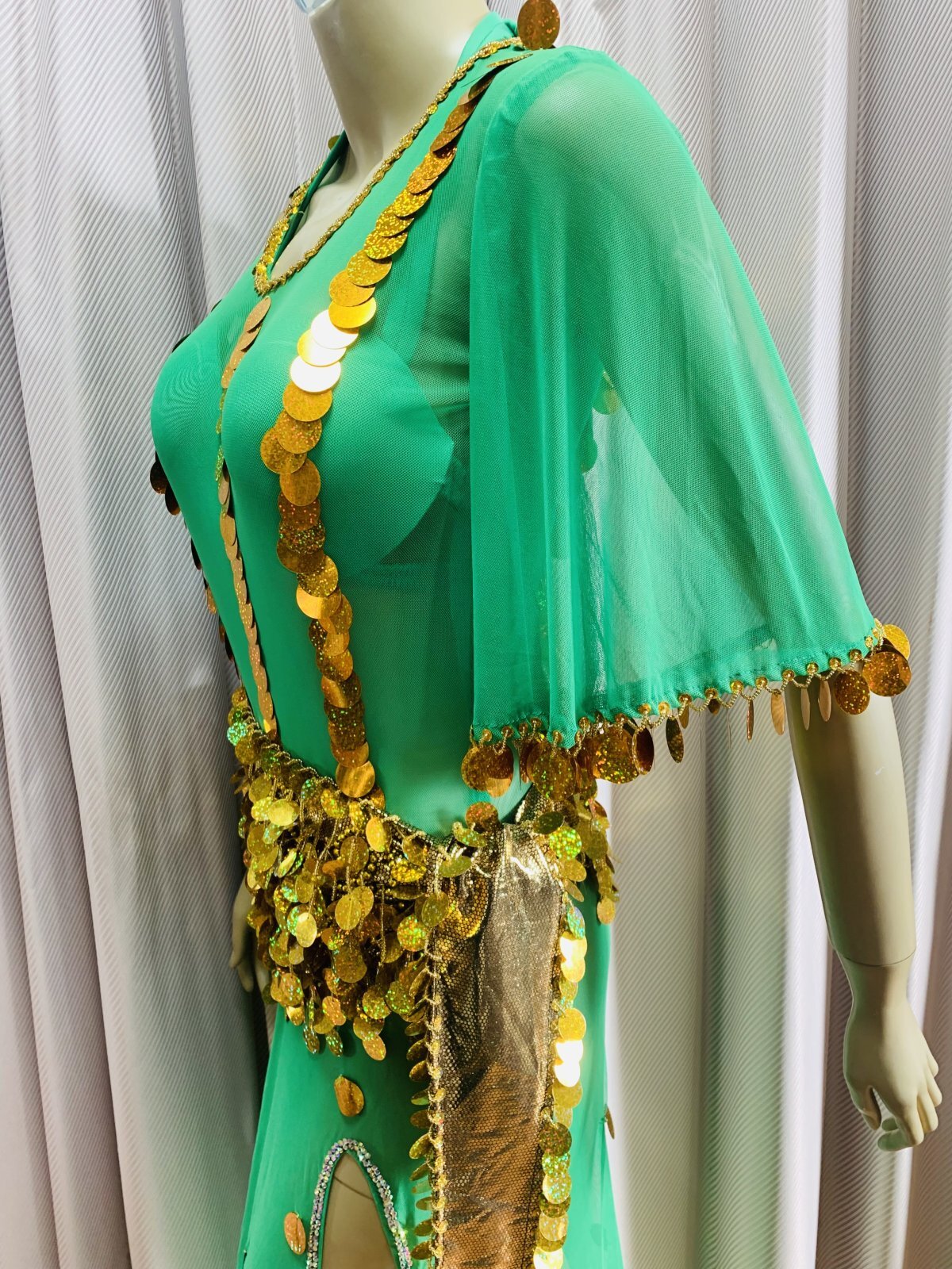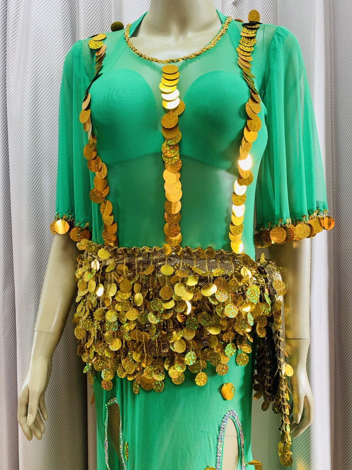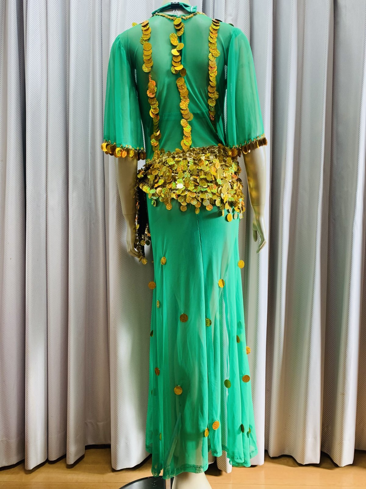 シャマダンやアワーレムの演目におすすめのパワーネットのワンピースドレス。お袖は可愛らしく広がるフレアスリーブに!こちらはレジェンドダンサーのタヒア・カリオカが映画で着用していたドレスをもとにオマージュしたデザインになります。(動画参照)パワーネットを用いているため、とても軽量で伸縮性にも優れたワンピースに仕上がっております。ドレスと同じカラーのブラカップ、アンダーショーツ、ヘッドバンドそして、着回ししやすいゴールドのヒップスカーフが付属されています。 ■商品名:シャマダン・アワーレムパワーネットワンピースドレス ■カラーカラー:グリーンスパンコール、ビーズ:ゴールド■ドレスのサイズ・丈:平置き約135cm・身幅:約40cm※伸縮性があります・ブラカップ:B〜Eカップ ※パット入り ■付属品・ヘッドスカーフ・ブラカップ・アンダーショーツ・ヒップスカーフ ■その他 ・群舞でご使用の場合はオーダーも承ります(基本、5着以上からお願いしておりますが、要相談)