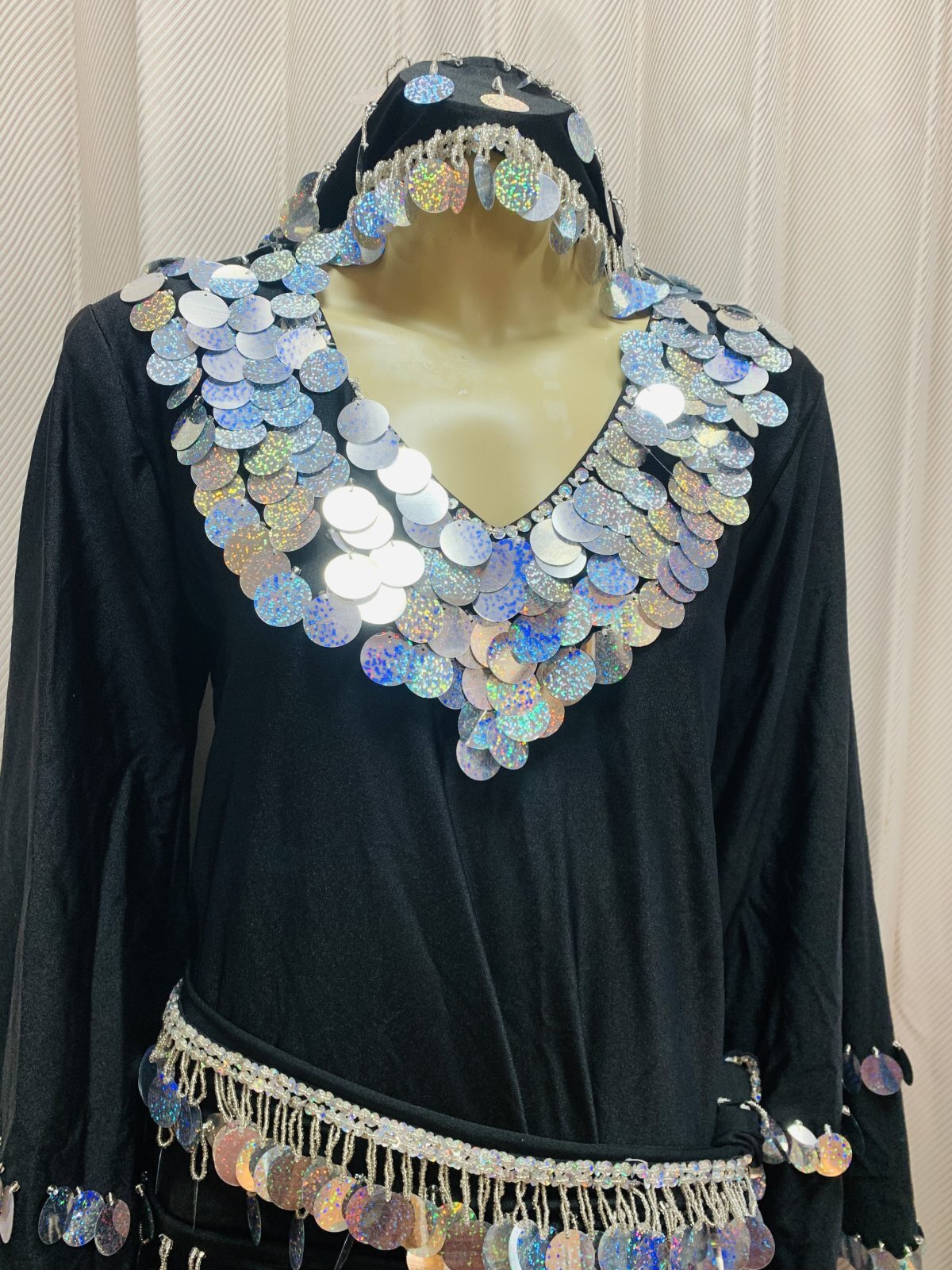 伸縮性に優れた厚手のライクラを使用しサイーディ、ガワージー向けのドレスをお作りしました!※群舞用の衣装オーダーはご相談ください。付属のヘッドスカーフ、ヒップスカーフはシンプルかつスパンコールたっぷりですので他のサイーディやバラディドレスなどと一緒にお使いいただいてもOK!!サイズは大柄な方でも対応できるよう少し大き目なサイズでご用意しております。細身の方、体にフィットさせて着用されたい方はタックを入れるなど身幅を詰めてサイズ調整をお願いいたします。 ■商品名:サイーディ、ガワージードレス ■カラーカラー:ブラック×シルバー■ドレスのサイズ・丈:約140cm・身幅:約45cm・袖丈:約58cm※おおよその目安となります ■付属品・ヘッドスカーフ・コインヒップスカーフ ■その他・群舞等で複数枚、必要となる方はオーダーも可能ですのでお気軽にお問い合わせください※オーダーは基本5着以上からとなります。サイズはS、M、Lでの指定。好きなカラーをお選びいただけますが、在庫がない場合はご希望に添えないこともございます。