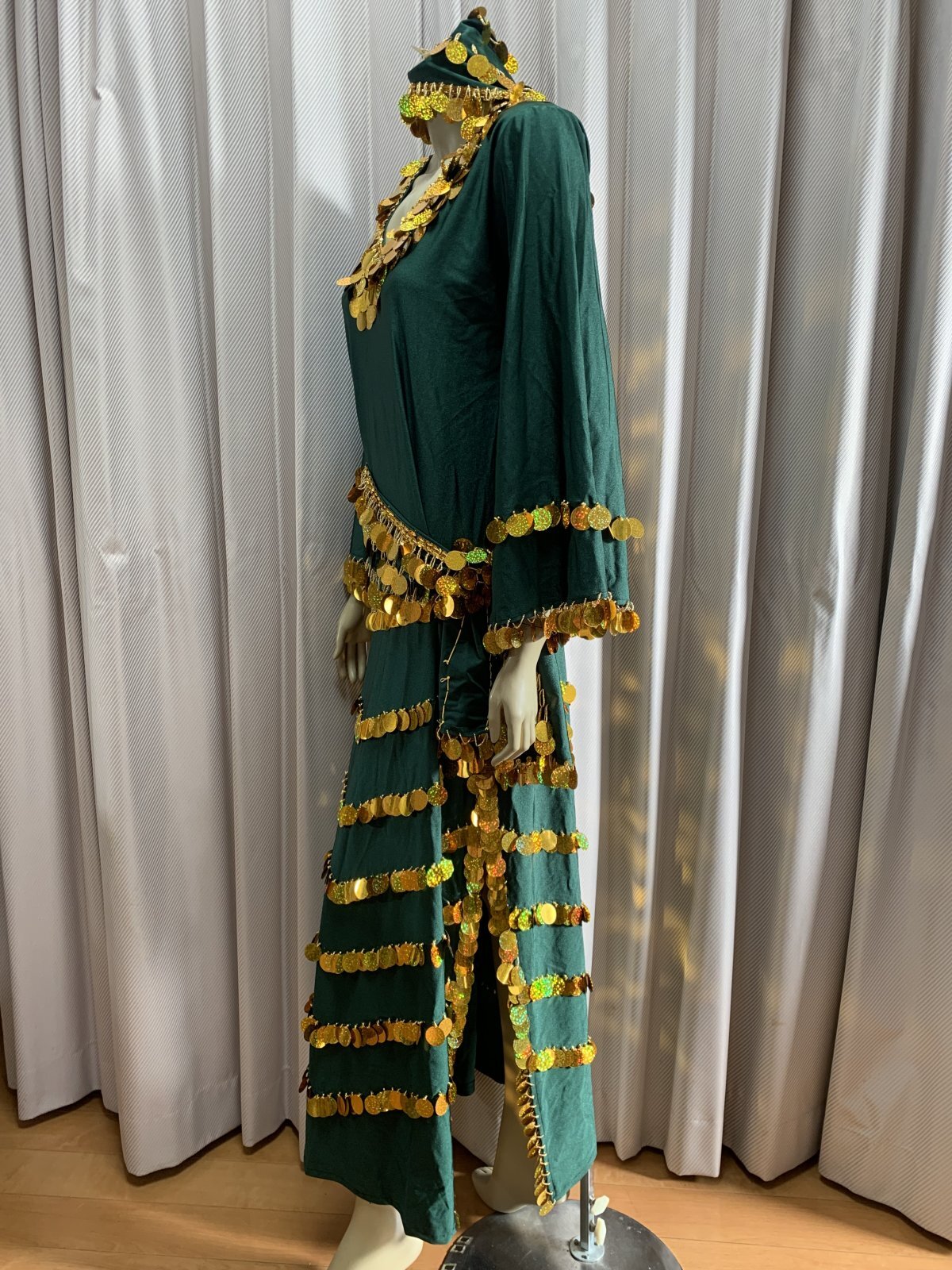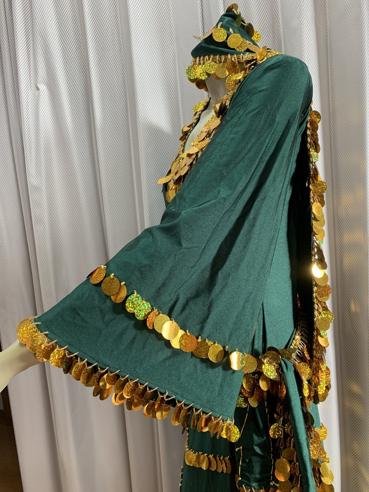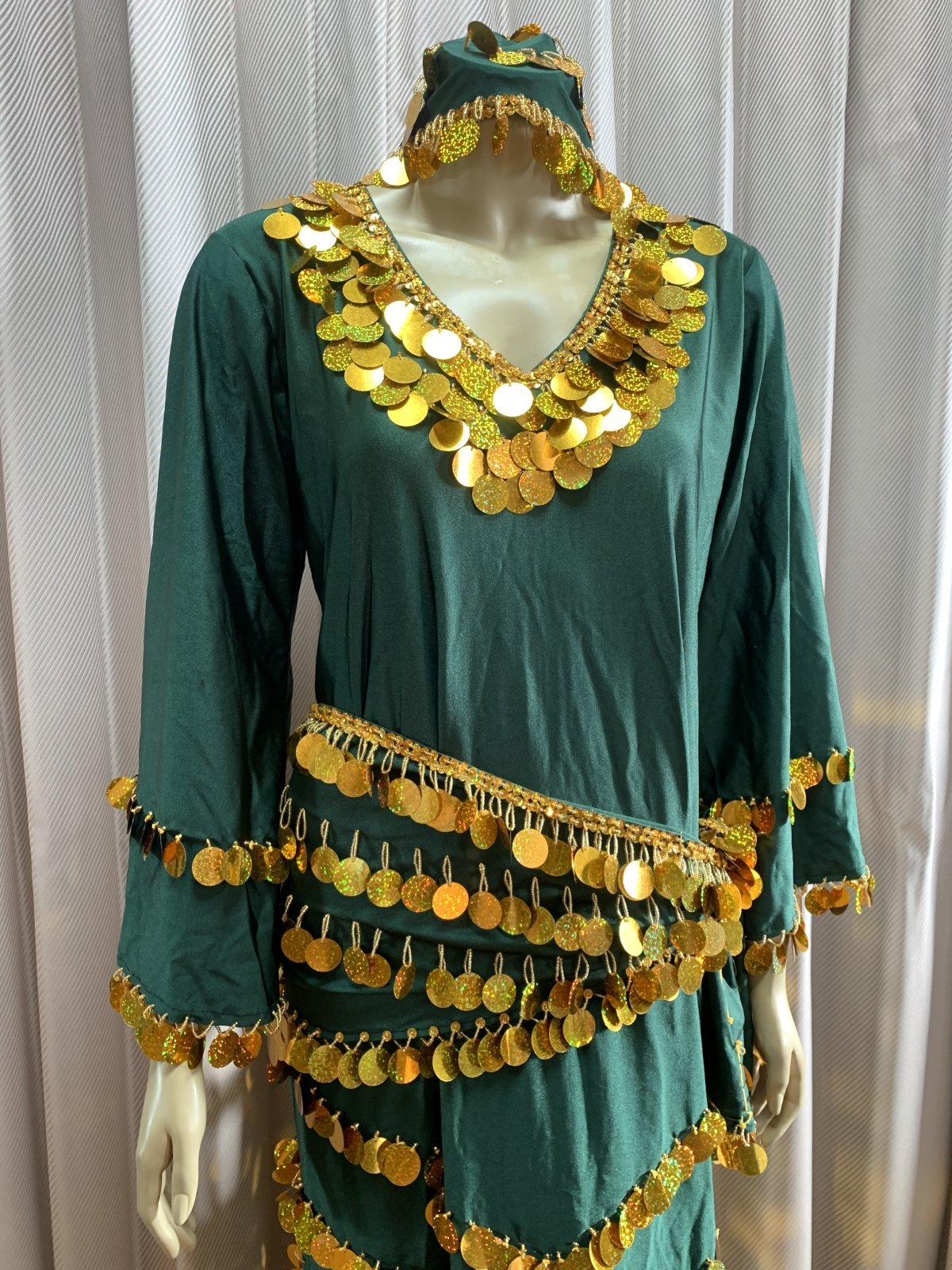 伸縮性に優れた厚手のライクラを使用しサイーディ、ガワージー向けのドレスをお作りしました!※群舞用の衣装オーダーはご相談ください。付属のヘッドスカーフ、ヒップスカーフはシンプルかつスパンコールたっぷりですので他のサイーディやバラディドレスなどと一緒にお使いいただいてもOK!!サイズは大柄な方でも対応できるよう少し大き目なサイズでご用意しております。細身の方、体にフィットさせて着用されたい方はタックを入れるなど身幅を詰めてサイズ調整をお願いいたします。 ■商品名:サイーディ、ガワージードレス ■カラーカラー:ボトルグリーン×ゴールド■ドレスのサイズ・丈:約140cm・身幅:約45cm・袖丈:約58cm※おおよその目安となります ■付属品・ヘッドスカーフ・コインヒップスカーフ ■その他・群舞等で複数枚、必要となる方はオーダーも可能ですのでお気軽にお問い合わせください※オーダーは基本5着以上からとなります。サイズはS、M、Lでの指定。好きなカラーをお選びいただけますが、在庫がない場合はご希望に添えないこともございます。