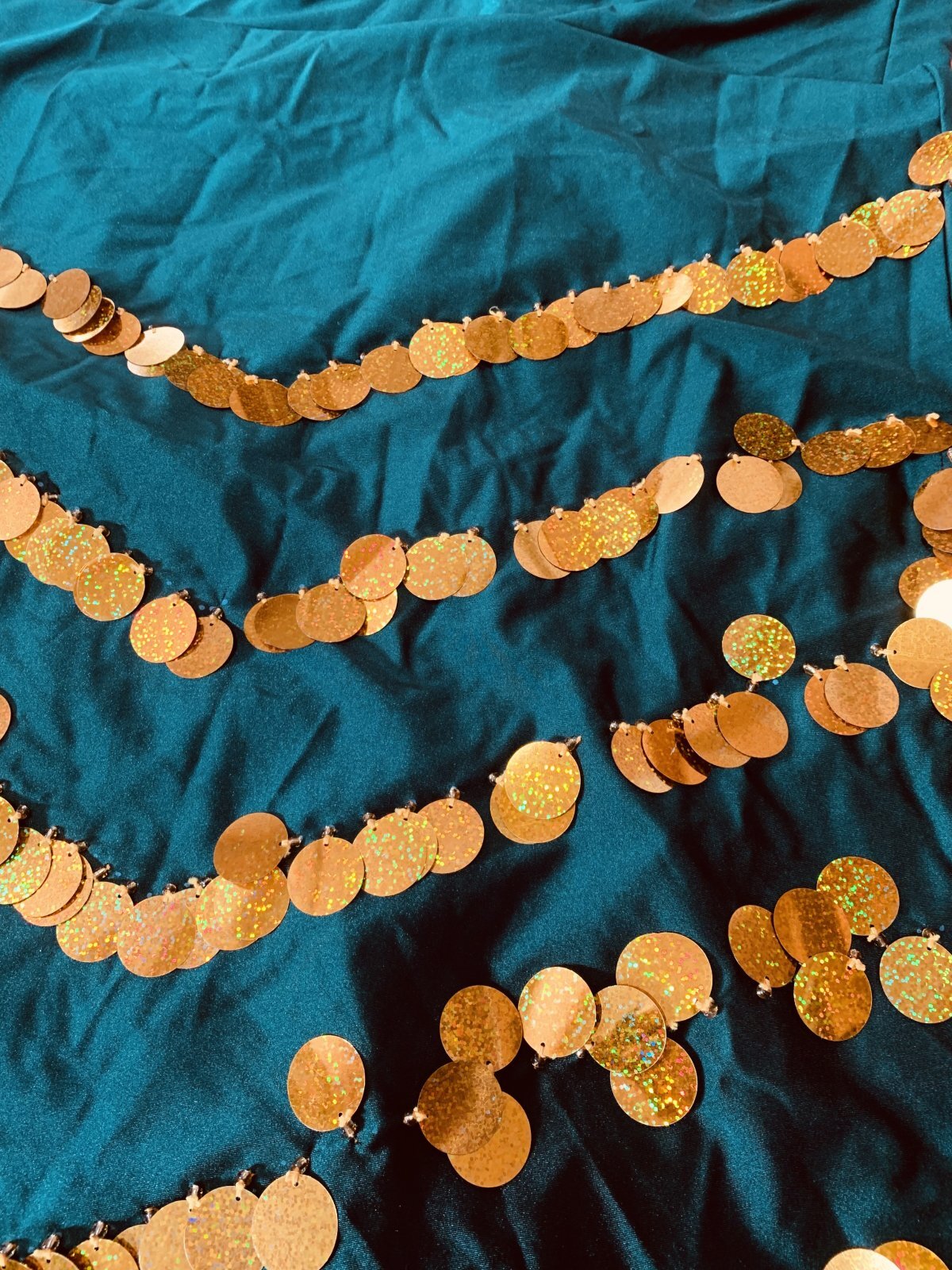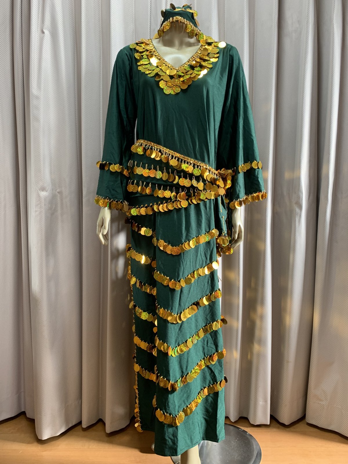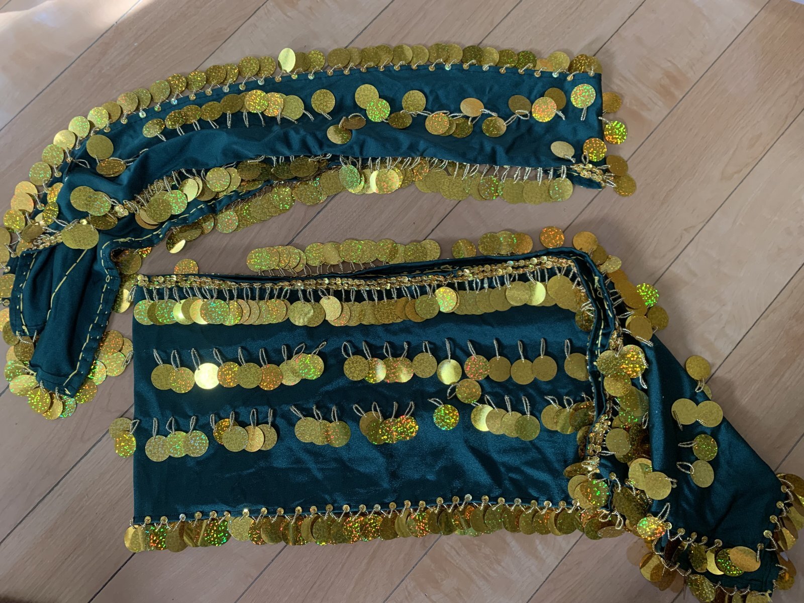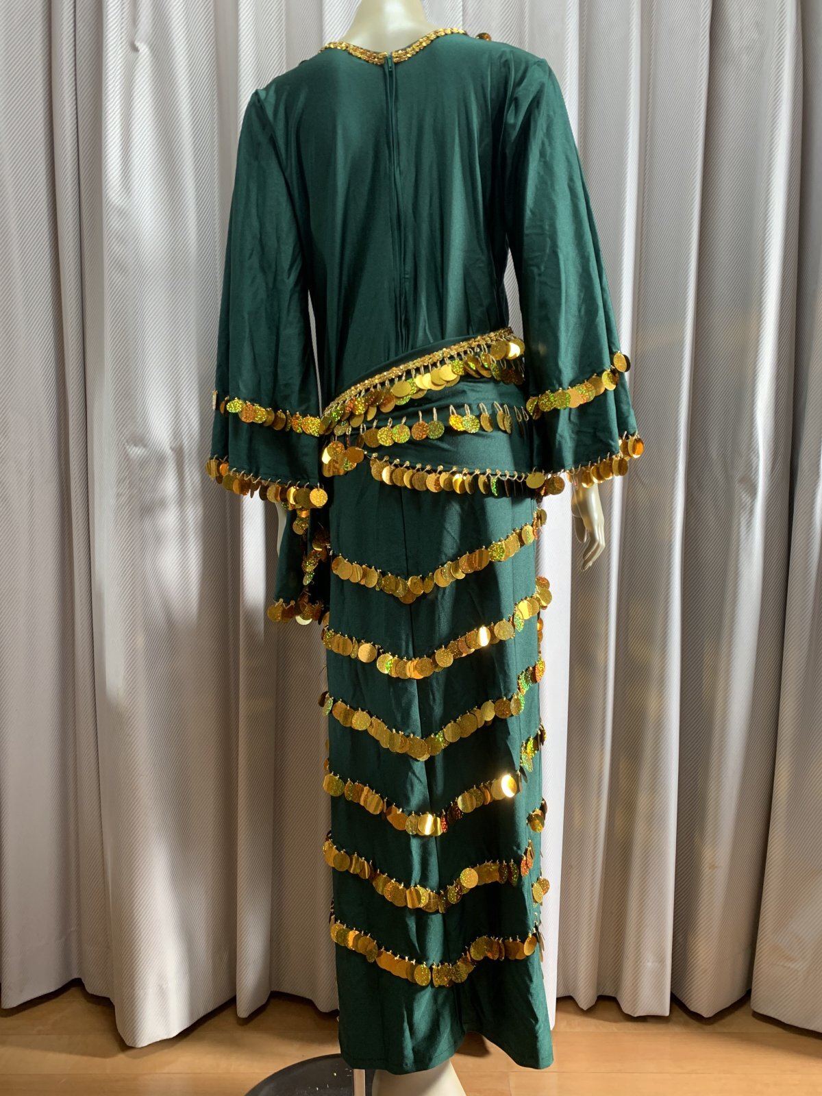 伸縮性に優れた厚手のライクラを使用しサイーディ、ガワージー向けのドレスをお作りしました!※群舞用の衣装オーダーはご相談ください。付属のヘッドスカーフ、ヒップスカーフはシンプルかつスパンコールたっぷりですので他のサイーディやバラディドレスなどと一緒にお使いいただいてもOK!!サイズは大柄な方でも対応できるよう少し大き目なサイズでご用意しております。細身の方、体にフィットさせて着用されたい方はタックを入れるなど身幅を詰めてサイズ調整をお願いいたします。 ■商品名:サイーディ、ガワージードレス ■カラーカラー:ボトルグリーン×ゴールド■ドレスのサイズ・丈:約140cm・身幅:約45cm・袖丈:約58cm※おおよその目安となります ■付属品・ヘッドスカーフ・コインヒップスカーフ ■その他・群舞等で複数枚、必要となる方はオーダーも可能ですのでお気軽にお問い合わせください※オーダーは基本5着以上からとなります。サイズはS、M、Lでの指定。好きなカラーをお選びいただけますが、在庫がない場合はご希望に添えないこともございます。