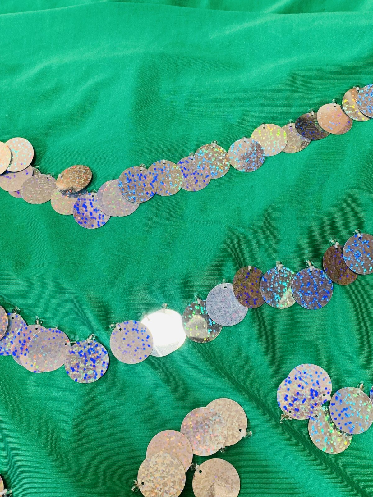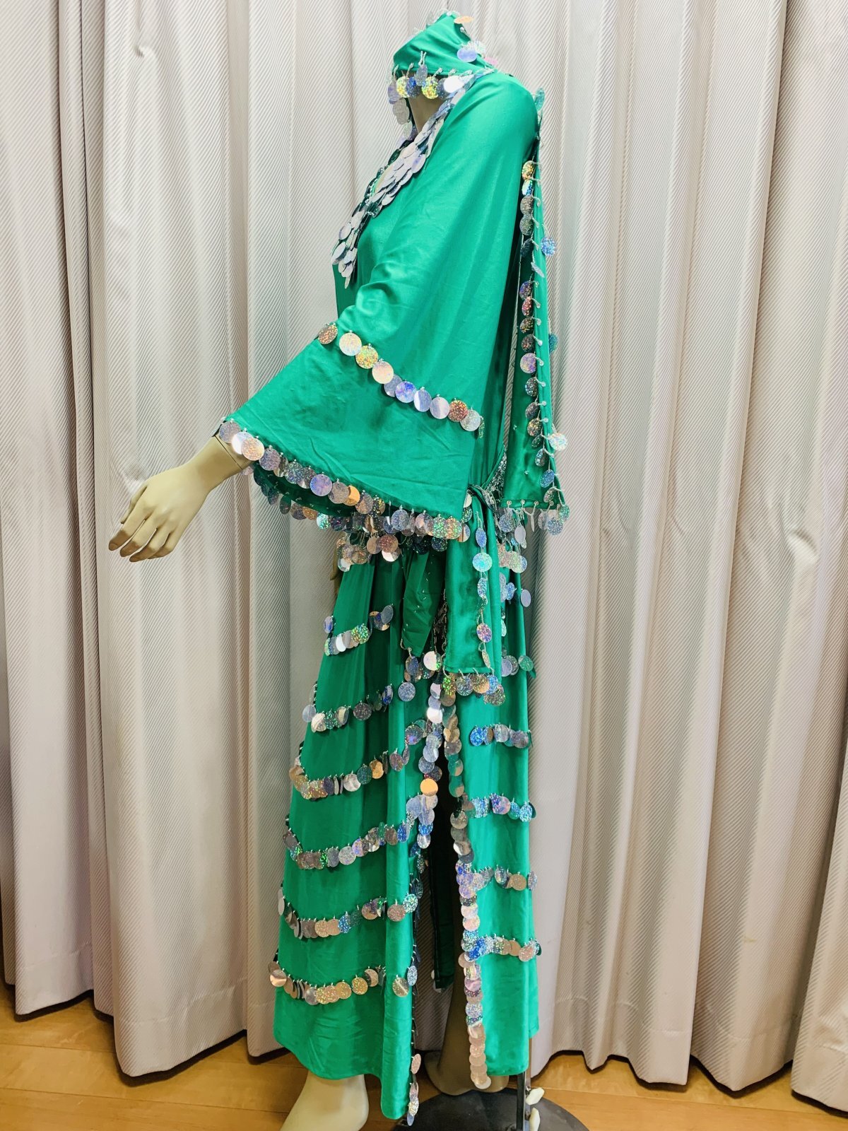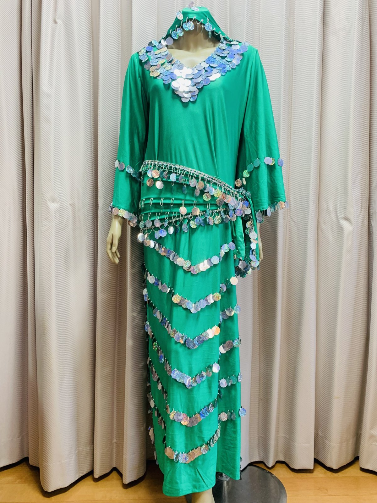 伸縮性に優れた厚手のライクラを使用しサイーディ、ガワージー向けのドレスをお作りしました!※群舞用の衣装オーダーはご相談ください。付属のヘッドスカーフ、ヒップスカーフはシンプルかつスパンコールたっぷりですので他のサイーディやバラディドレスなどと一緒にお使いいただいてもOK!!サイズは大柄な方でも対応できるよう少し大き目なサイズでご用意しております。細身の方、体にフィットさせて着用されたい方はタックを入れるなど身幅を詰めてサイズ調整をお願いいたします。 ■商品名:サイーディ、ガワージードレス ■カラーカラー:エメラルドグリーン×シルバー■ドレスのサイズ・丈:約140cm・身幅:約45cm・袖丈:約58cm※おおよその目安となります ■付属品・ヘッドスカーフ・コインヒップスカーフ ■その他・群舞等で複数枚、必要となる方はオーダーも可能ですのでお気軽にお問い合わせください※オーダーは基本5着以上からとなります。サイズはS、M、Lでの指定。好きなカラーをお選びいただけますが、在庫がない場合はご希望に添えないこともございます。