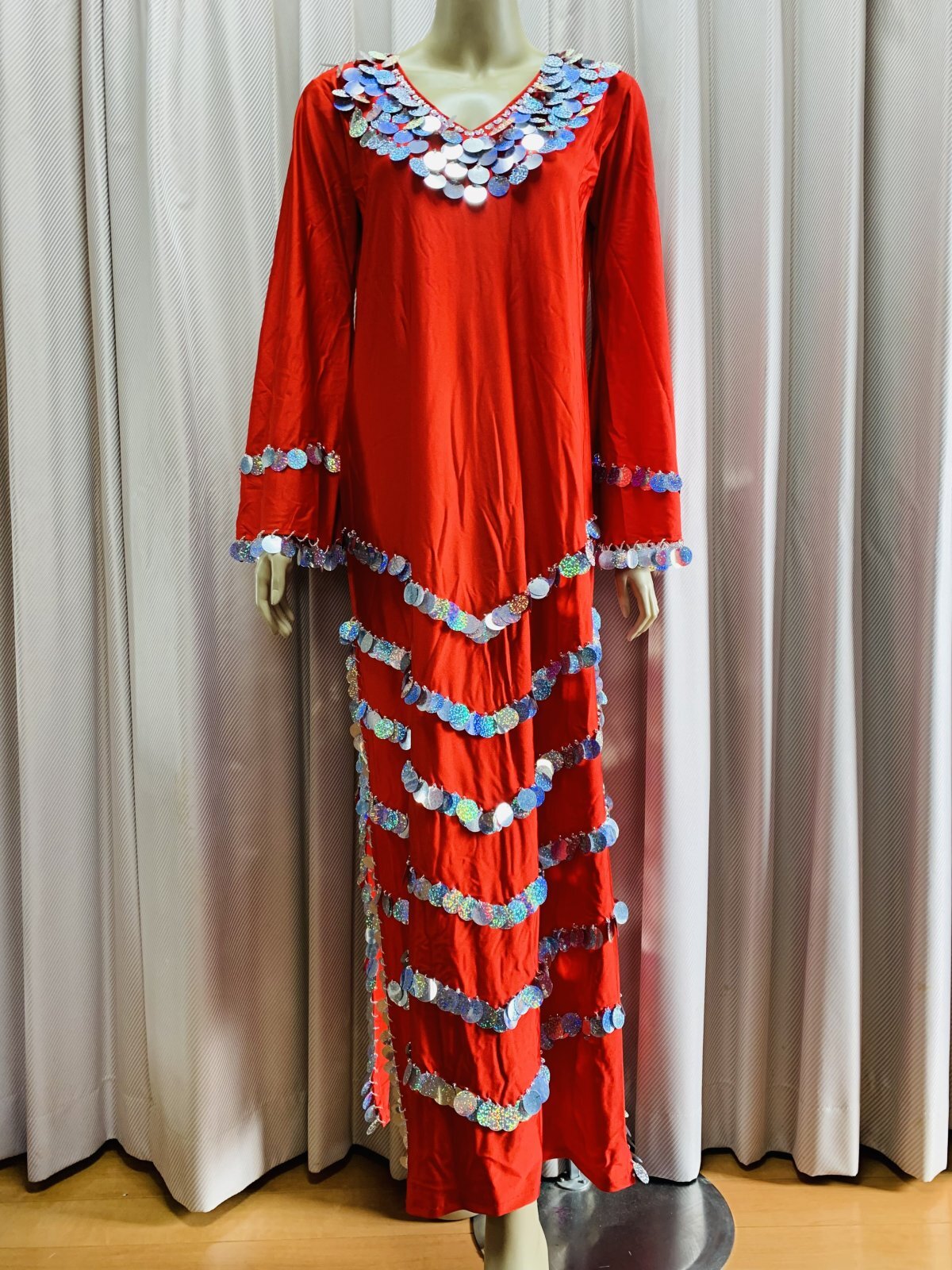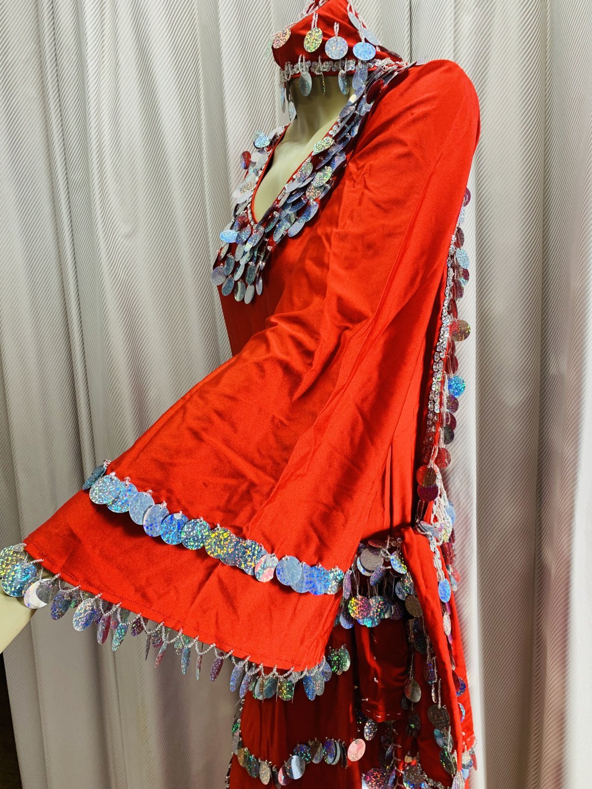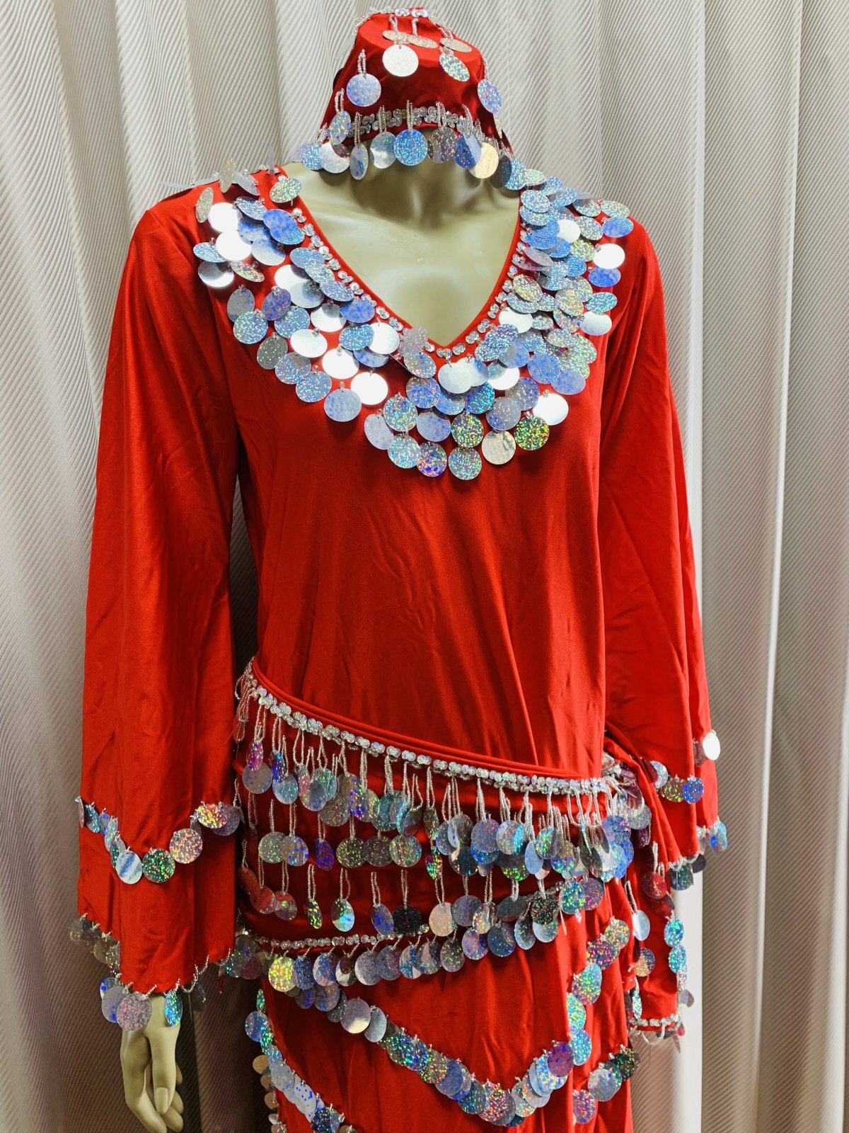 伸縮性に優れた厚手のライクラを使用しサイーディ、ガワージー向けのドレスをお作りしました!※群舞用の衣装オーダーはご相談ください。付属のヘッドスカーフ、ヒップスカーフはシンプルかつスパンコールたっぷりですので他のサイーディやバラディドレスなどと一緒にお使いいただいてもOK!!サイズは大柄な方でも対応できるよう少し大き目なサイズでご用意しております。細身の方、体にフィットさせて着用されたい方はタックを入れるなど身幅を詰めてサイズ調整をお願いいたします。 ■商品名:サイーディ、ガワージードレス ■カラーカラー:レッド×シルバー■ドレスのサイズ・丈:約140cm・身幅:約45cm・袖丈:約58cm※おおよその目安となります ■付属品・ヘッドスカーフ・コインヒップスカーフ ■その他・群舞等で複数枚、必要となる方はオーダーも可能ですのでお気軽にお問い合わせください※オーダーは基本5着以上からとなります。サイズはS、M、Lでの指定。好きなカラーをお選びいただけますが、在庫がない場合はご希望に添えないこともございます。