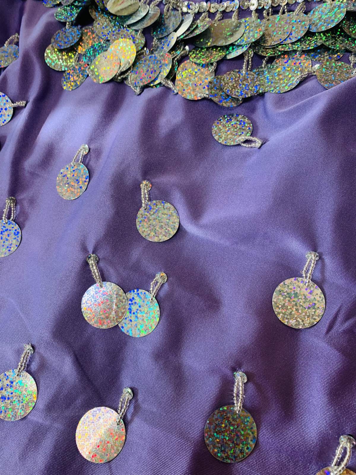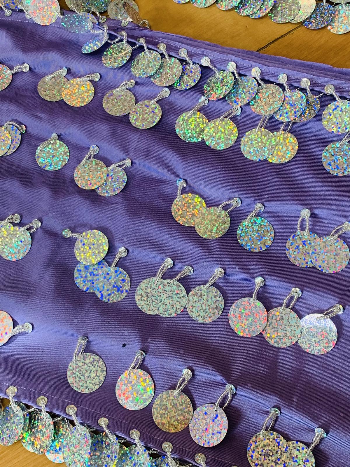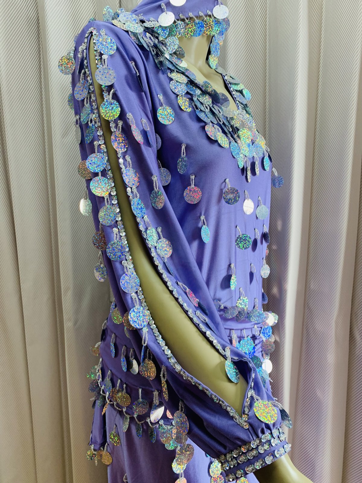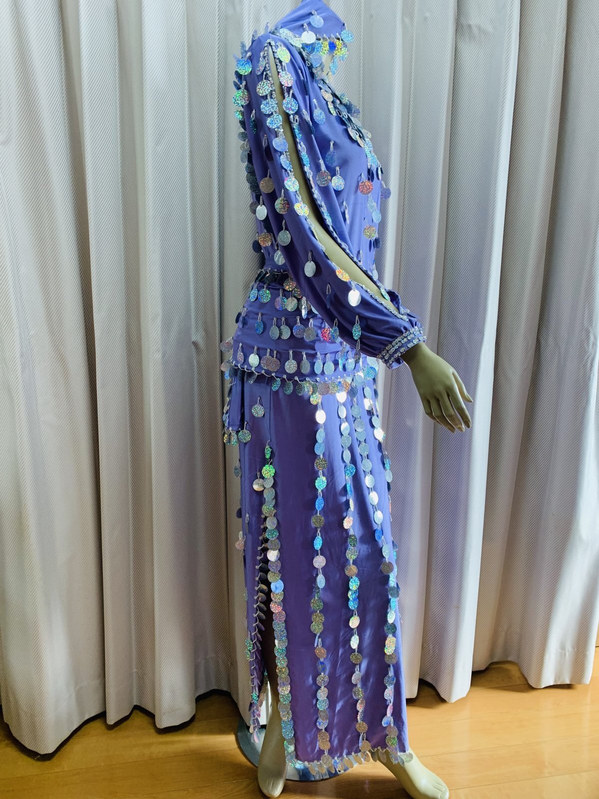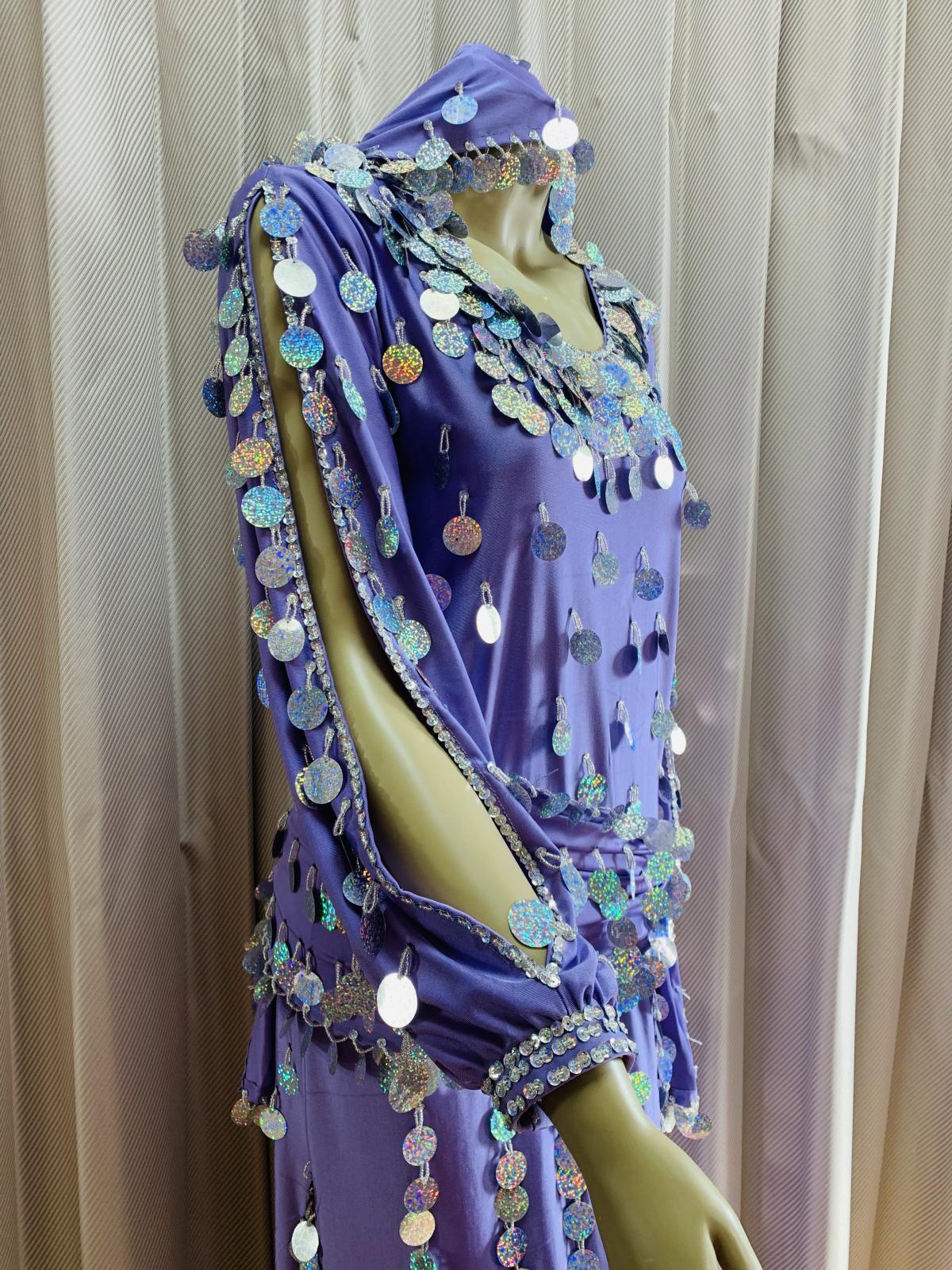 コインスパンコールをふんだんにあしらったガラベーヤお袖にスリットが入ったデザインで素肌がのぞく可愛らしいデザインです。アワーリムのカテゴリに掲載させていただきましたが、ジャラジャラっとコインアクセサリーをプラスしたり、合わせるアクセサリーやヒップスカーフなどによってはガワージーにも落とし込めるデザインです。マルチに活躍できる便利な衣装!群舞用オーダーも受け付けておりますのでお気軽にお問合せください ■商品名:アワーリム、ガワージーガラベーヤ ■カラーカラー:ラベンダースパンコール:シルバー■ドレスのサイズ・丈:約140cm・身幅:約48cm・袖丈:約60cm ■付属品・ヒップスカーフ、ヘッドスカーフ■その他・ストレッチのきいた生地を使用しています・コインスパンコールをふんだんに使用しておりますので多少重みのある衣装となります