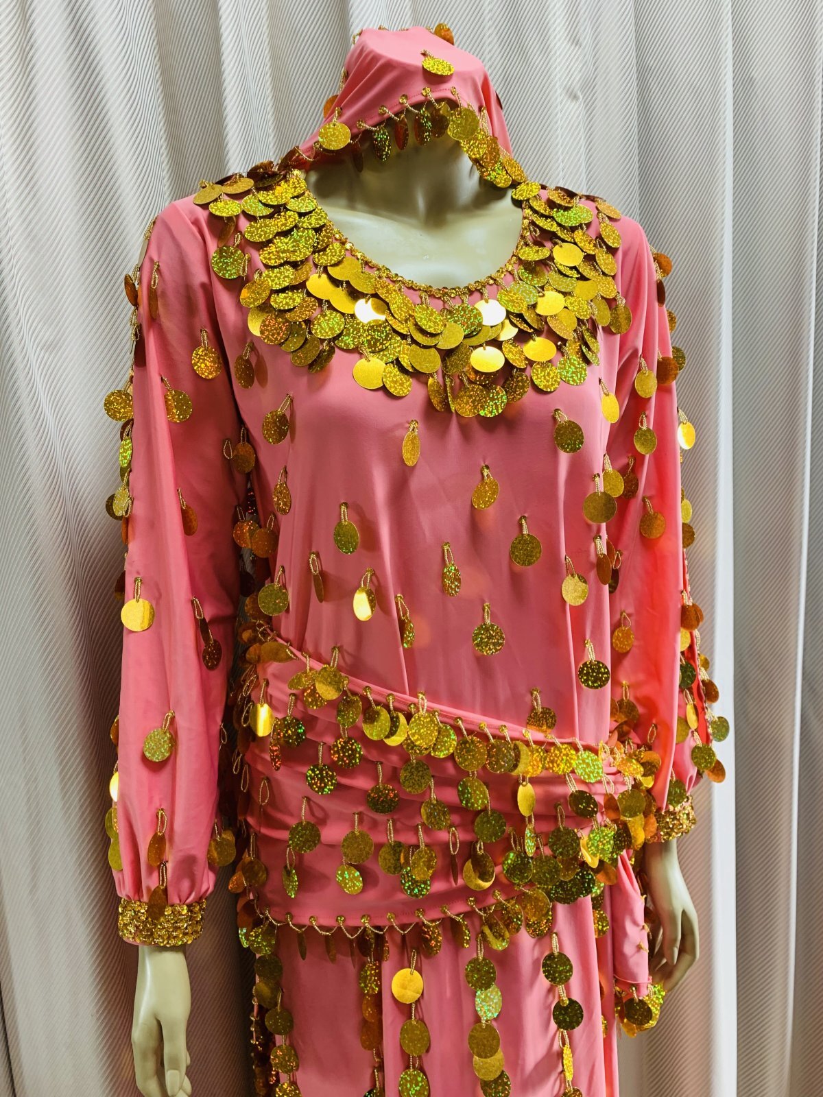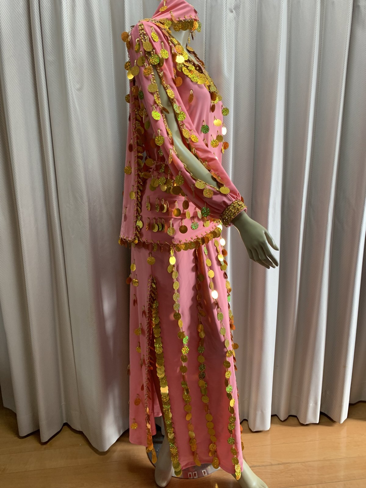 コインスパンコールをふんだんにあしらったガラベーヤお袖にスリットが入ったデザインで素肌がのぞく可愛らしいデザインです。アワーリムのカテゴリに掲載させていただきましたが、ジャラジャラっとコインアクセサリーをプラスしたり、合わせるアクセサリーやヒップスカーフなどによってはガワージーにも落とし込めるデザインです。マルチに活躍できる便利な衣装!群舞用オーダーも受け付けておりますのでお気軽にお問合せください ■商品名:アワーリム、ガワージーガラベーヤ ■カラーカラー:ライトピンクスパンコール:ゴールド■ドレスのサイズ・丈:約140cm・身幅:約48cm・袖丈:約60cm ■付属品・ヒップスカーフ、ヘッドスカーフ■その他・ストレッチのきいた生地を使用しています・コインスパンコールをふんだんに使用しておりますので多少重みのある衣装となります