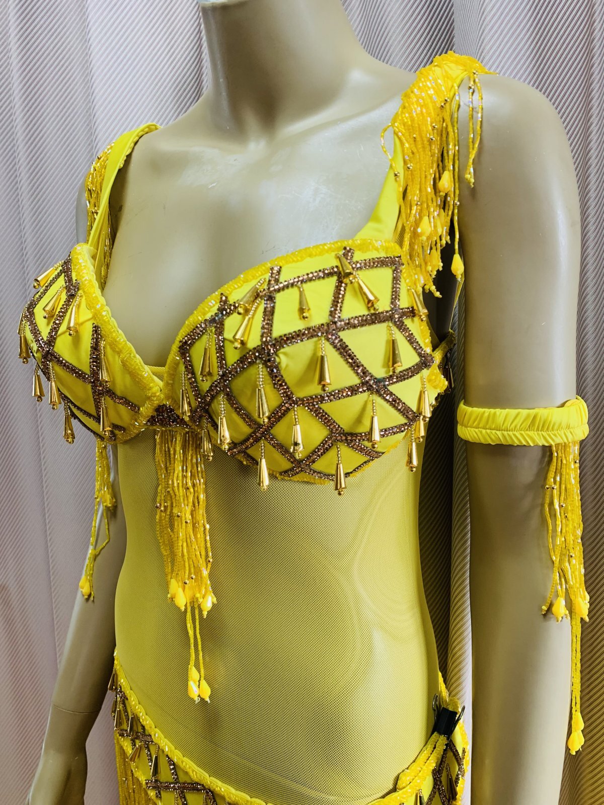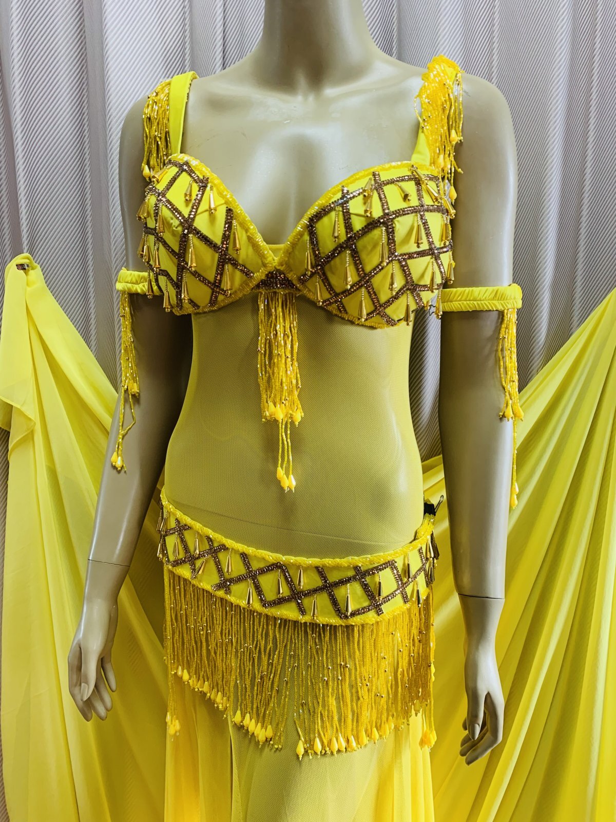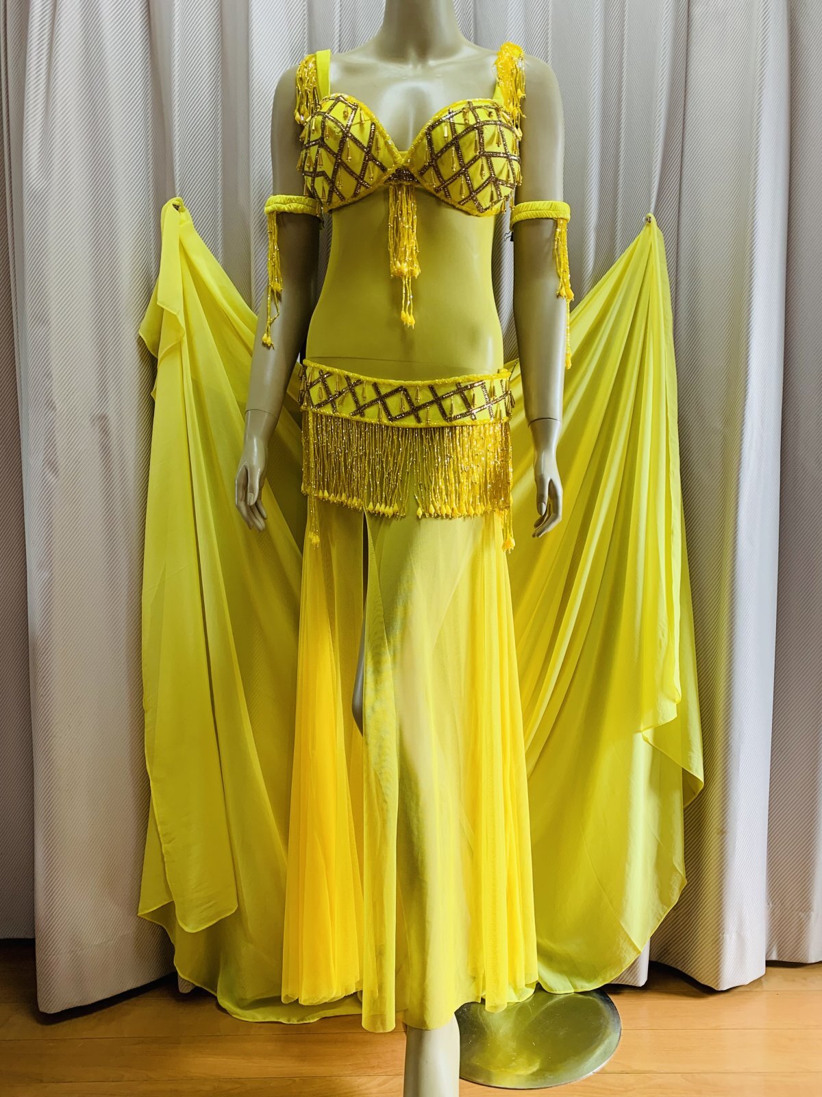 ハニーン特注!キュートなSoheir Zakiをイメージしたブラ&ベルトコスチュームをお作りしました。70-80年代の衣装にはビビットなカラーを取り入れた衣装がたくさん見られます。今回は鮮明で華やか、そしてクリスタルではなく、ビーズ装飾やシフォン素材を取り入れた素朴さと、お腹も隠せるボディネットいらずの便利なワンピース×ブラベルトの組み合わせで仕上がっております。 また、別売りのボリューミーなダブルシフォンスカートなどとコーディネートすればさらにフェミニンな雰囲気に!スカートを変更するだけで様々なコーデを楽しめるのがブラ&ベルト衣装の利点ですよね。ぜひ、いろんなスタイルに挑戦してみてくださいね サイズ等、お質問がありましたらお問い合わせフォームからご連絡ください! ■商品名:70-80's オルドスタイルブラベルトコスチューム■カラー:イエロー■ブラカップ:M-L(約C〜Fカップ)パット入り※サイズはあくまでも目安になります■アンダーバスト:最長80cm■バスト正面(右脇から左脇までの長さ):約34cm■ベルト:最長約98cm■ワンピース丈:約140cm※フロント両サイドにスリット入り■付属品:シフォンベール、アーム、アンダーショーツ(ベージュ)■その他・ワンピースはパワーネットを使用しているため透けます。・シフォンのスカートは別売りになります