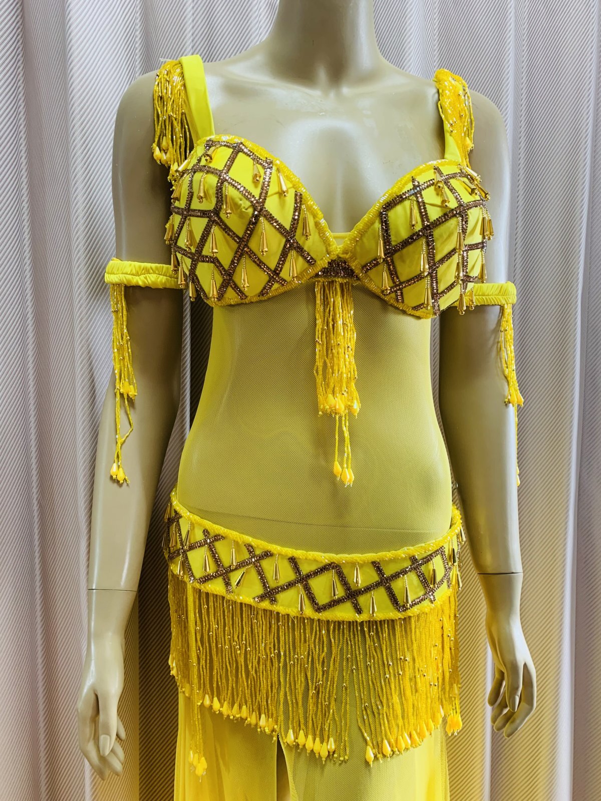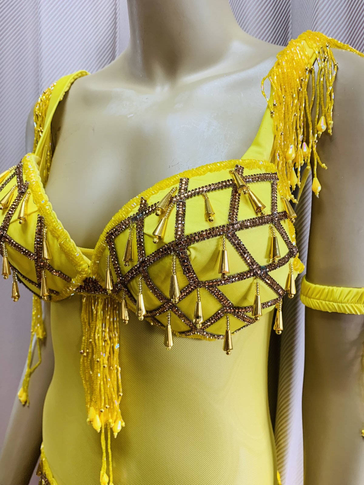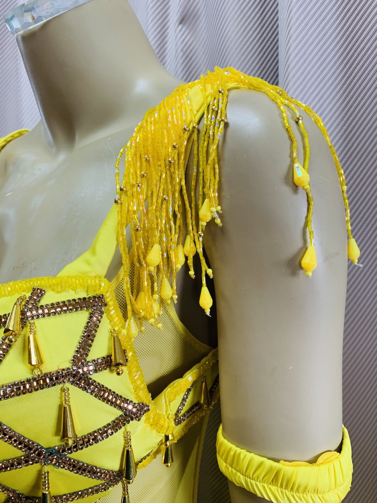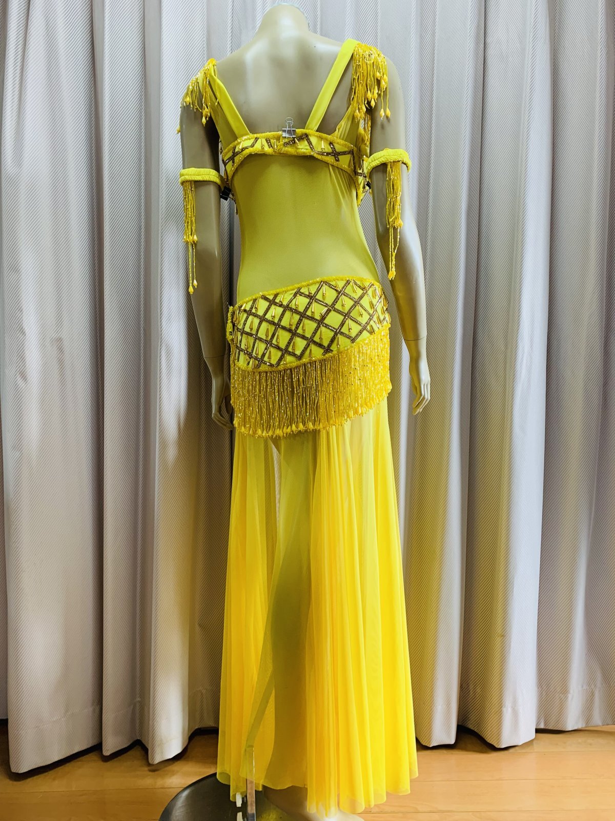 ハニーン特注!キュートなSoheir Zakiをイメージしたブラ&ベルトコスチュームをお作りしました。70-80年代の衣装にはビビットなカラーを取り入れた衣装がたくさん見られます。今回は鮮明で華やか、そしてクリスタルではなく、ビーズ装飾やシフォン素材を取り入れた素朴さと、お腹も隠せるボディネットいらずの便利なワンピース×ブラベルトの組み合わせで仕上がっております。 また、別売りのボリューミーなダブルシフォンスカートなどとコーディネートすればさらにフェミニンな雰囲気に!スカートを変更するだけで様々なコーデを楽しめるのがブラ&ベルト衣装の利点ですよね。ぜひ、いろんなスタイルに挑戦してみてくださいね サイズ等、お質問がありましたらお問い合わせフォームからご連絡ください! ■商品名:70-80's オルドスタイルブラベルトコスチューム■カラー:イエロー■ブラカップ:M-L(約C〜Fカップ)パット入り※サイズはあくまでも目安になります■アンダーバスト:最長80cm■バスト正面(右脇から左脇までの長さ):約34cm■ベルト:最長約98cm■ワンピース丈:約140cm※フロント両サイドにスリット入り■付属品:シフォンベール、アーム、アンダーショーツ(ベージュ)■その他・ワンピースはパワーネットを使用しているため透けます。・シフォンのスカートは別売りになります