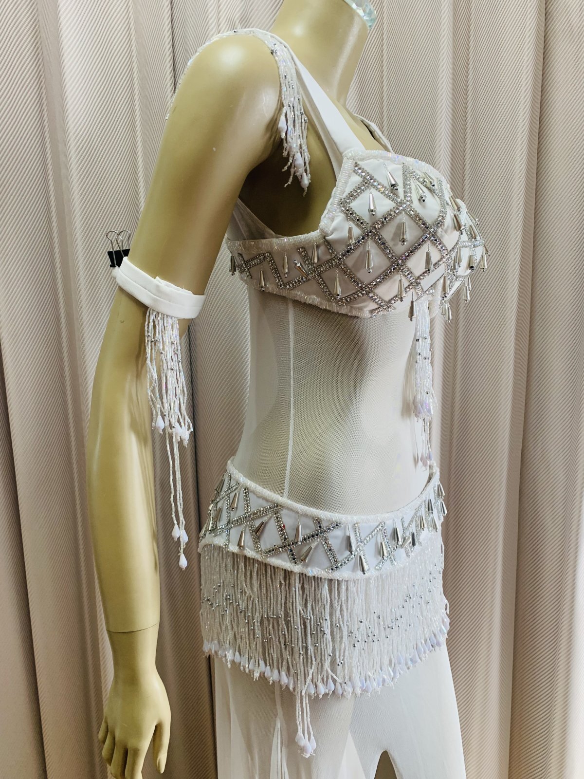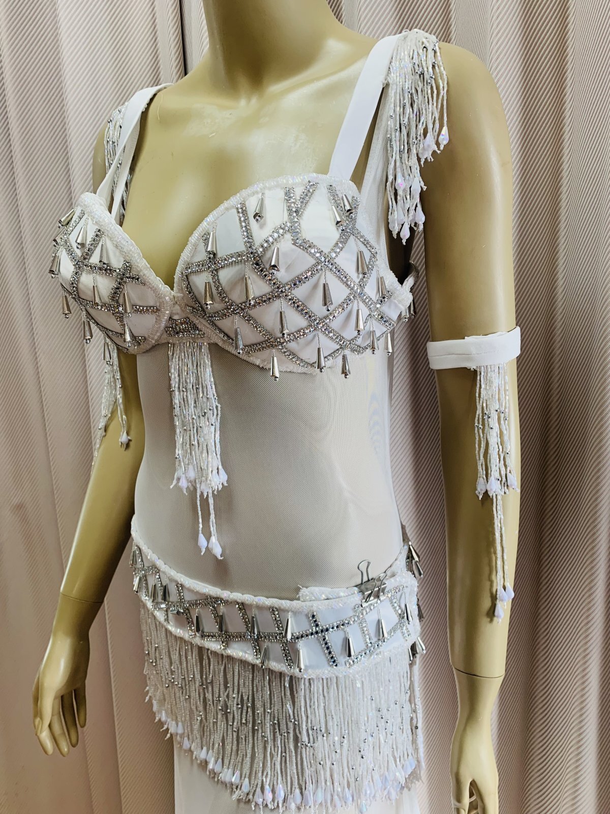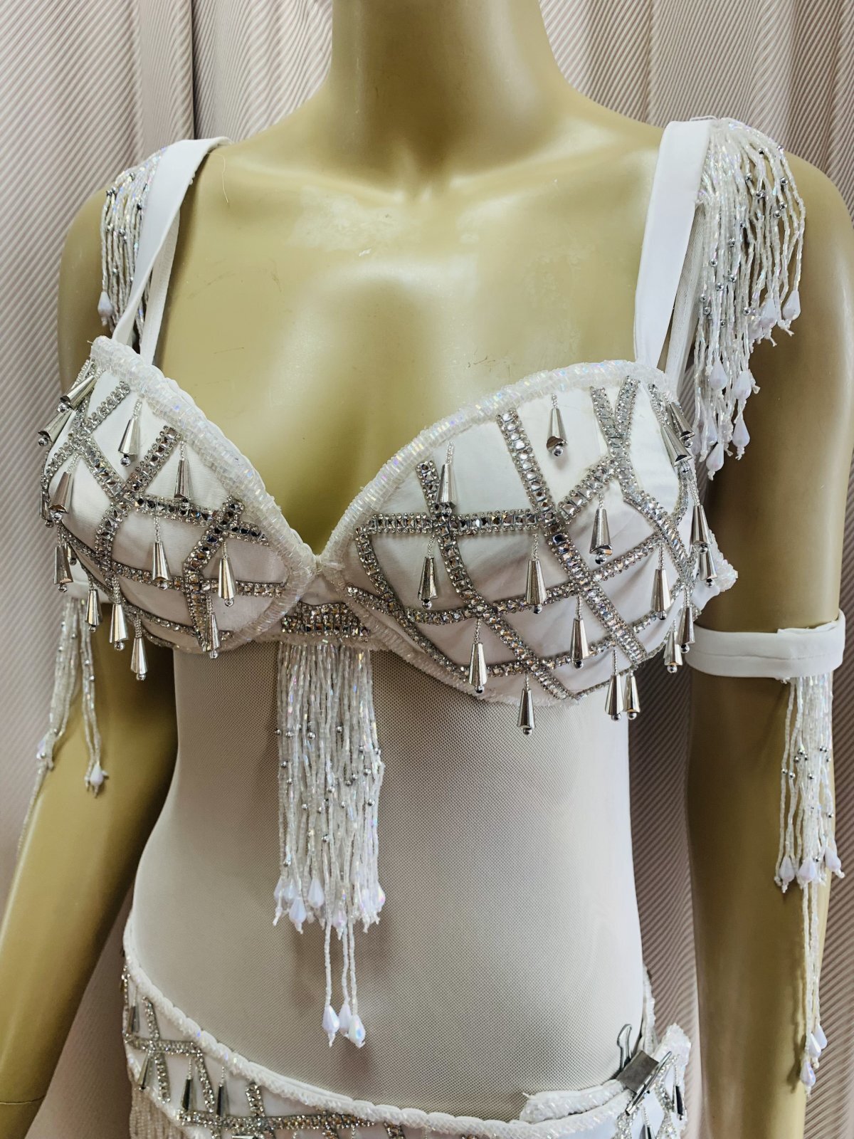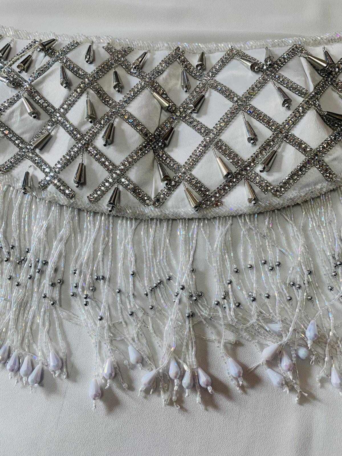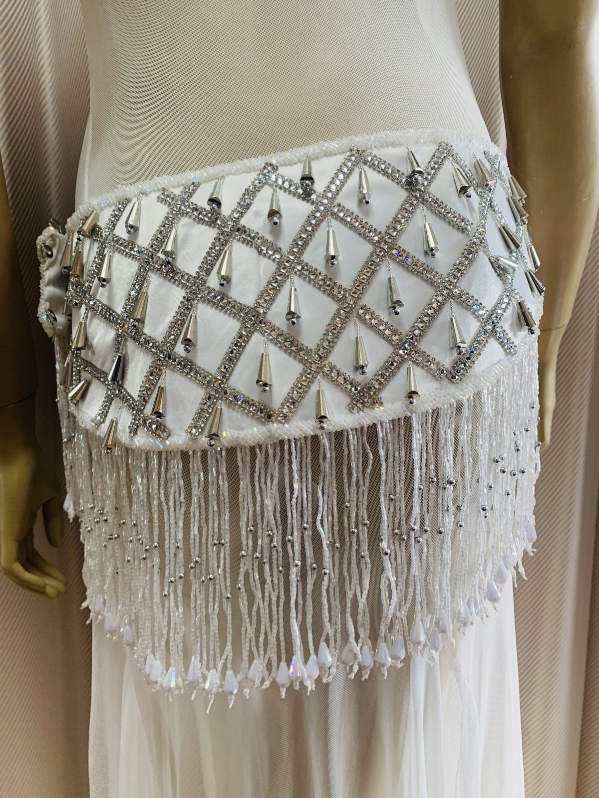 ハニーン特注!キュートなSoheir Zakiをイメージしたブラ&ベルトコスチュームをお作りしました。70-80年代の衣装にはビビットなカラーを取り入れた衣装がたくさん見られます。今回は鮮明で華やか、そしてクリスタルではなく、ビーズ装飾やシフォン素材を取り入れた素朴さと、お腹も隠せるボディネットいらずの便利なワンピース×ブラベルトの組み合わせで仕上がっております。 また、別売りのボリューミーなダブルシフォンスカートなどとコーディネートすればさらにフェミニンな雰囲気に!スカートを変更するだけで様々なコーデを楽しめるのがブラ&ベルト衣装の利点ですよね。ぜひ、いろんなスタイルに挑戦してみてくださいね サイズ等、お質問がありましたらお問い合わせフォームからご連絡ください! ■商品名:70-80's オルドスタイルブラベルトコスチューム■カラー:ホワイト■ブラカップ:M-L(約C〜Fカップ)パット入り※サイズはあくまでも目安になります■アンダーバスト:最長80cm■バスト正面(右脇から左脇までの長さ):約34cm■ベルト:最長約98cm■ワンピース丈:約140cm※フロント両サイドにスリット入り■付属品:シフォンベール、アーム、アンダーショーツ(ベージュ)■その他・ワンピースはパワーネットを使用しているため透けます。・シフォンのスカートは別売りになります