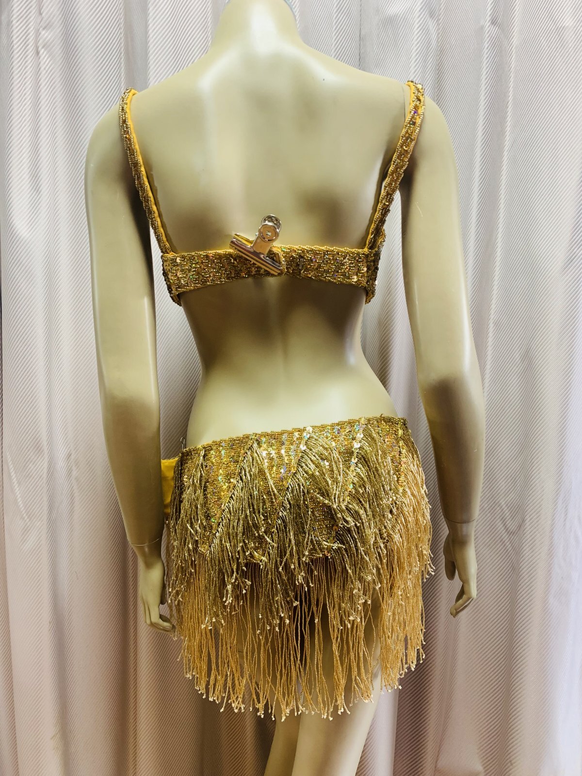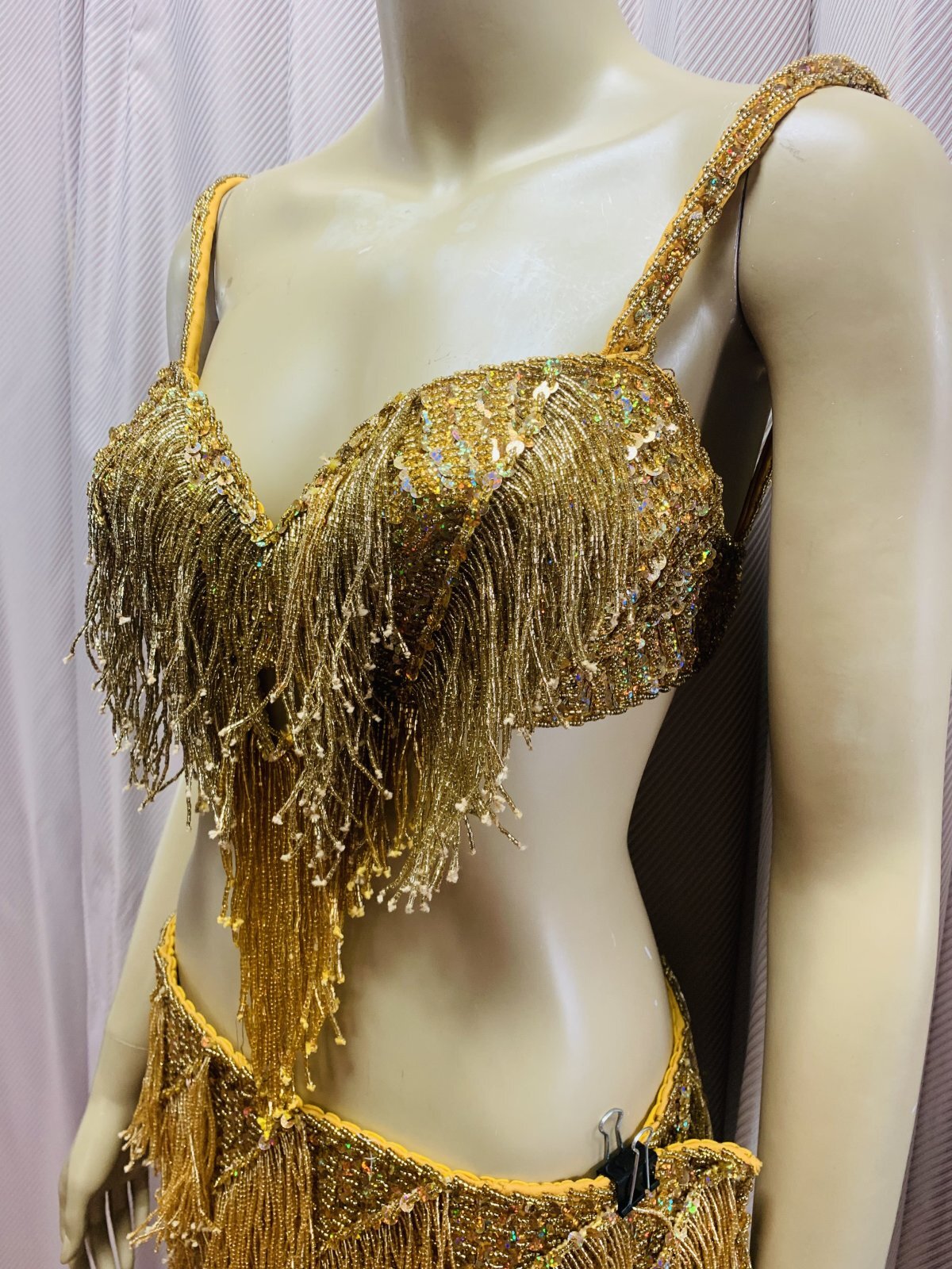 ゴールデンエラの時代を感じさせるビーズフリンジ付きのブラ&ベルト衣装。ブラベルトの便利なところは着回しができるということ!お好きなスカートと合わせてコーディネートしても良し!胸元の開いたサイーディドレスなどと合わせても良し!他にもサイーディのドレスのヒップにアクセントとしてベルトを使用するのもおすすめです昔はブラベルト衣装というと初心者向けのイメージがありましたが、オールドスタイルがお好きなプロの方にも人気があり、クラシカルな演出をしてくれるフリンジ衣装は昔と変わらず愛されている衣装です ■商品名:フリンジ付きブラベルトコスチューム■カラー:ゴールド■ブラカップ:M(約B〜Dカップ)※パットなし■アンダーバスト:最長80cm■バスト正面(右脇から左脇までの長さ):35cm■ベルト:約94cm■付属品:なし■その他・スカートは別売りとなります