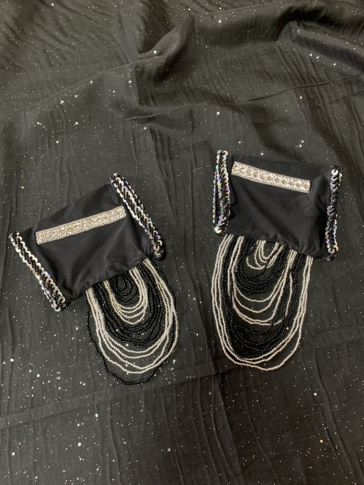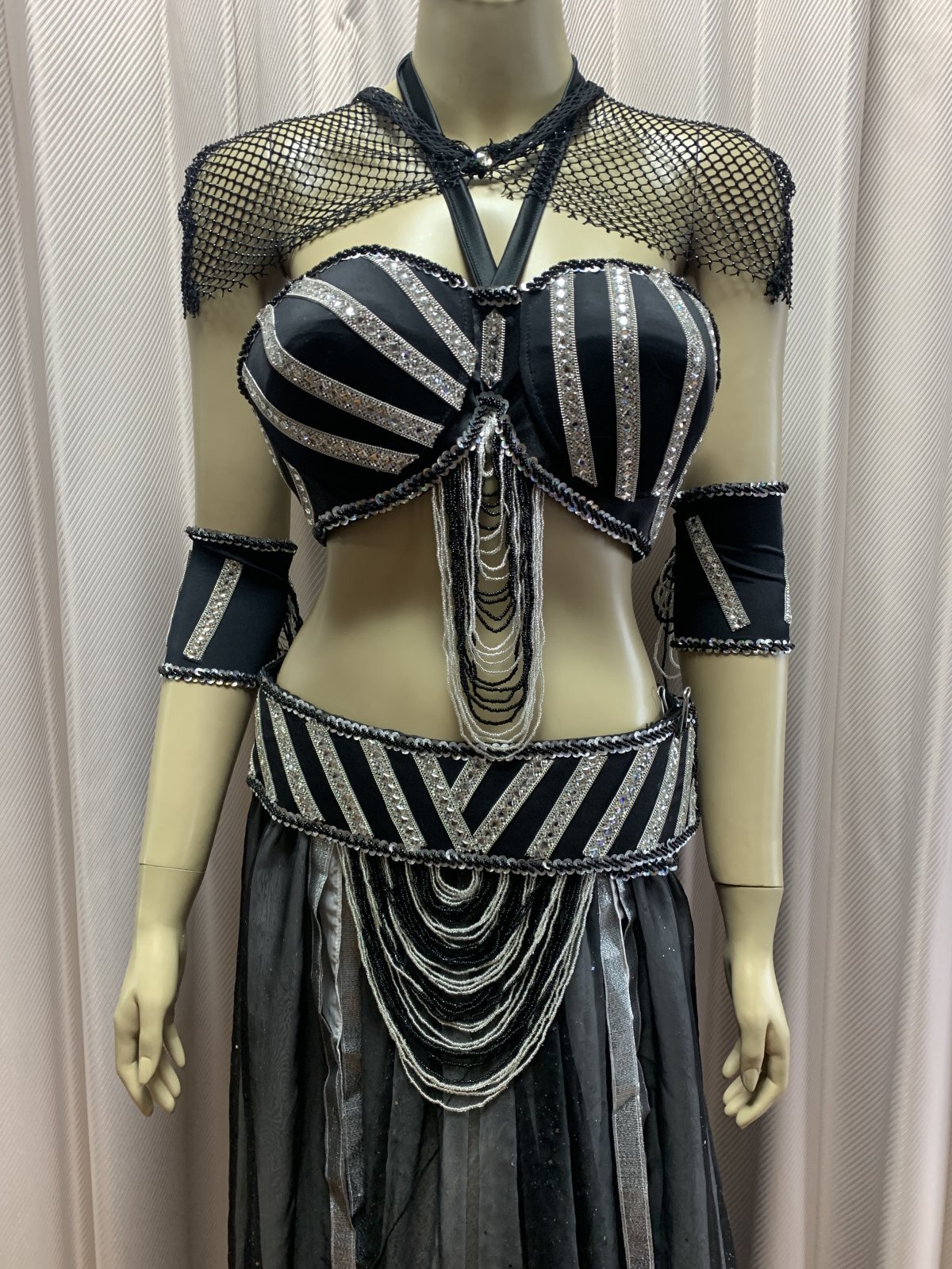 ハニーン特注!Tahia Kariokaをイメージしてお作りしたゴールデンエラスタイルコスチューム。ブラはホルターネックのお作りですので、ご自分のサイズに合わせて調整は必要になってきます。スカートは薄手のシフォン素材を使用したこだわりの二枚構造に。スリット部分にはラインを協調できるテープの縁取りも施しました。 また、お手持ちのシフォンスカートやハーレムパンツ等と合わせて違ったスタイルに仕上げるのも◎!スカートと同じ生地のシフォンベールも付属されておりますので、ヘッドベールとして使用してもゴールデンエラの世界を創り出すことができますよ。ぜひ、いろんなスタイルに挑戦してみてくださいね サイズ等、お質問がありましたらお問い合わせフォームからご連絡ください! ■商品名:Tahia Kariokaスタイル ゴールデンエラコスチューム■カラー:ブラック×シルバー■ブラカップ:M-L(約C〜Fカップ)パット入り※サイズはあくまでも目安になりますホルターネックですので体にフィットするようお直しが必要になってきます■アンダーバスト:最長95cm■バスト正面(右脇から左脇までの長さ):約36cm■ベルト:最長約98cm■スカート丈:約100cm※フロント両サイドにスリット入り■付属品:シフォンベール、アーム2つ、ショルダーケープ■その他・ショルダーケープも付属されますが、こちらはショルダーにフィットする作りになっているため踊りの際は手をあげるとずれてしまいます。あくまでも写真撮影時などの飾りとしてご利用ください