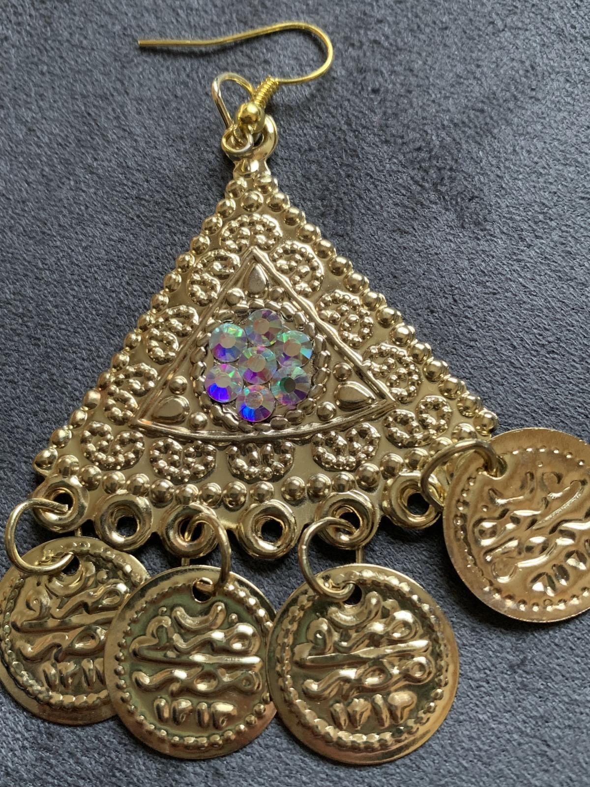 バラディ、ガワージー、サイーディなどにおすすめのフォークロアピアス。ラインストーンがついているのでモダンなドレスにも合わせやすい!ピアスホールでなくても、ヘッドバンドに縫い付けてこめかみあたりから垂らしてご使用いただくのも◎! ■ラインストーン付きフォークロアピアス■サイズ・長さ:約8cm(吊り下げたときの長さ)・横幅:5cm■カラー:ゴールド■その他・金属アレルギーの方はご注意ください