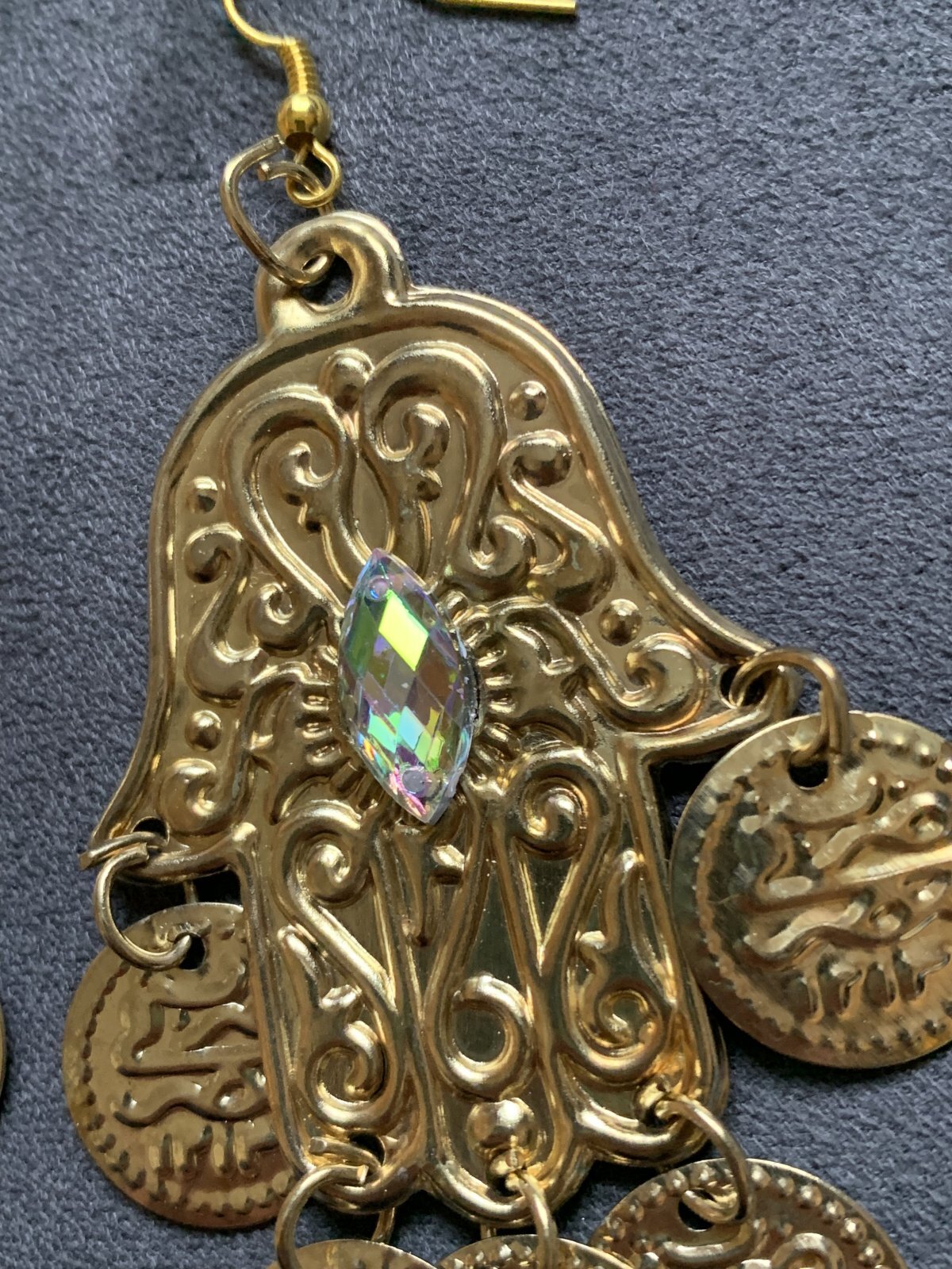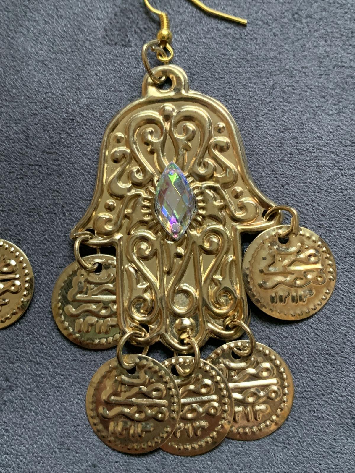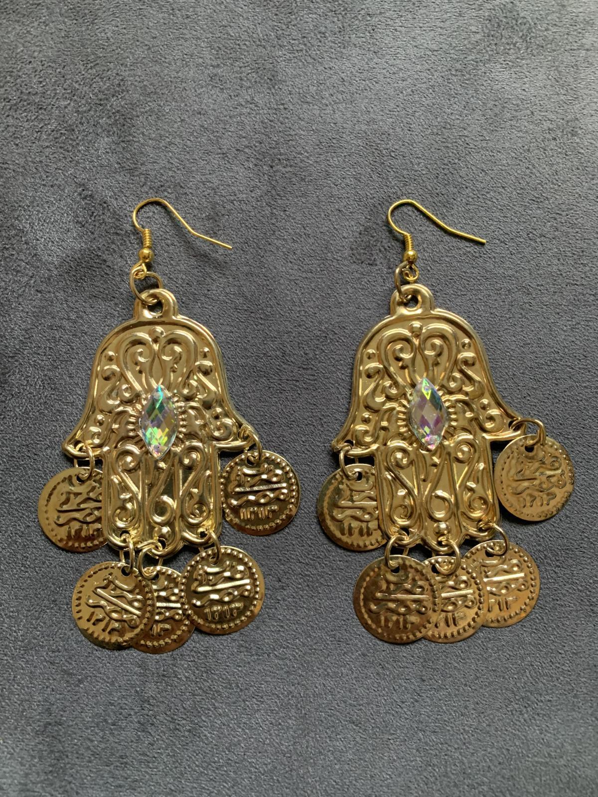バラディ、ガワージー、サイーディなどにおすすめのフォークロアピアス。ラインストーンがついているのでモダンなドレスにも合わせやすい!ピアスホールでなくても、ヘッドバンドに縫い付けてこめかみあたりから垂らしてご使用いただくのも◎! ■ラインストーン付きフォークロアピアス■サイズ・長さ:約9cm(吊り下げたときの長さ)・横幅:4cm■カラー:ゴールド■その他・金属アレルギーの方はご注意ください