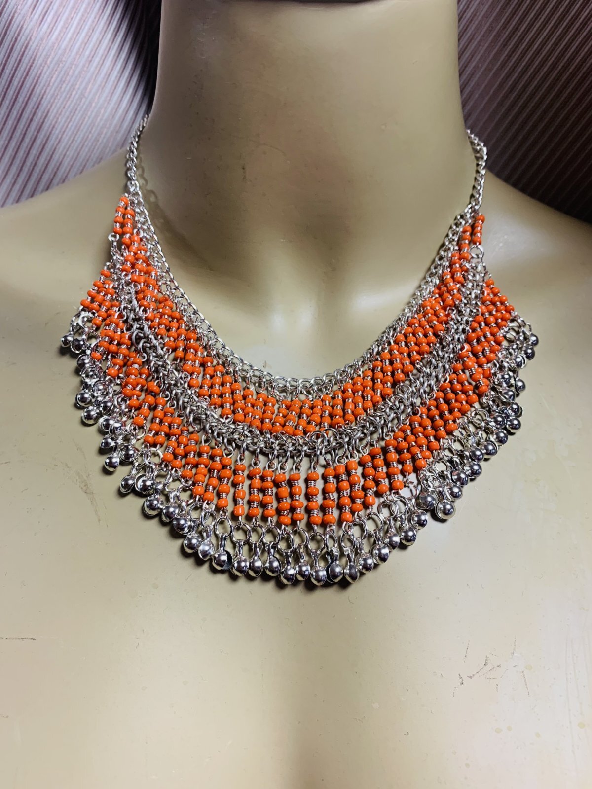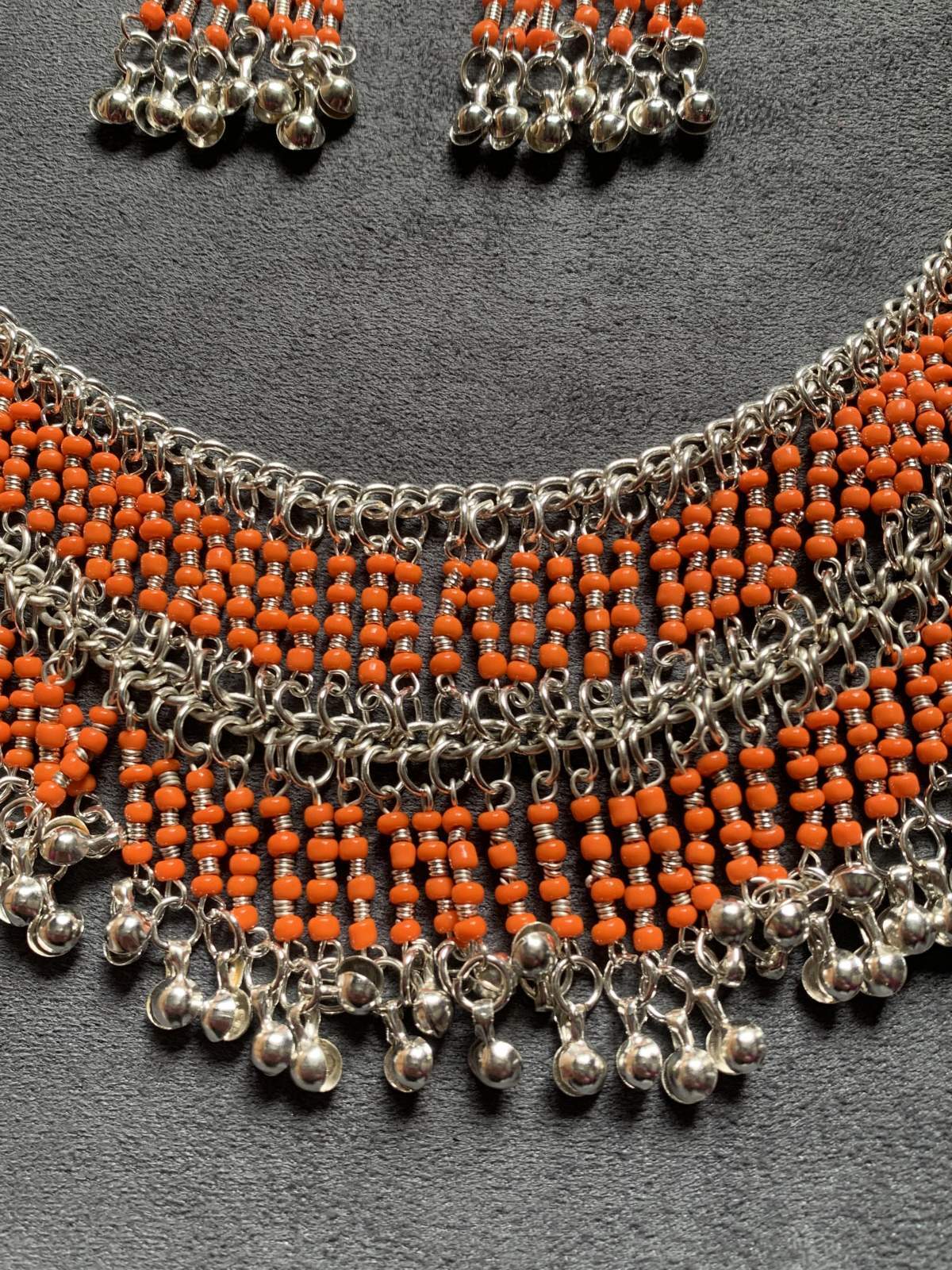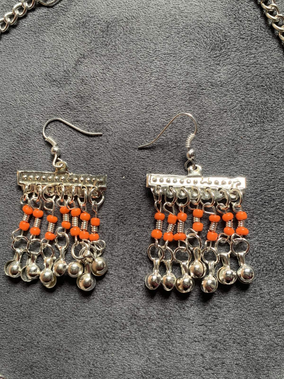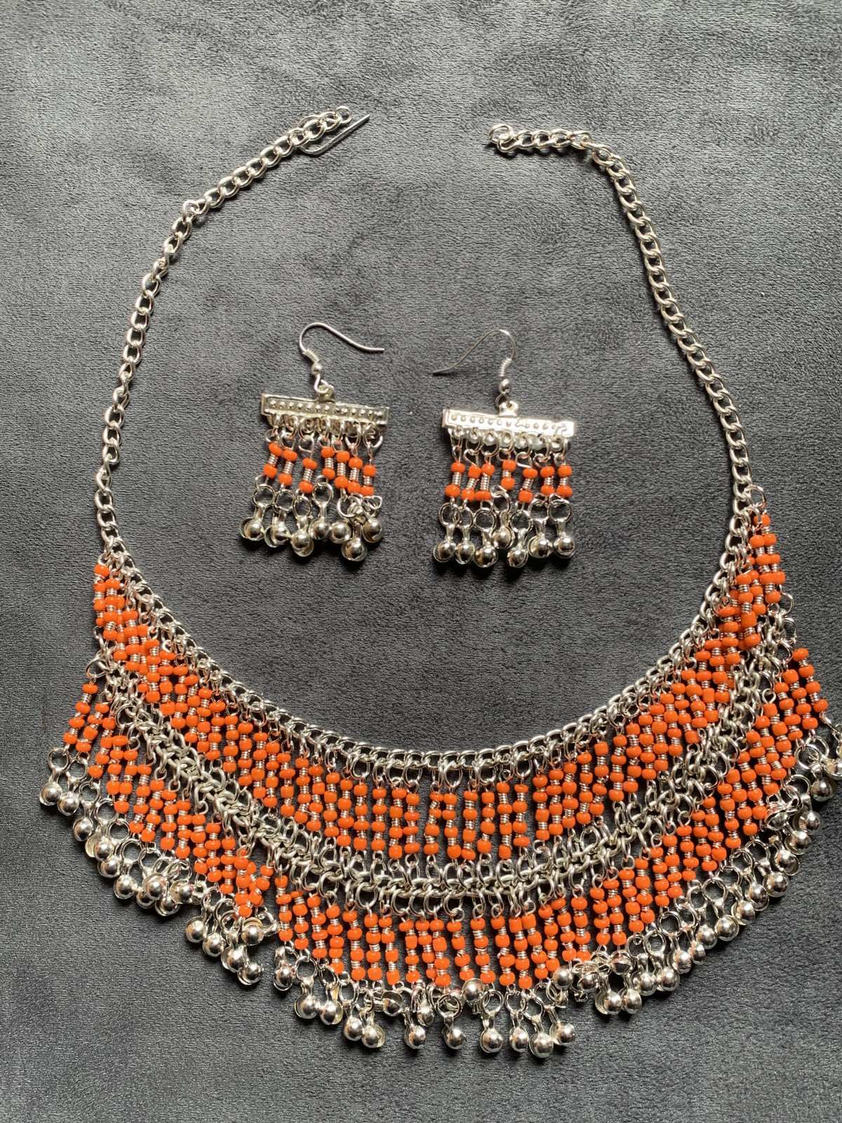 古代エジプトのファラオが着用していた装飾品のような。。そんな雰囲気のあるネックレスとピアスのアクセサリーセット。こちらは1点ものになります。ファラオニックのコスチュームにプラスする他、オリエンタル衣装にプラスして少しクラシックな印象にしてみたり、定番のコインアクセサリーからワンランクアップで繊細なアクセサリーに挑戦したい方におすすめ!! ■ファラオニックネックレス&ピアスセット■サイズ・チェーンの長さ:約43cm■カラー:シルバー×オレンジ■その他・金属アレルギーの方はご注意ください