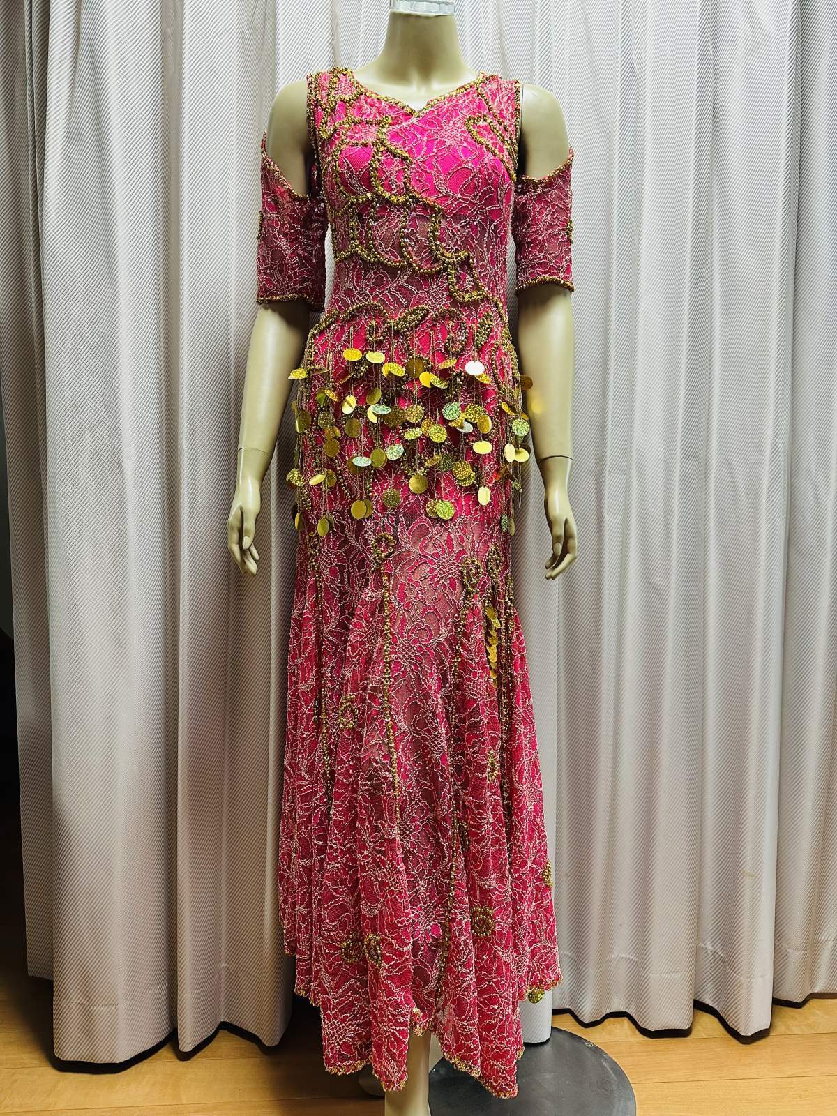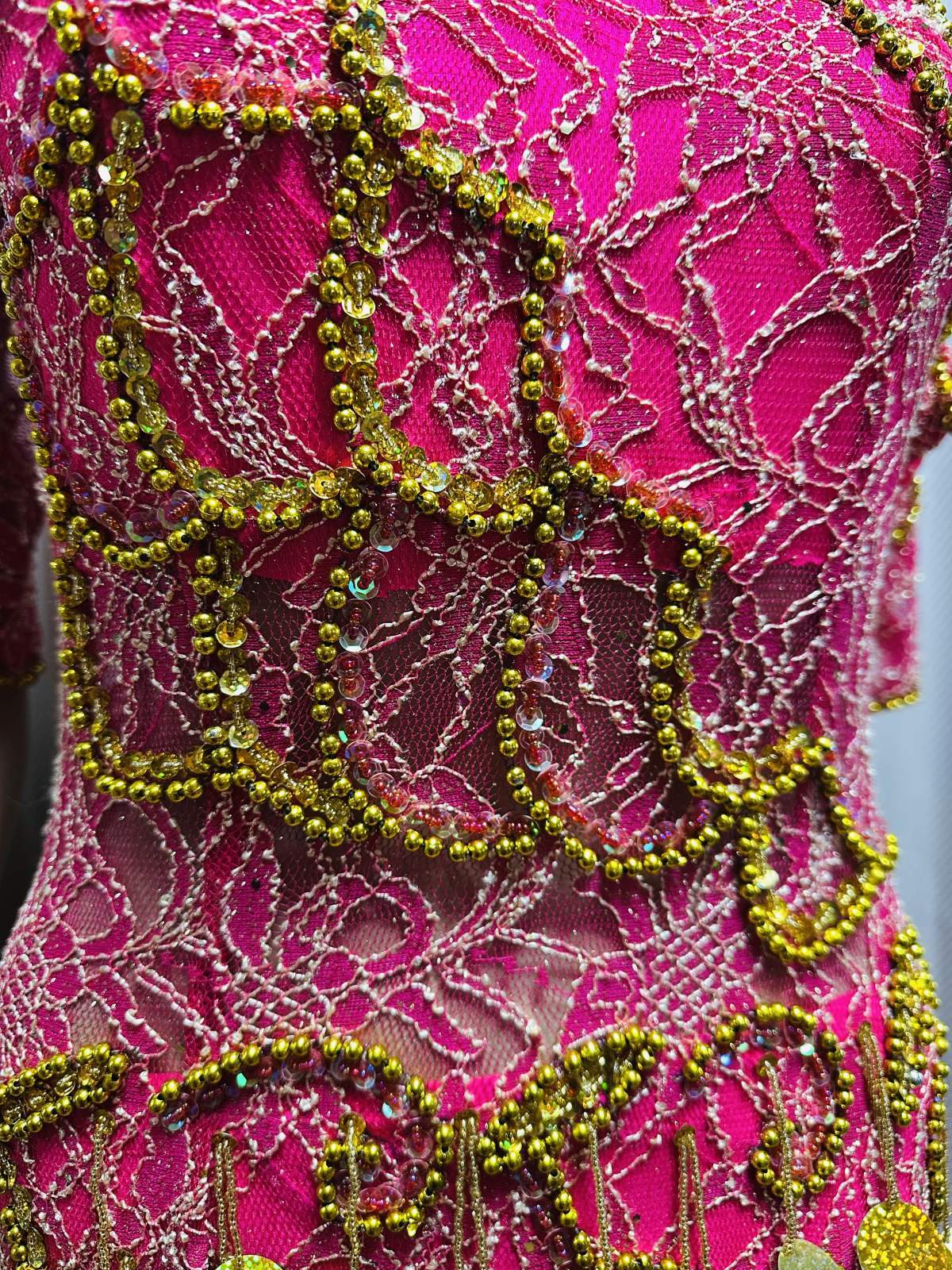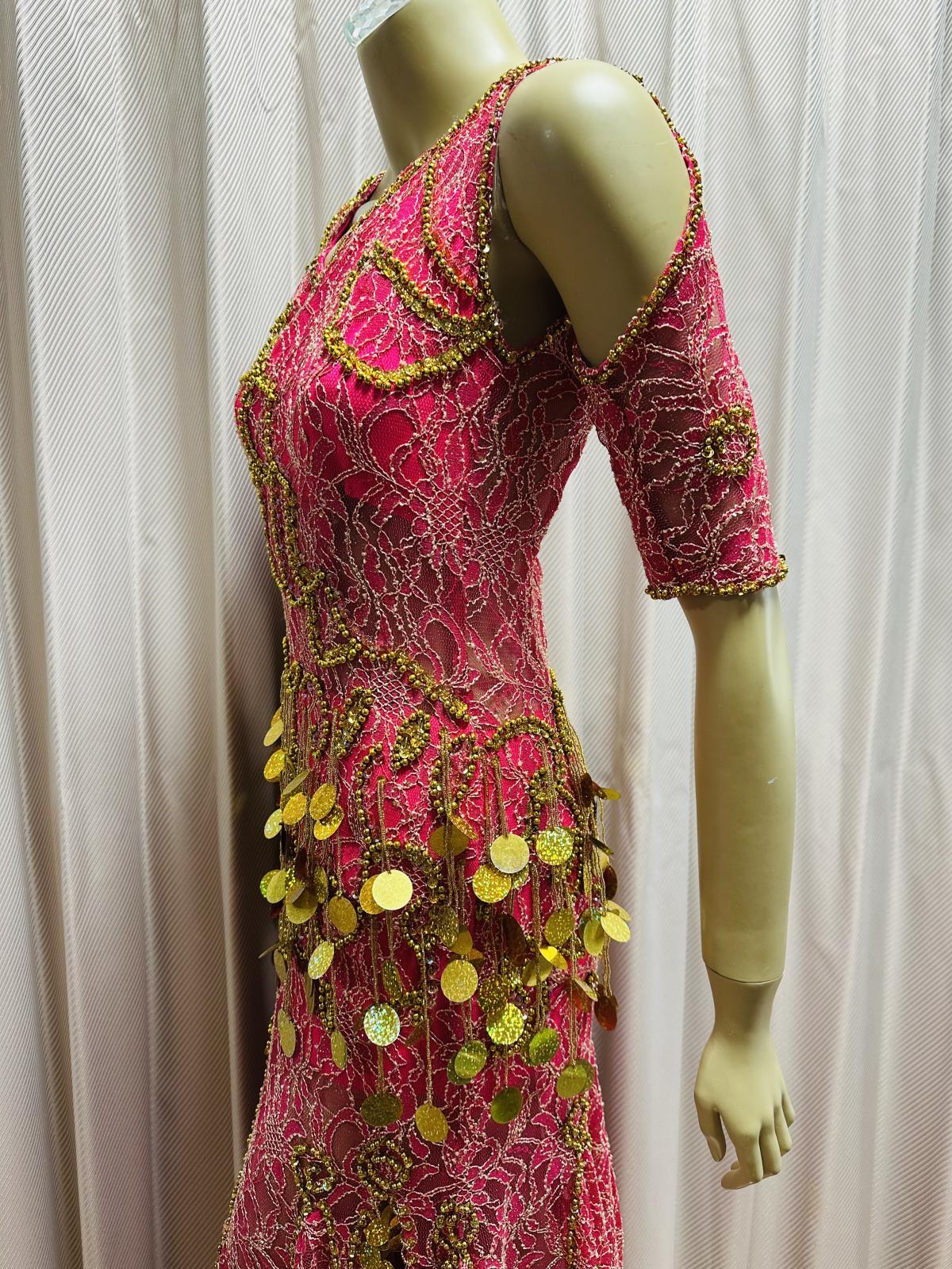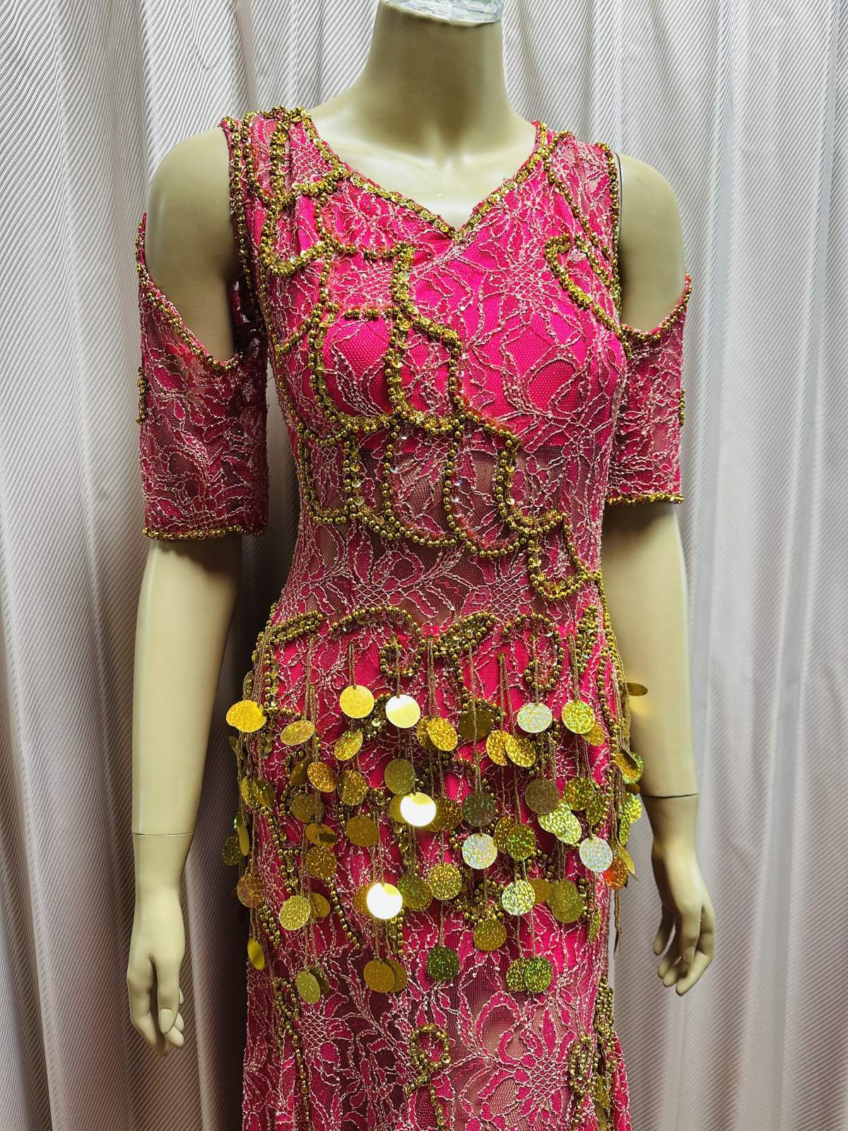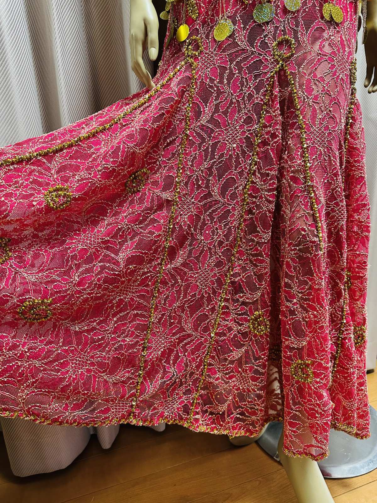 オリエンタル、バラディ、アワーリム等でお使いいただける装飾たっぷりのお袖付きレースワンピースドレス。近頃はハンドメイドで1点1点ビーズやスパンコールを装飾するドレスが減っていますが、こちらはお針子さんの手でひとつひとつ生地に装飾が施されていますのでクオリティがとてもよいのがおすすめポイントです。スカートはボリュームがありますのでターンをすると美しく広がります。 ※こちら4点からオーダー可能です納品までにお時間いただきますが、エジプトからの発送商品と同梱可能な場合は1点からでもお受けできる場合がございますのでお問い合わせくださいませ ■商品名:アワーレム&バラディ お袖付きレースワンピースドレス ■カラーカラー:ピンク(スパンコール:ゴールド)■ドレスのサイズ・丈:約135cm・バスト:90cm前後※生地に多少の伸縮がございます・ウエスト:70cm前後・ヒップ:90cm前後■その他・バスト周辺は透けないよう同色系の生地が重なっています・バックはファスナーで開閉できます