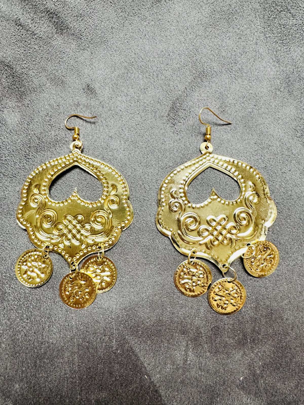 オリエンタルモチーフのコイン付きピアスオールドスタイルの衣装にもぴったりなデザインです ■オリエンタルモチーフピアス■サイズ・長さ:約9.5cm(吊り下げたときの長さ)・横幅:5.5cm■カラー:ゴールド■その他・金属アレルギーの方はご注意ください