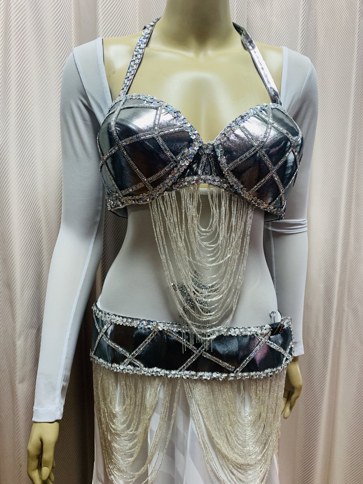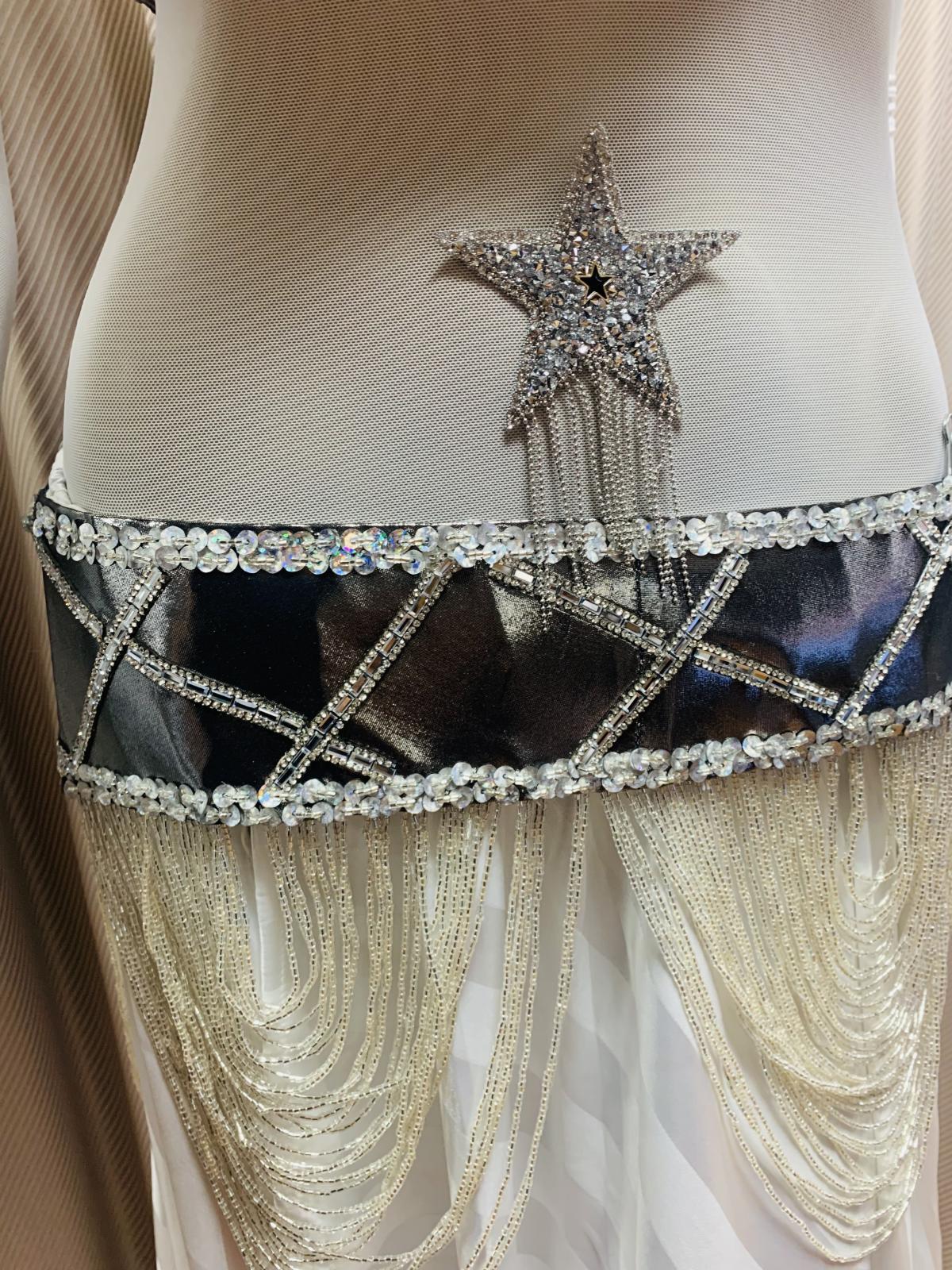 ビーズのドレープやアクセサリー、装飾などでおへそを隠す