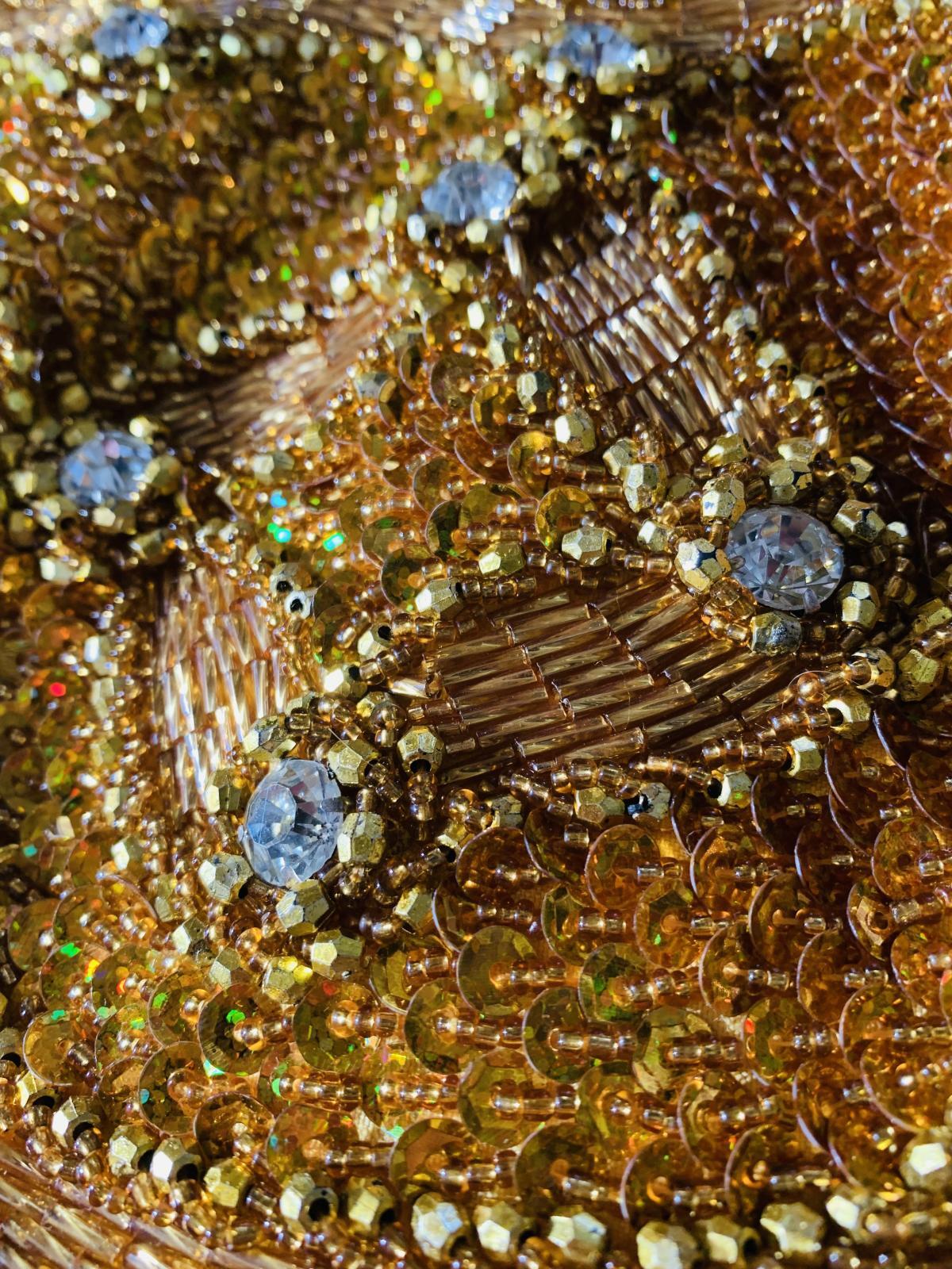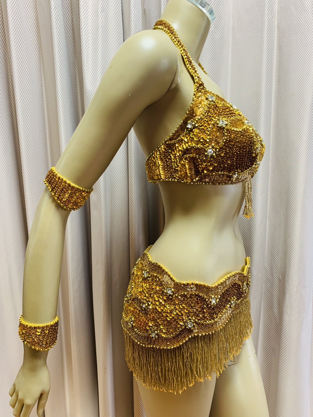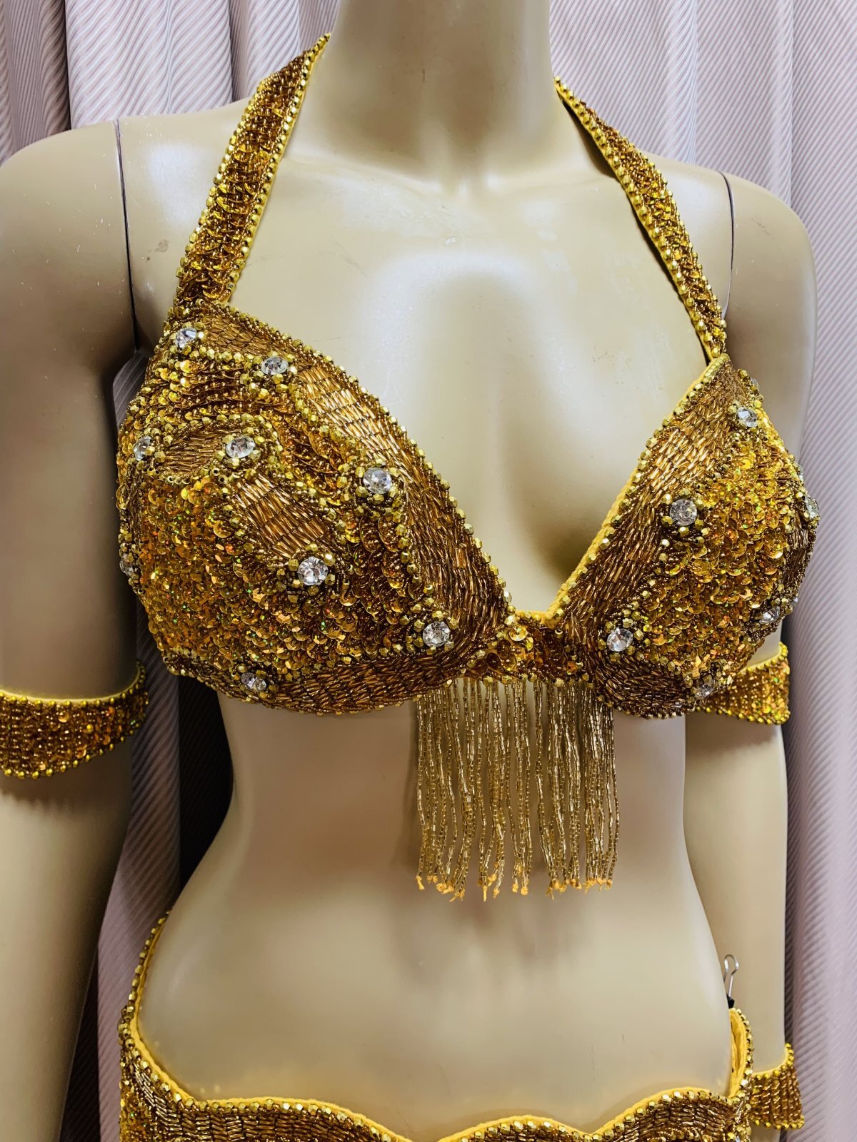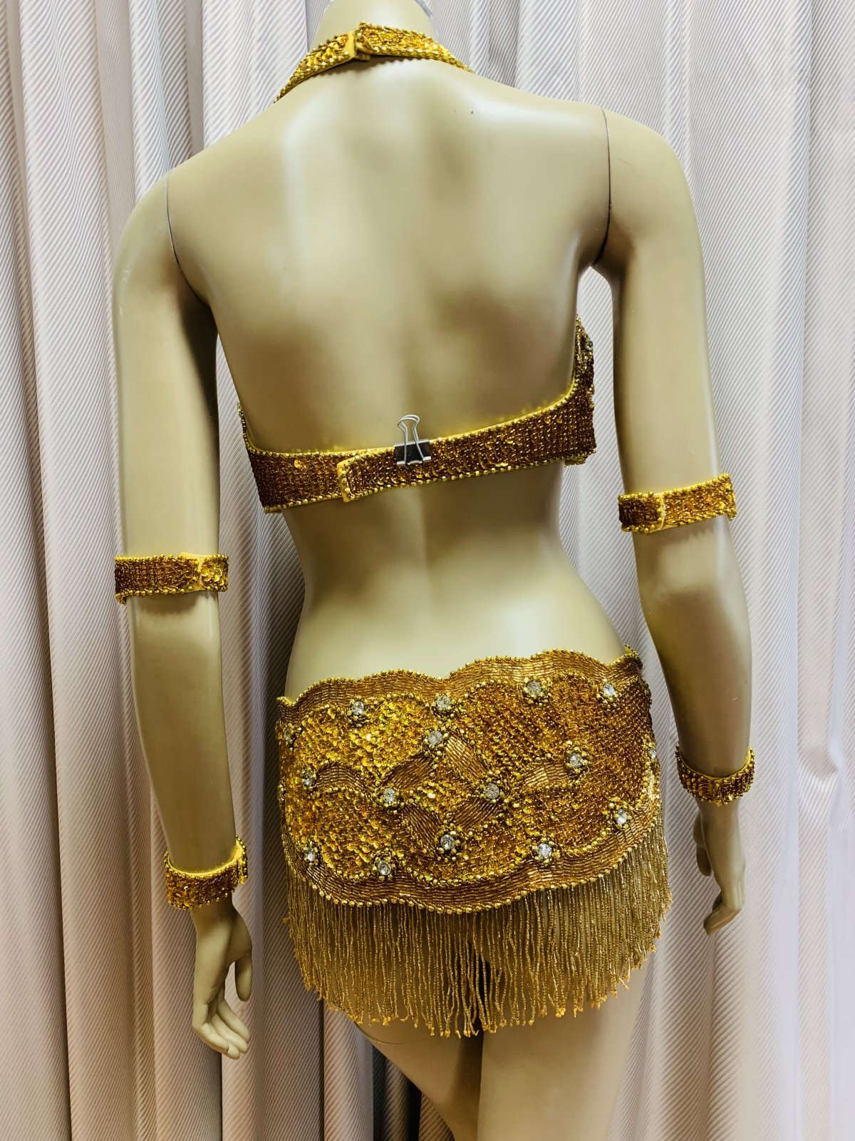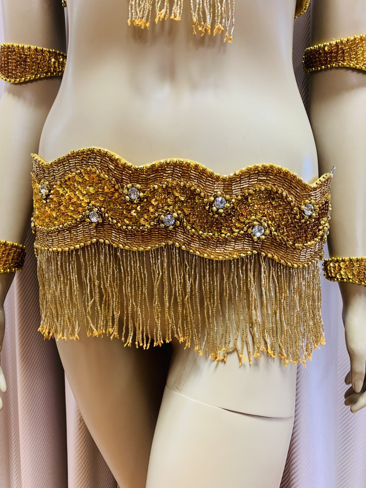 ゴールデンエラの時代を感じさせるビーズフリンジ付きのブラ&ベルト衣装。