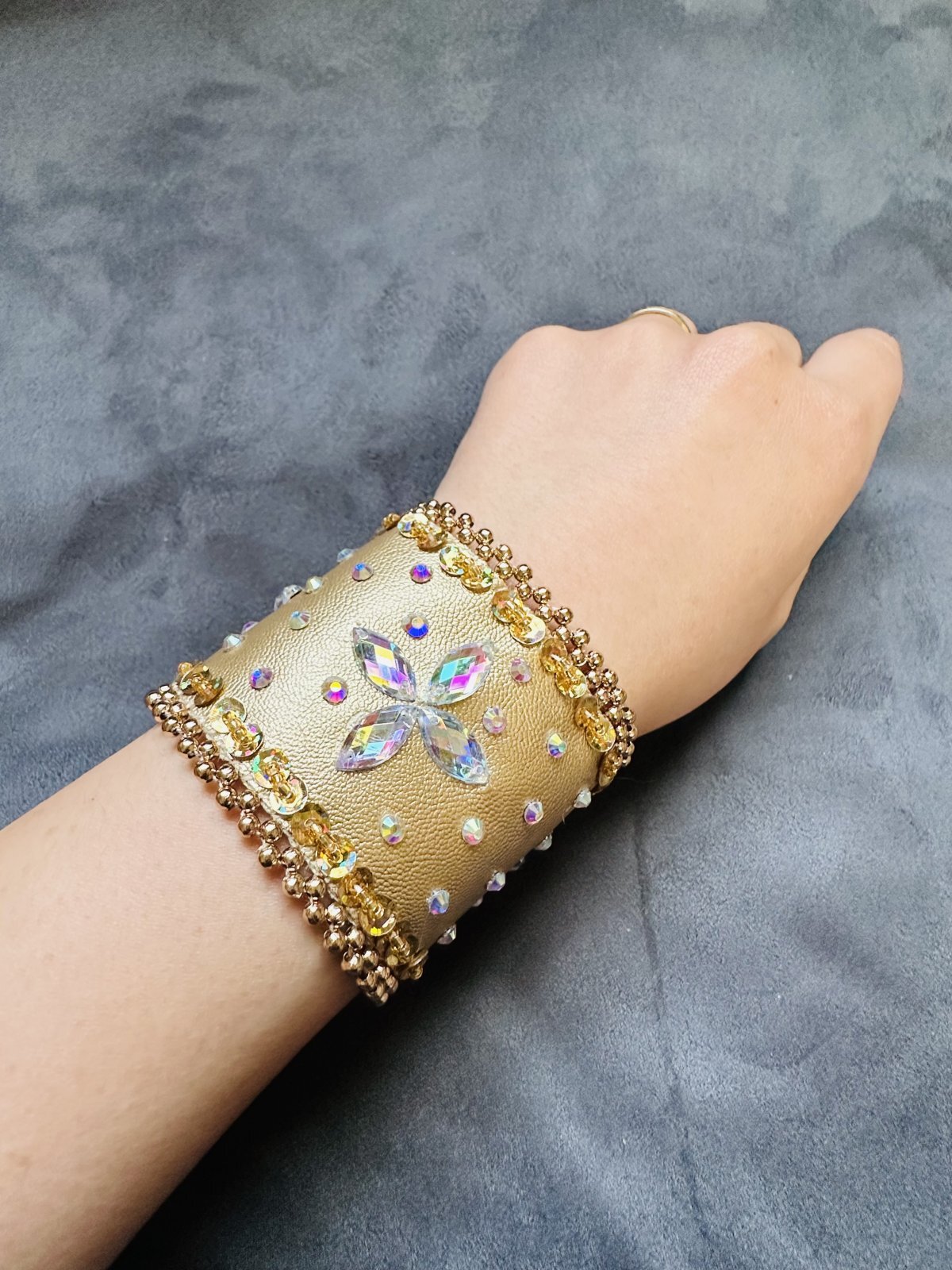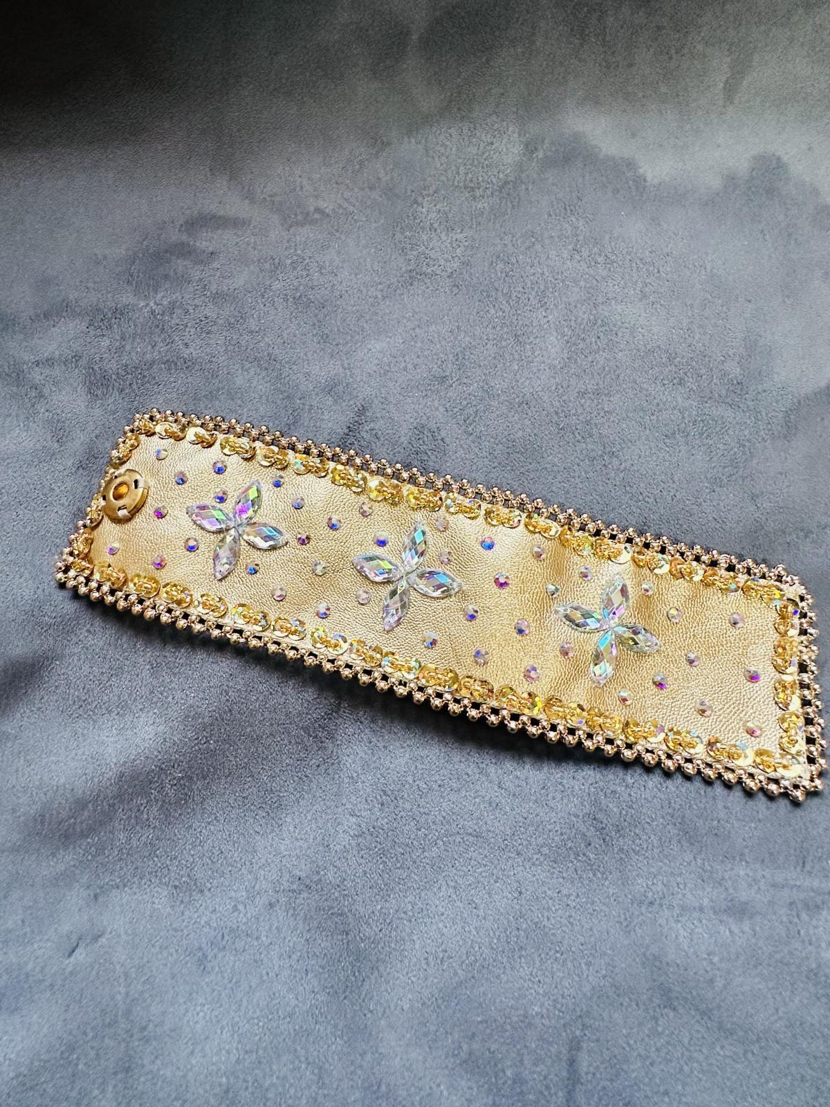 手首まわりにつけてご利用いただけるフェイクレザーの装飾バンド。